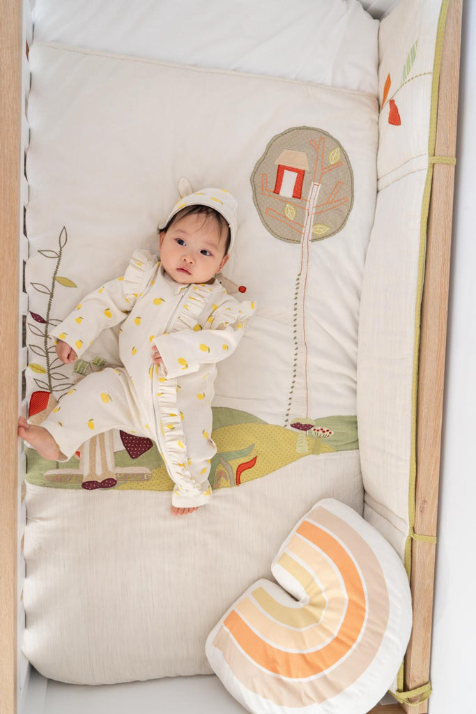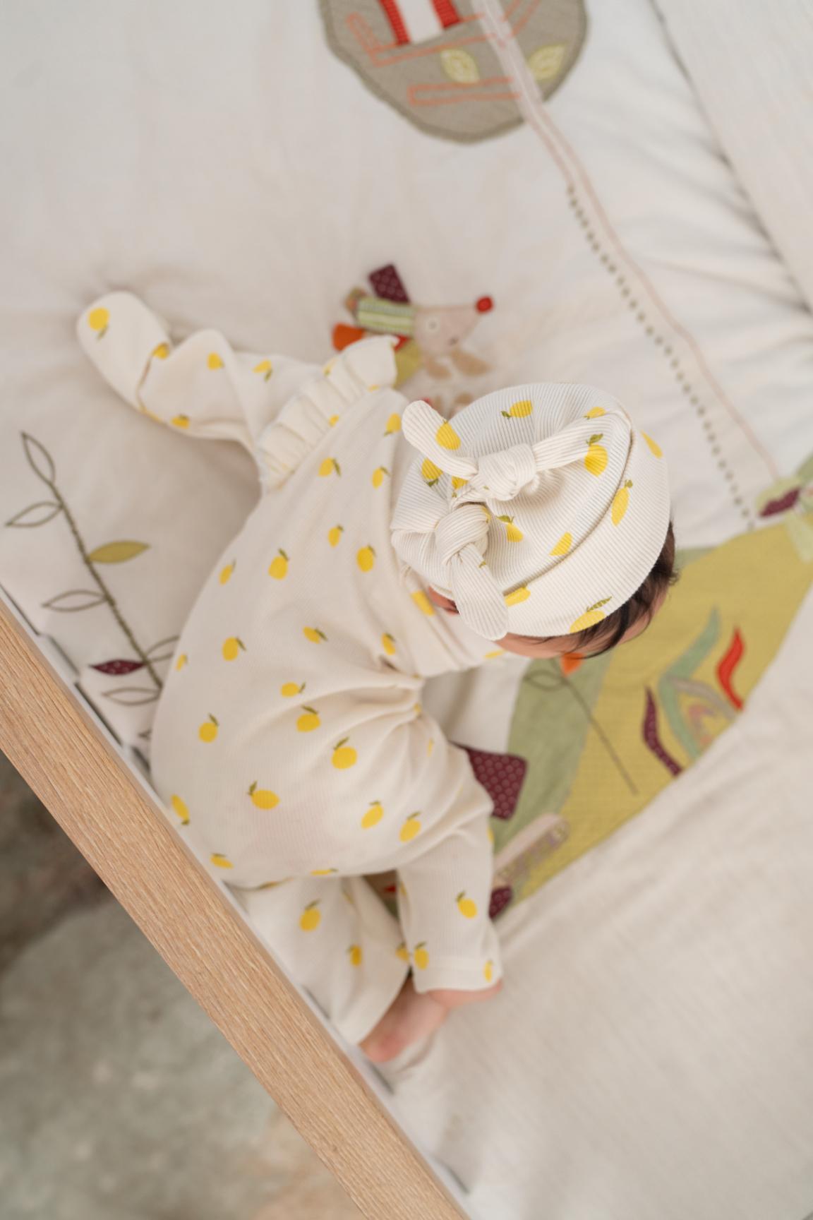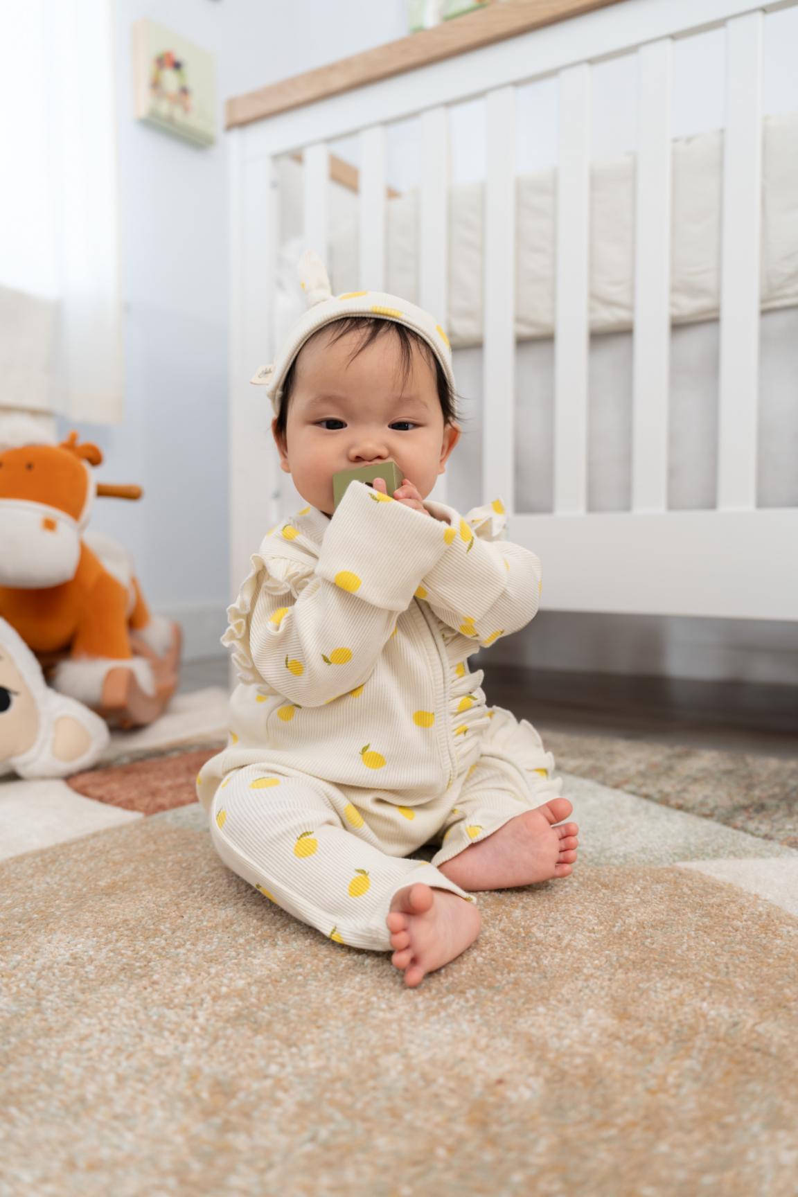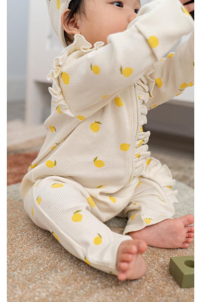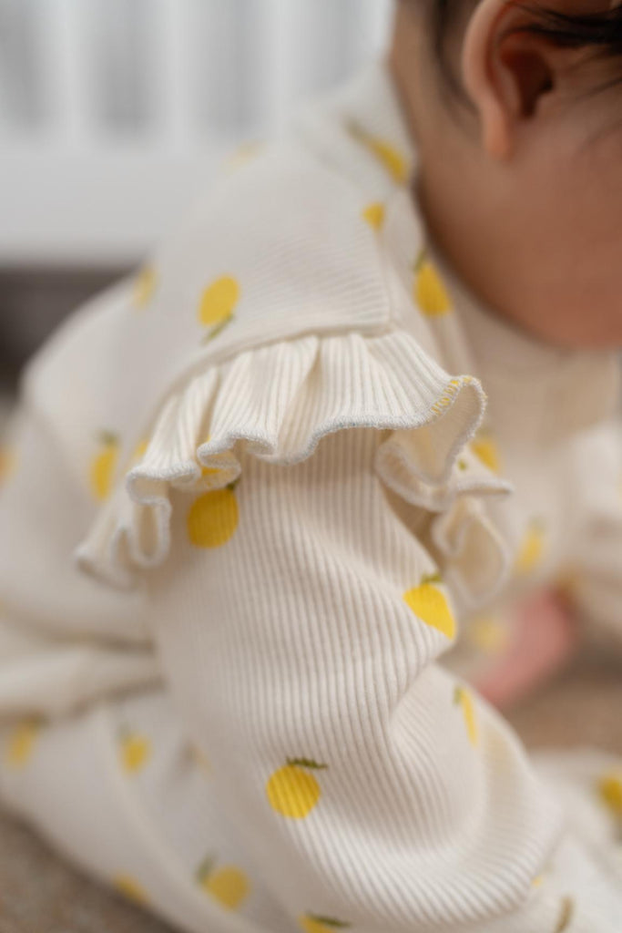 Made from soft, breathable 2x1 rib fabric, this set features playful lemon print with charming frill and collar details. Our Fruit Romper — featuring cheerful lemon print that bring a fresh pop of charm to your baby’s wardrobe. Crafted from soft, breathable 2x1 rib fabric, this romper offer gentle stretch for a perfect fit while ensuring your baby’s skin stays cool and comfortable all day.
