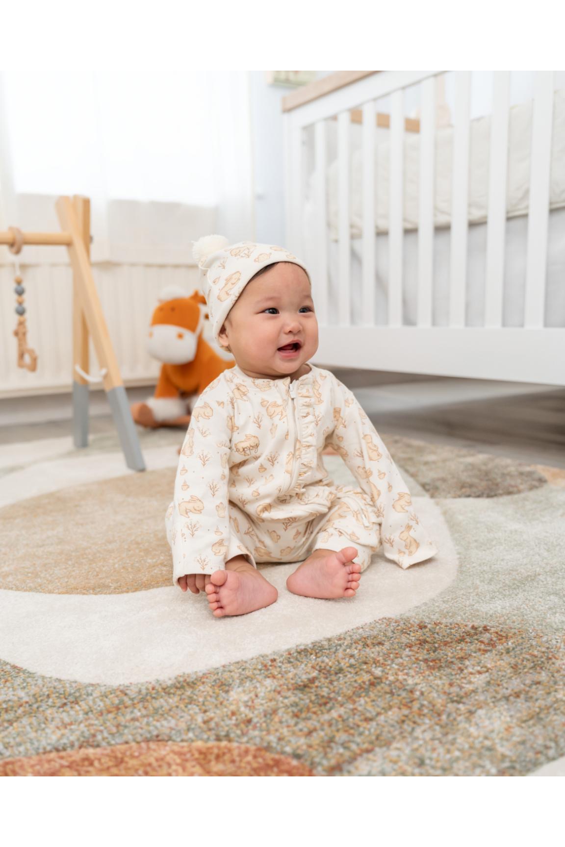 Crafted from interlock fabric, this adorable features a rabbit-print romper with frill detailing. Soft, breathable, and gentle on delicate skin, these rompers offer comfort, charm, and ease for everyday wear.