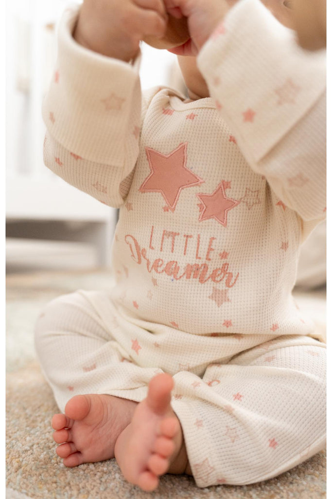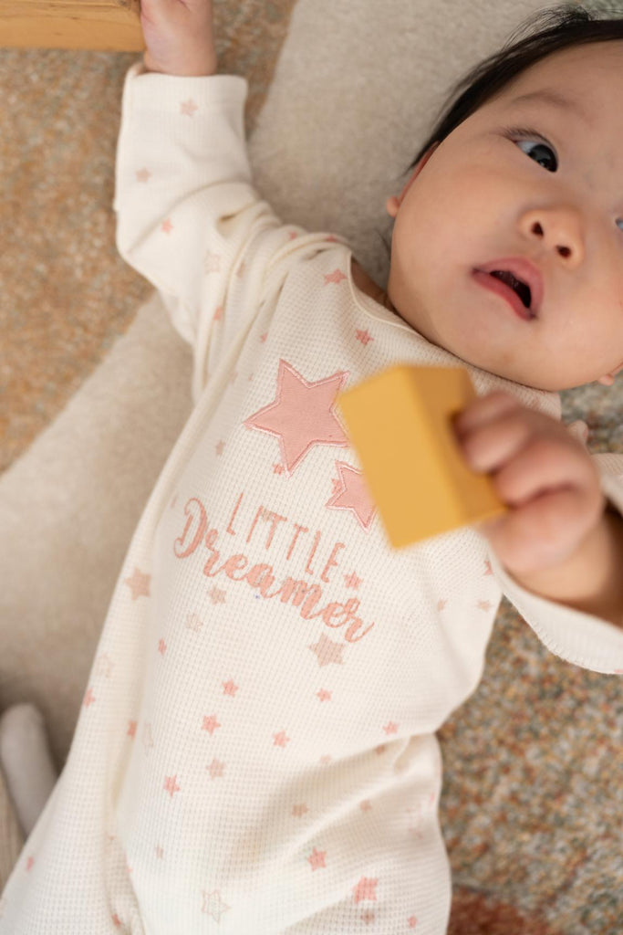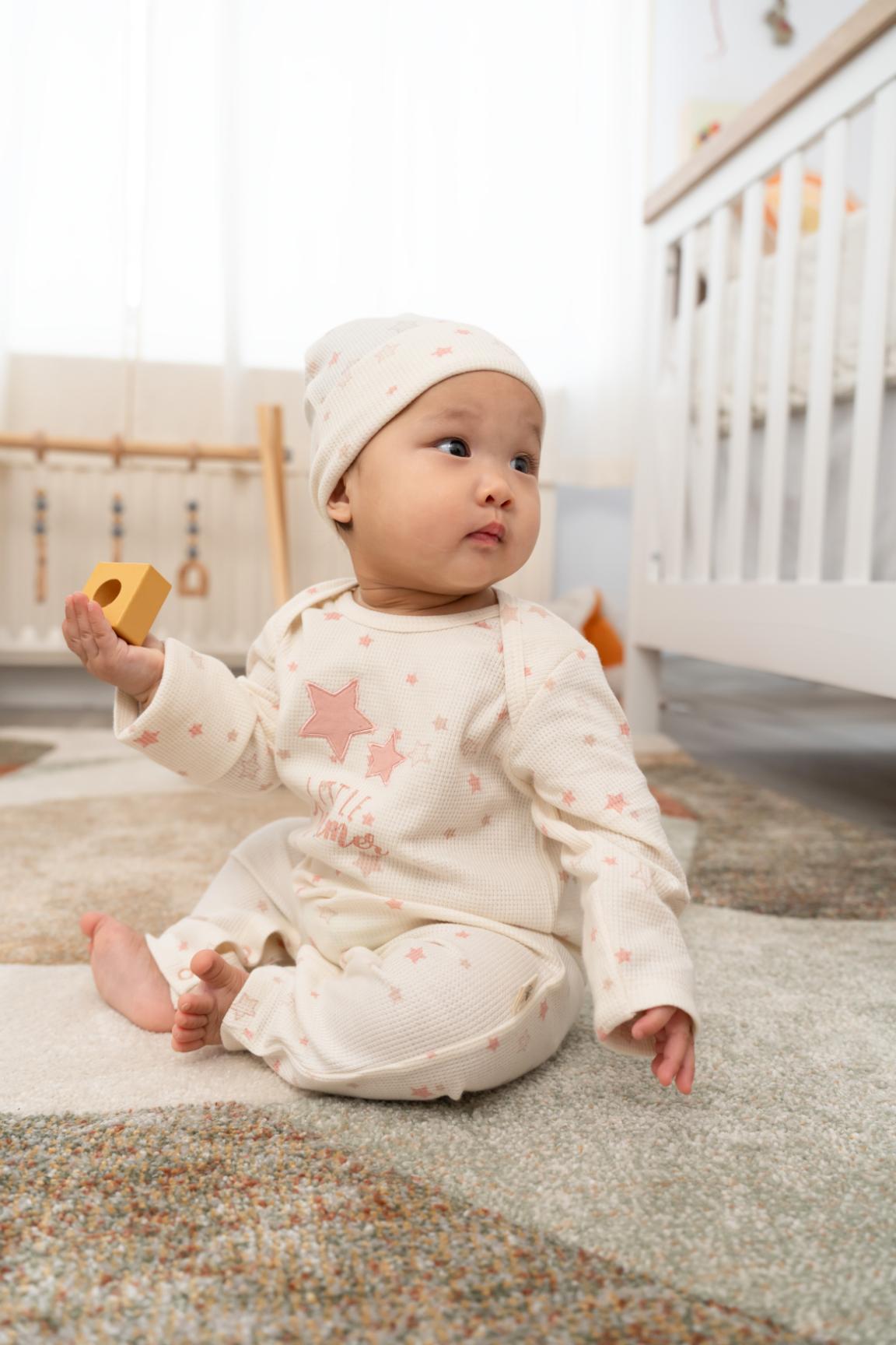 Our Star Romper, crafted in our new knitted waffle weave — a beautifully textured design that mimics delicate mini boxes for a unique and charming look. Made from soft, breathable fabric, this romper keep your little one comfortable all day long, allowing their skin to breathe while providing a gentle touch against the body. The intricate detailing adds a refined elegance, making each piece as special as the moments you’ll share in them.