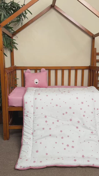 Featuring a charming sheep print comforter paired with a plush sherpa sheep face pillow, this cot set adds a sweet, cozy touch to your baby’s nursery. Crafted from soft, breathable, and baby-safe fabrics, the comforter provides gentle warmth while remaining lightweight and comfortable for everyday use. The sherpa cushion offers a soft, fluffy texture, making it both comforting and visually delightful.