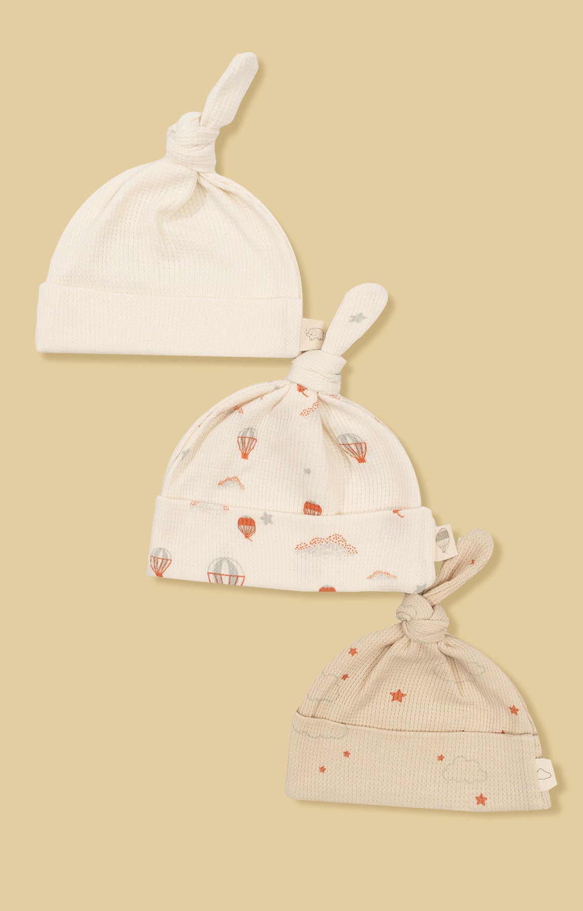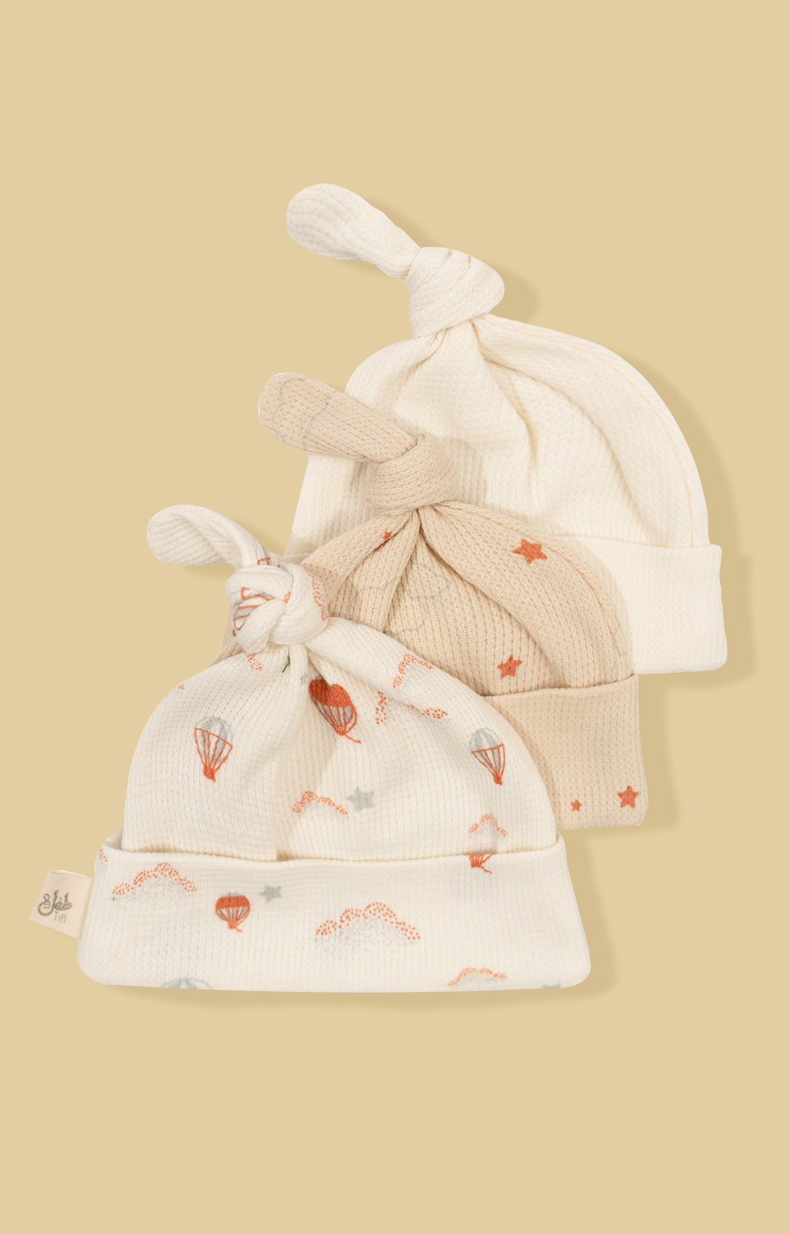 A minimal set with cutest prints. Our favourite waffle weave and a cute single knotted cap design. 🤎