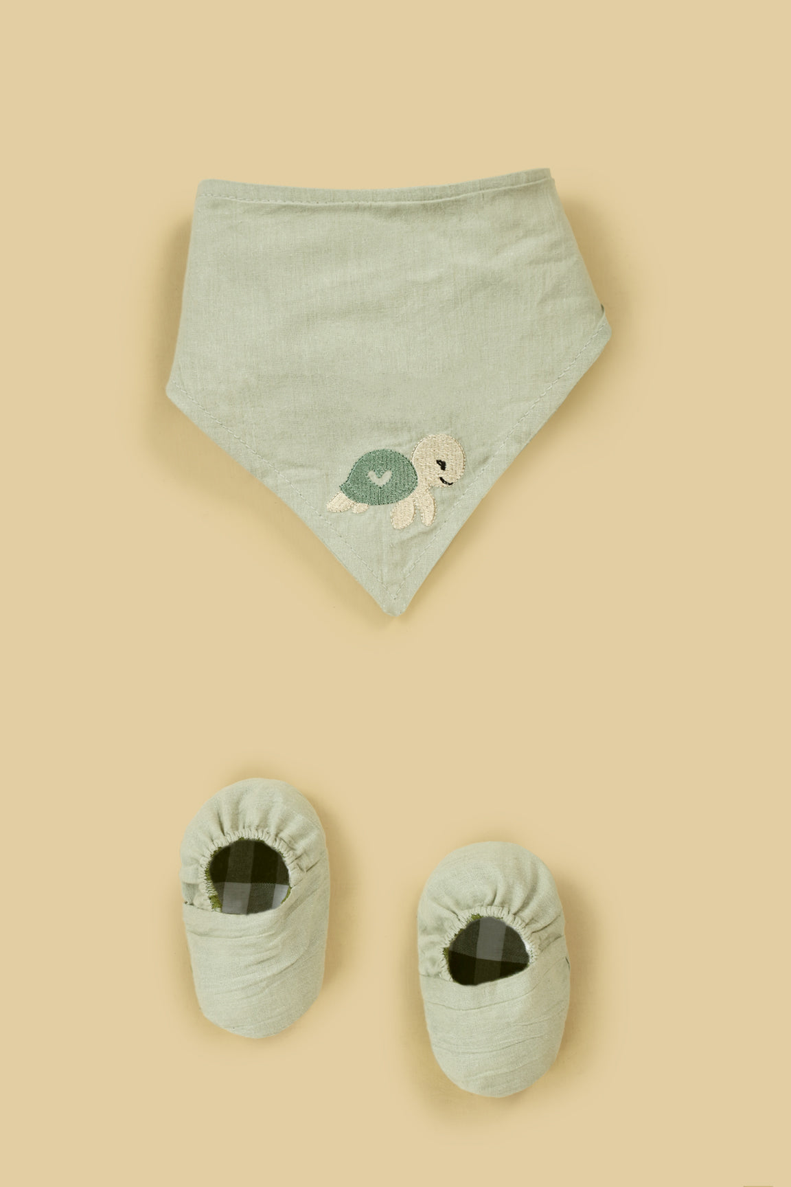 Turtle Embroidered Muslin Baby Gift Set (Shoes & Bib)