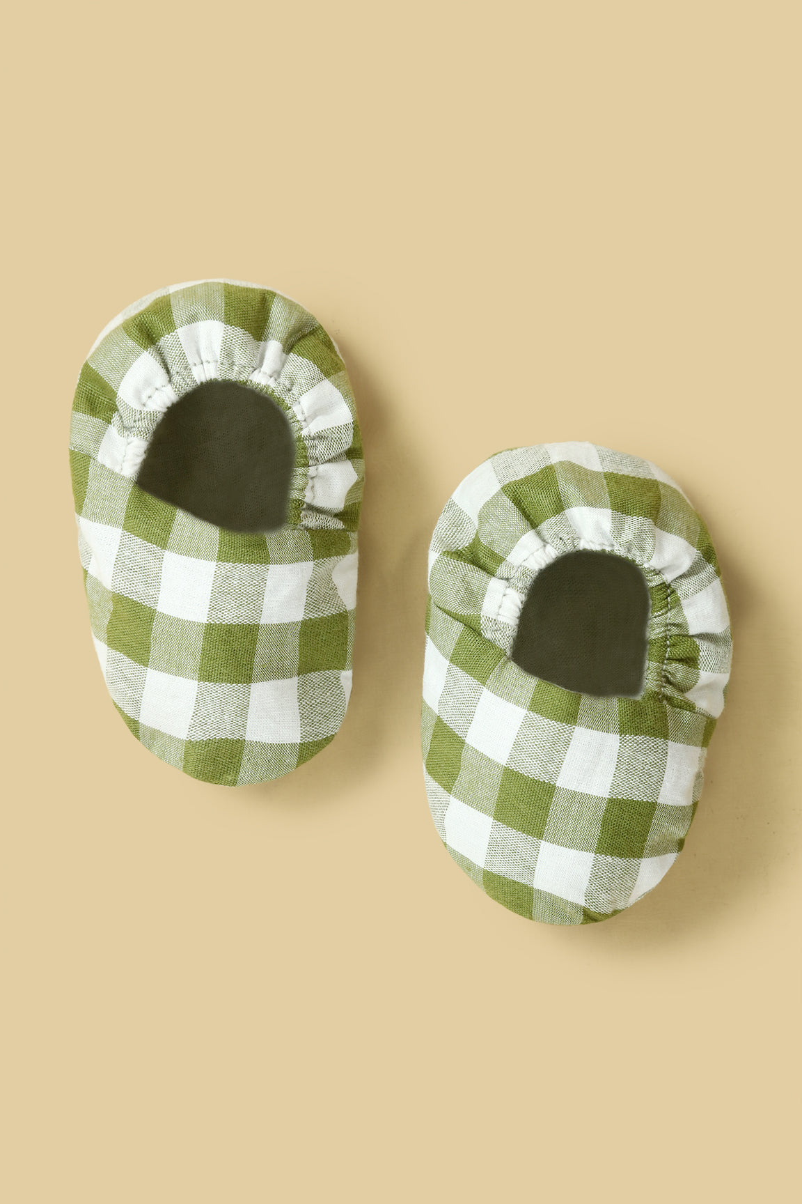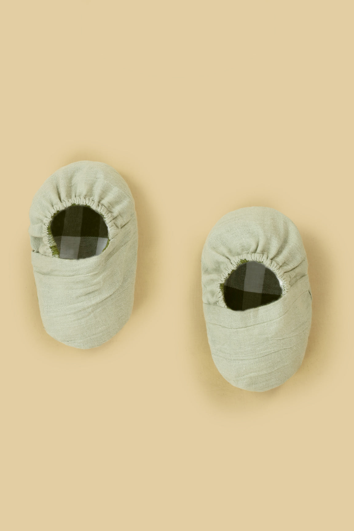 This charming baby accessory set is crafted from premium soft muslin fabric in a pistachio shade. The set includes a muslin bib, and a pair of matching soft-sole shoes all perfectly coordinated for a stylish newborn look. Perfect for daily wear, gifting, special events, or newborn photo-shoots, this set brings together comfort, softness, and adorable style.