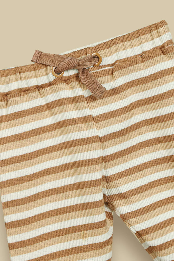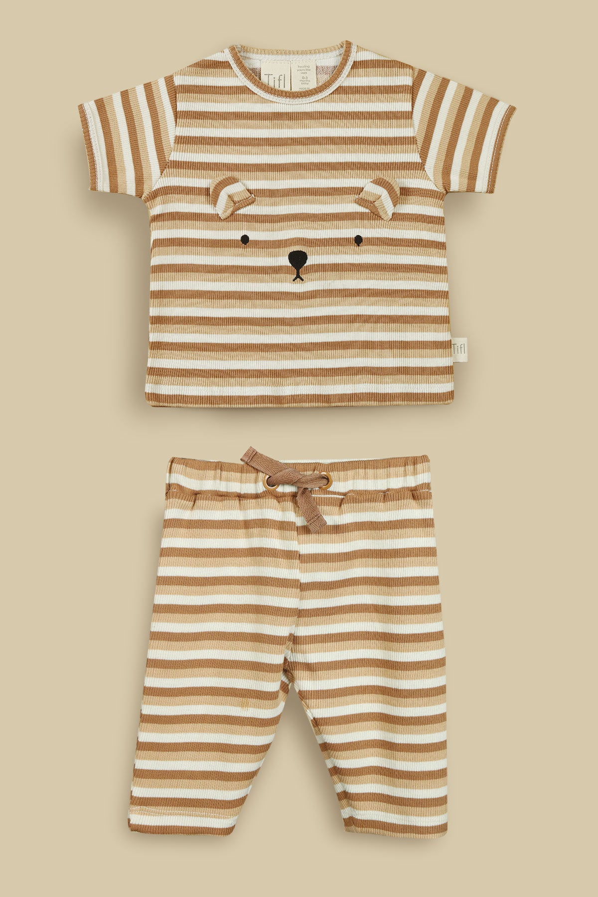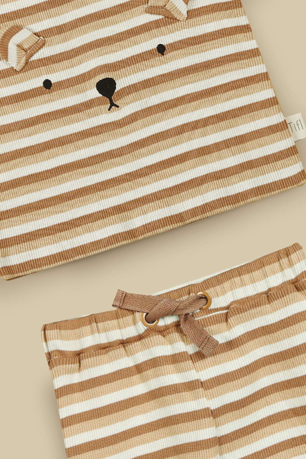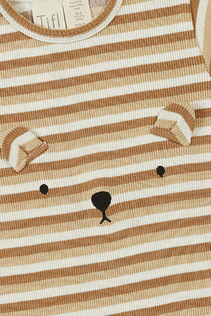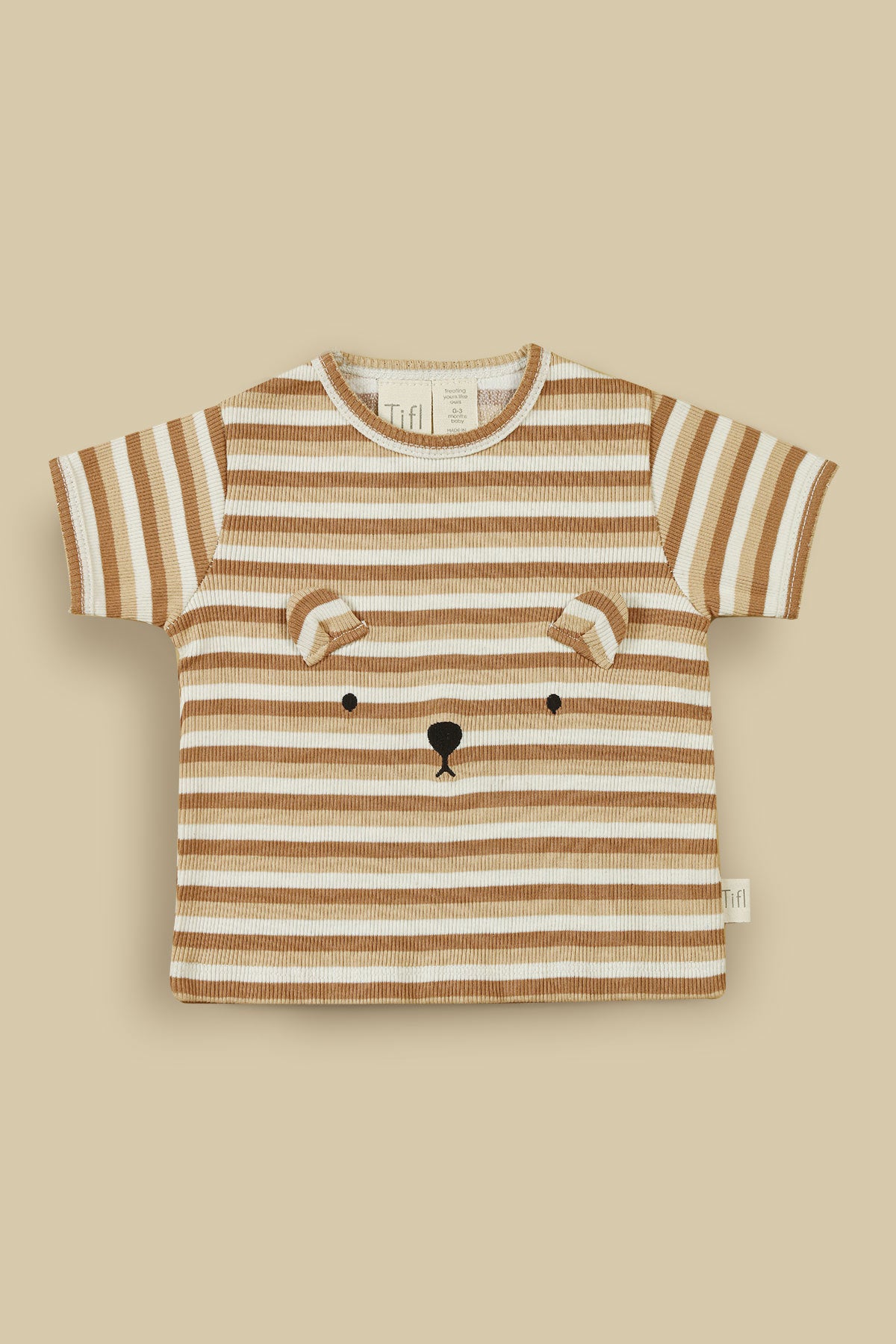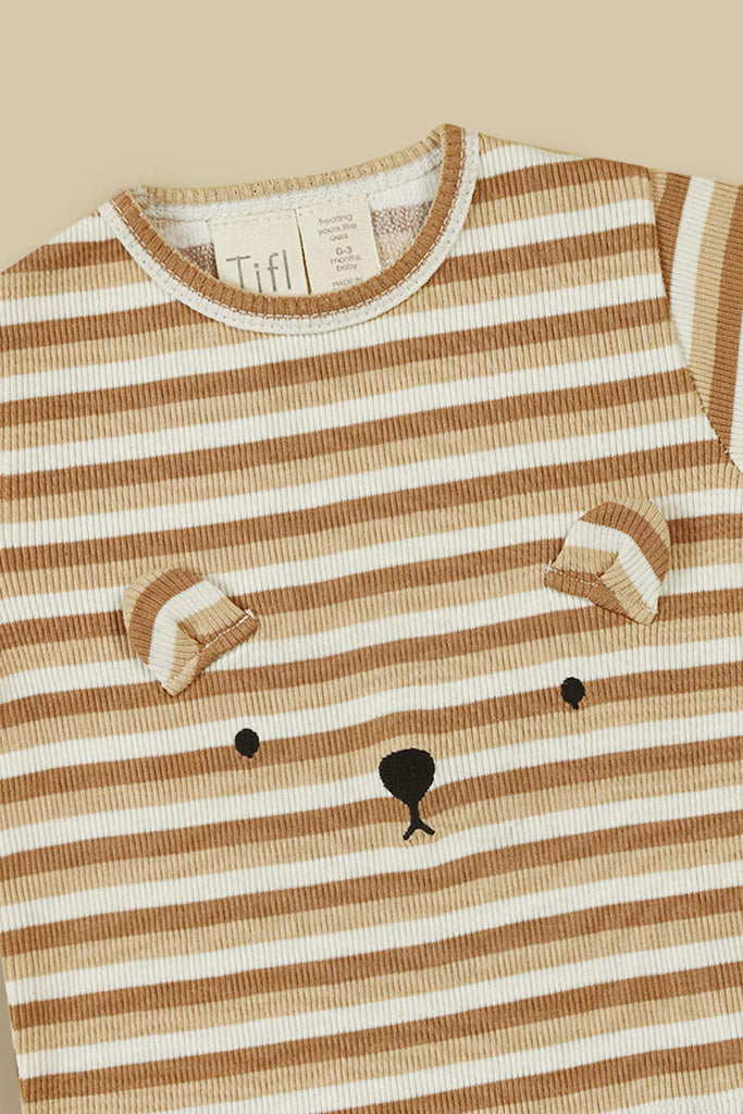This striped set features a sweet bear face with 3D ears—perfect for cuddly days and comfy play. Made from soft, breathable dyed ribbed, this two-piece outfit features a short-sleeve top with a playful bear face and 3D ears, paired with matching striped trouser for all-day comfort. These yarn dyed 100% cotton soft shirt and shorts with minimal prints are perfect for your cute baby bear. Gentle on baby’s skin and designed for easy movement, this adorable set is a must-have for cozy style.