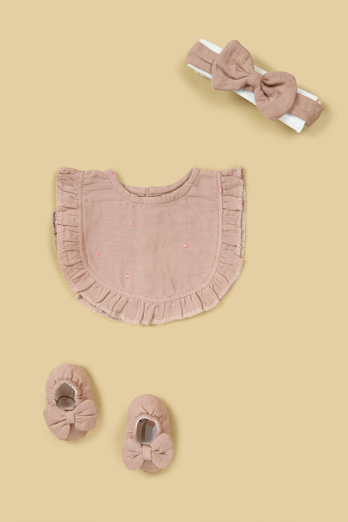Tiny Heart Embroidered Muslin Baby Gift Set (Bow Headband, Shoes, Bib)