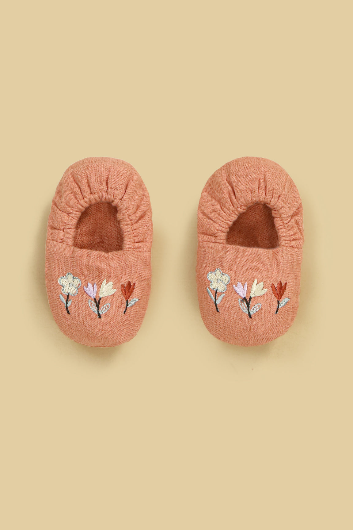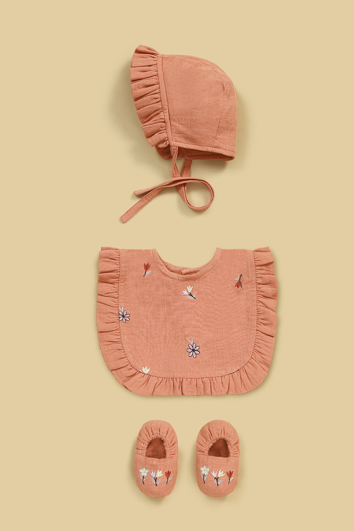 Sweet Blossom Embroidered Muslin Baby Gift Set (Bonnet Cap, Bib & Shoes)