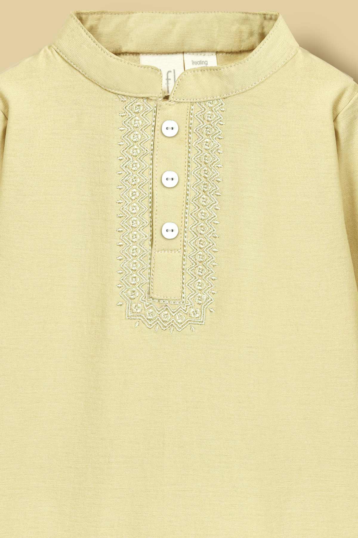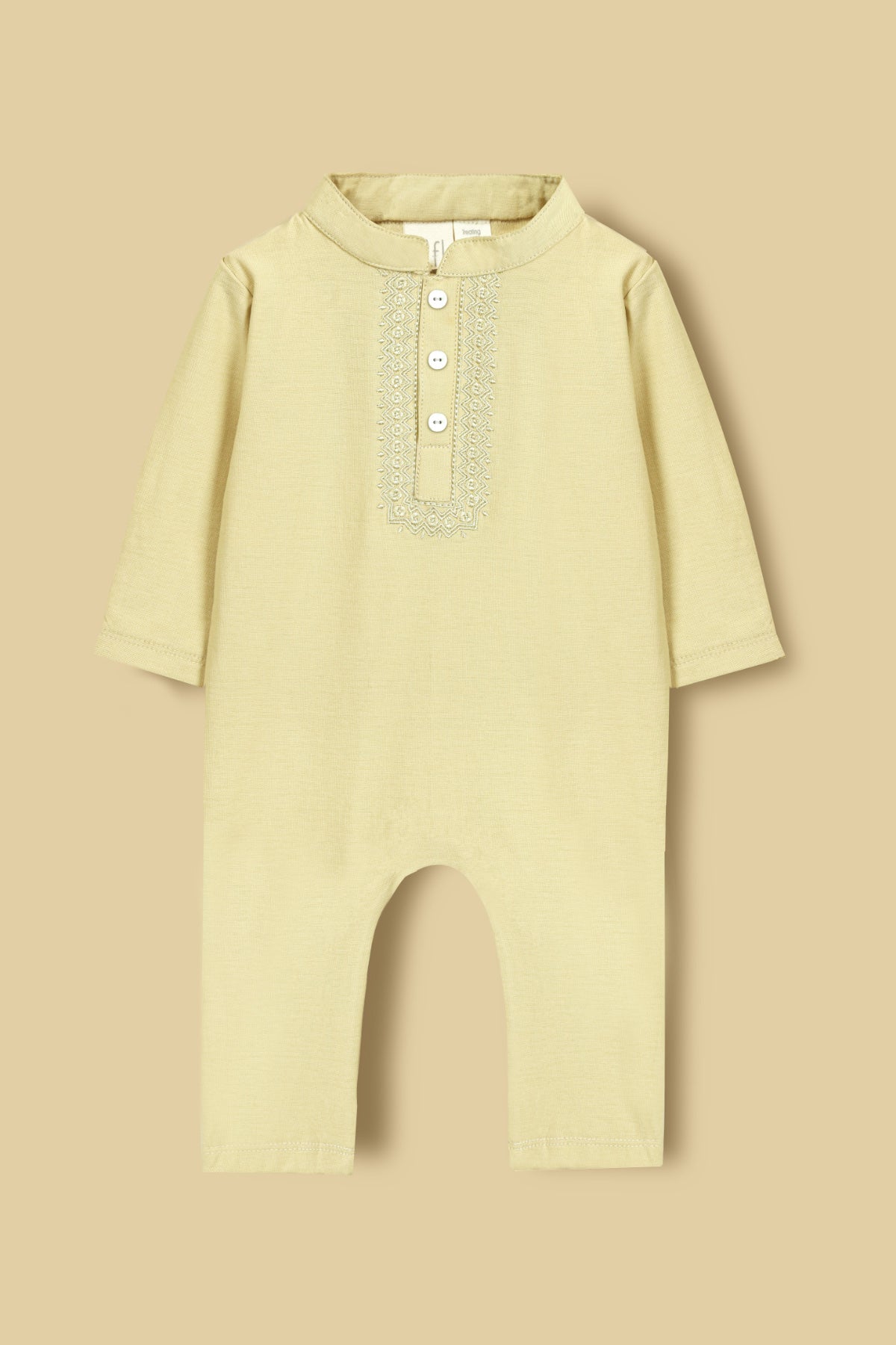 Crafted from soft knitted cotton along with our signature embroidery. featuring front placket with snap button detailing makes it perfect for babies on Eid. The relaxed fit and hidden button at bottom make diaper changes quick and easy.