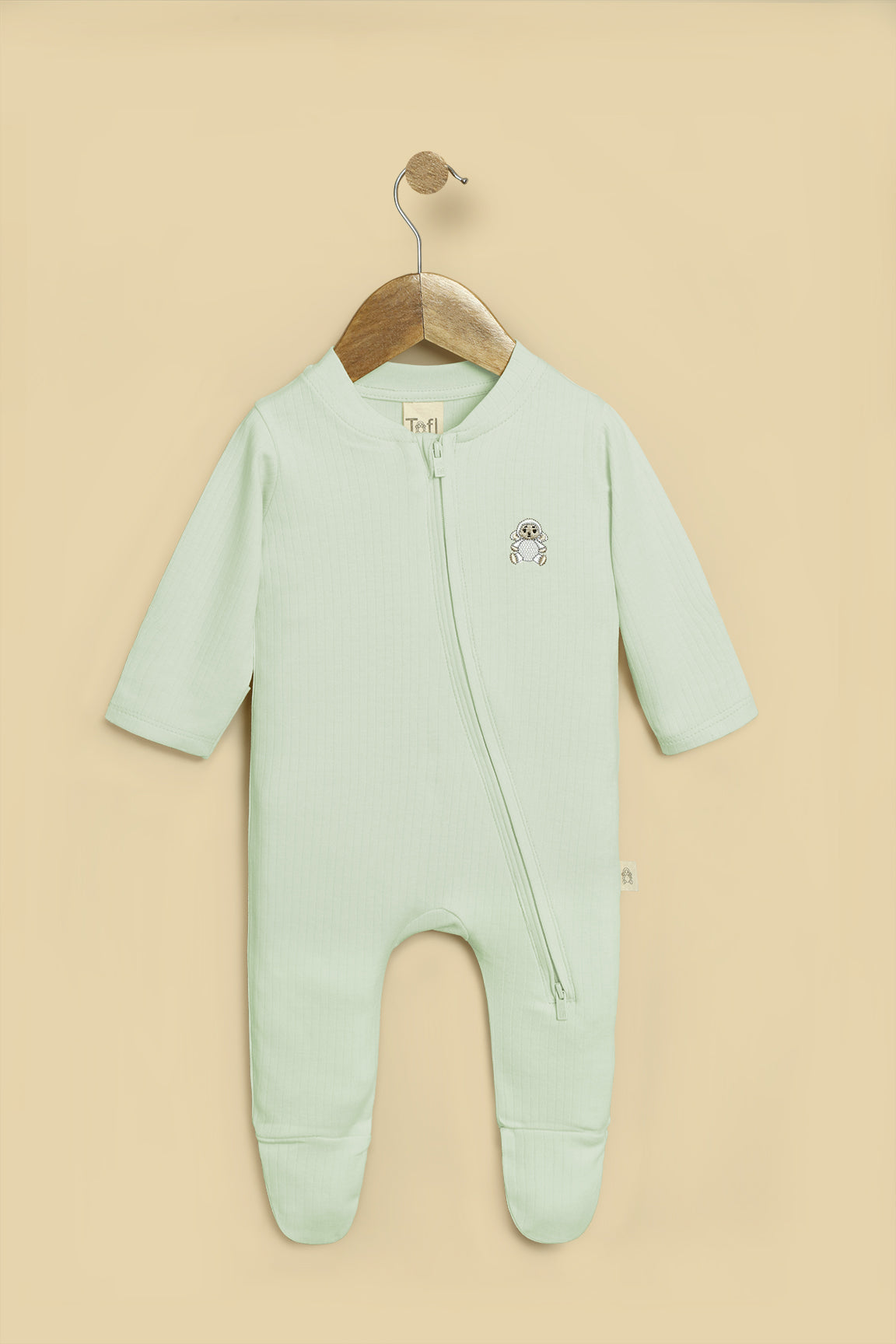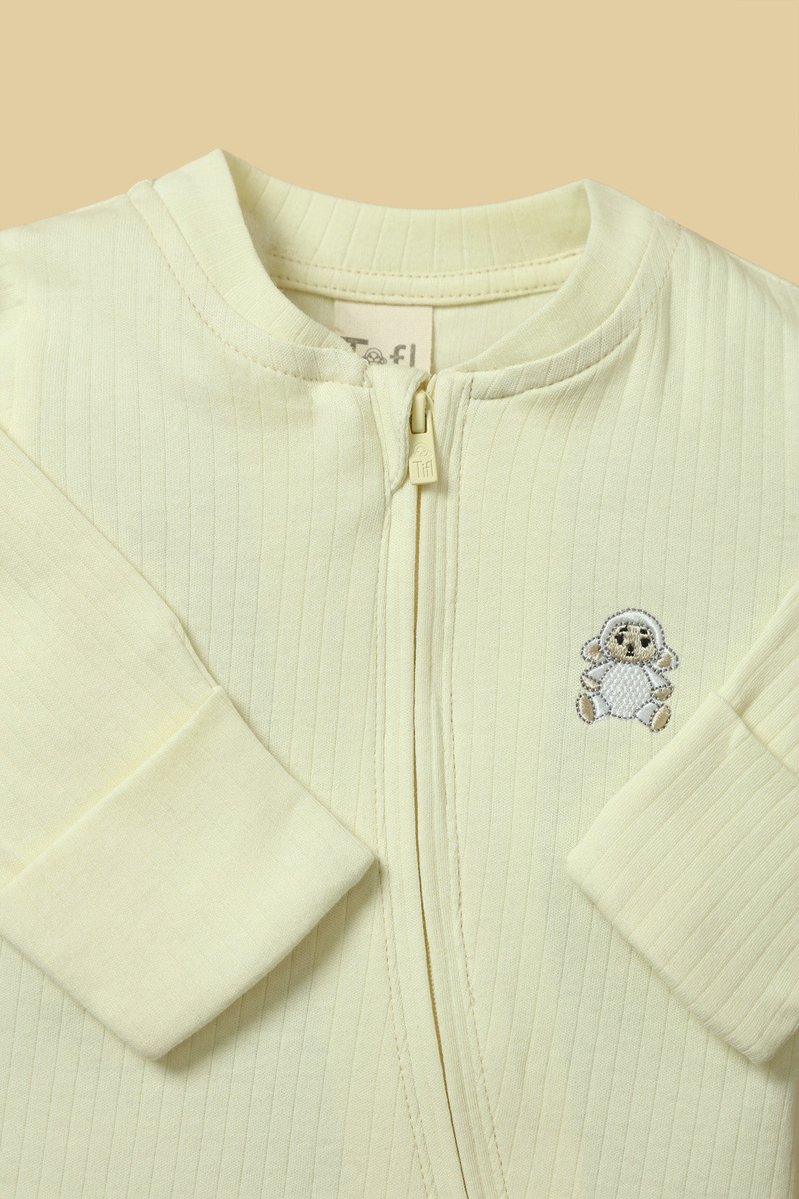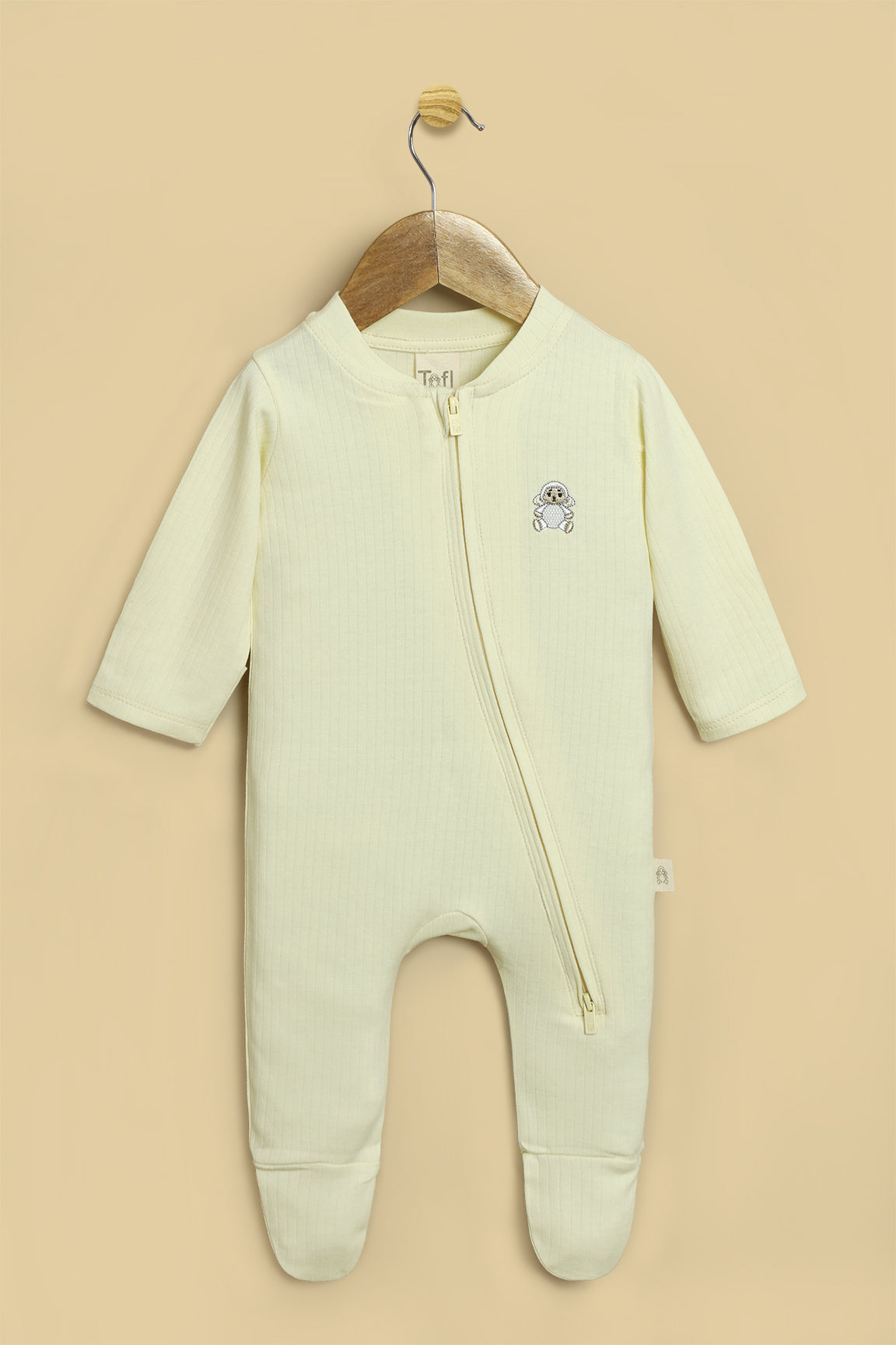 This 100% cotton rib double zipper baby sleeping suits combines comfort and convenience with its soft ribbed fabric and double zipper for easy dressing and quick diaper changes. With luxuriously embroidered Haml motif and soft mesh fusing on back to protect baby’s soft skin from rash, it ensures comfort and minimal styling throughout the day. It also has an added flap on top to protect child from the zip at closure.