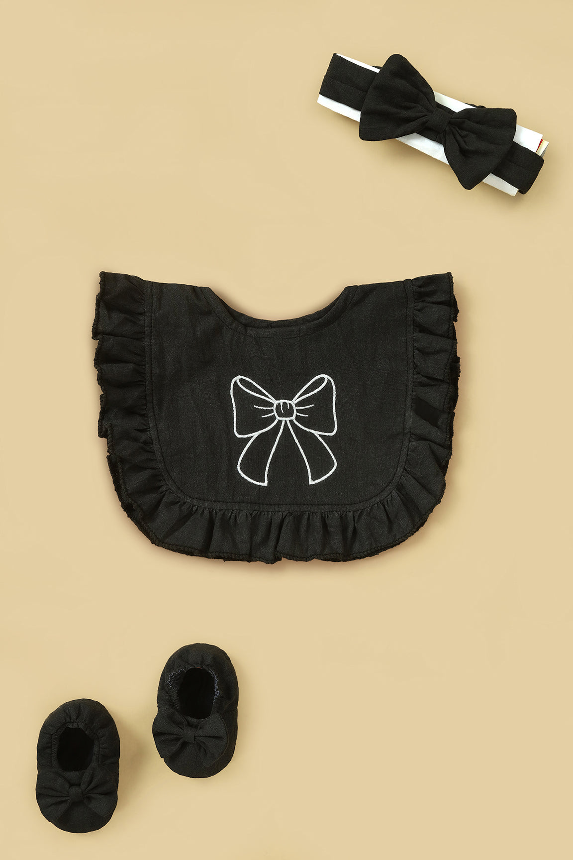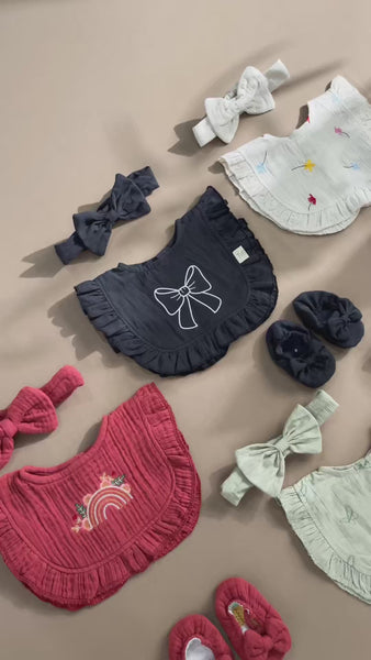 This charming baby accessory set is crafted from premium soft muslin fabric in a black shade. The set includes a ruffled muslin bib, a pair of matching soft-sole shoes, and a cute bow headband, all perfectly coordinated for a stylish newborn look. Perfect for daily wear, gifting, special events, or newborn photo-shoots, this set brings together comfort, softness, and adorable style.