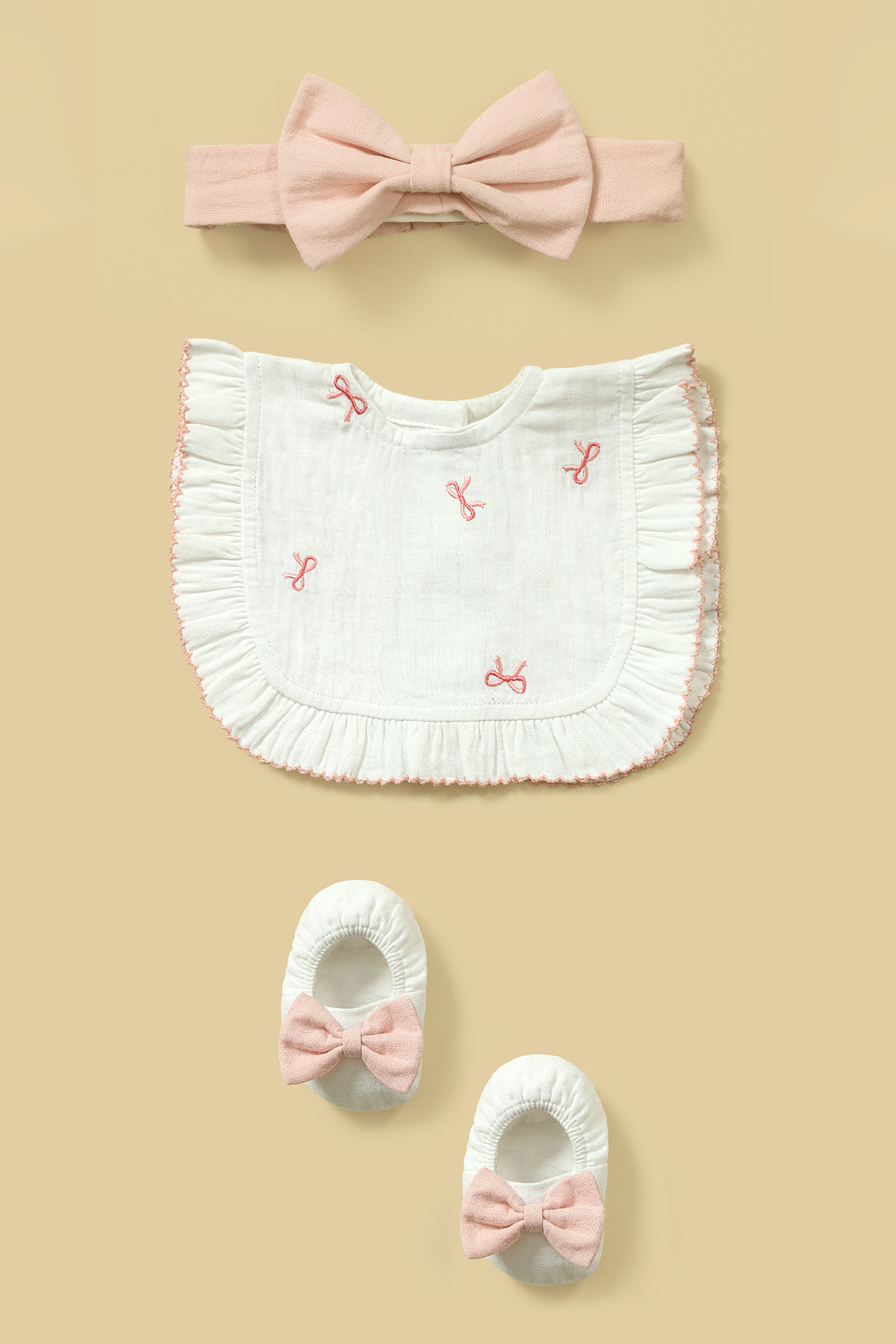 Bows Embroidered Muslin Baby Gift Set (Bow Headband, Shoes, Bib)