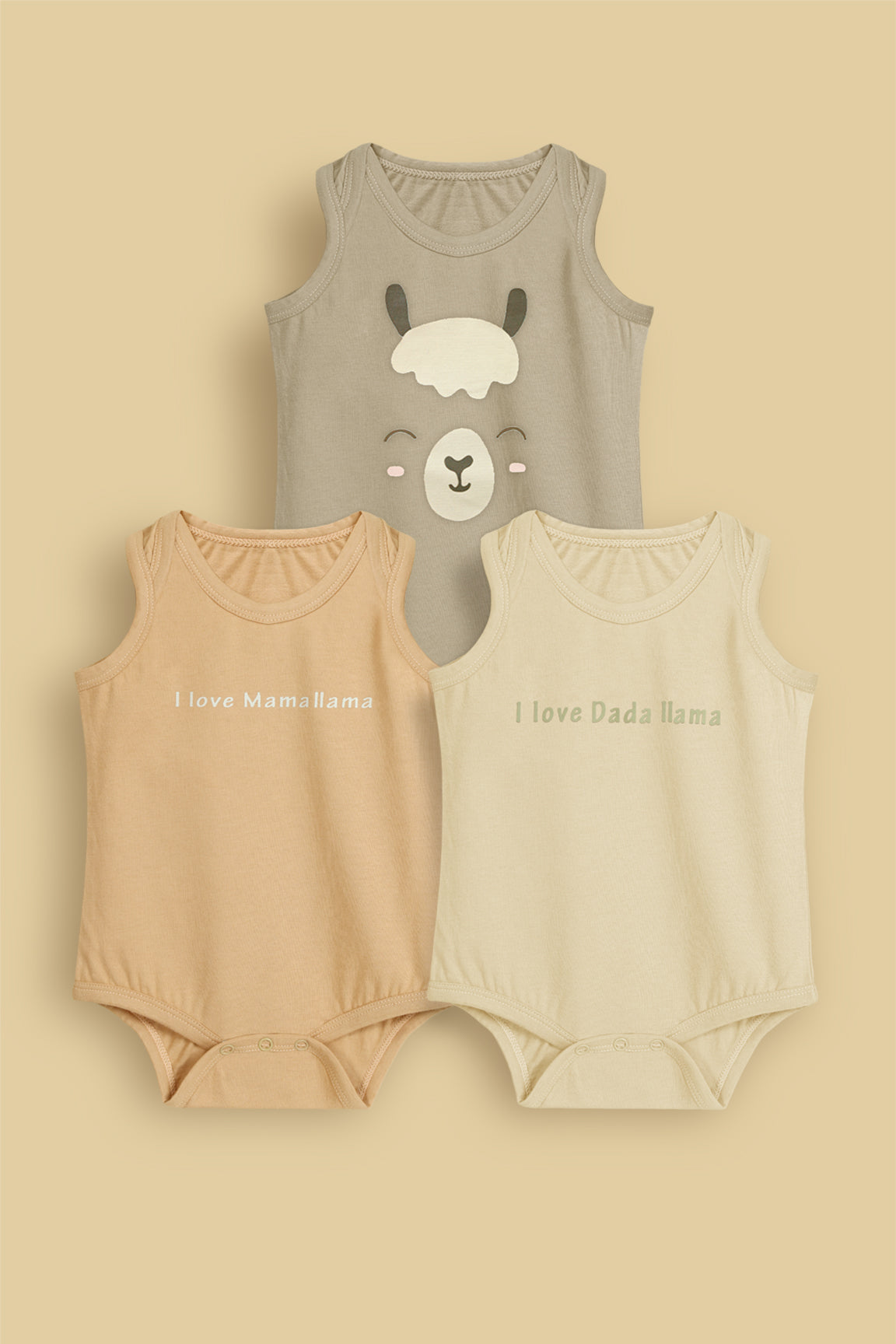 Our tank top style bodysuits., crafted from 100% soft single jersey, they offer a gentle, breathable stretch that keeps your baby comfortable all day. Designed with adorable llama prints and sweet “I Love Mama Llama” and “I Love Dada Llama” details, they’re perfect for everyday wear with a playful, minimal touch.