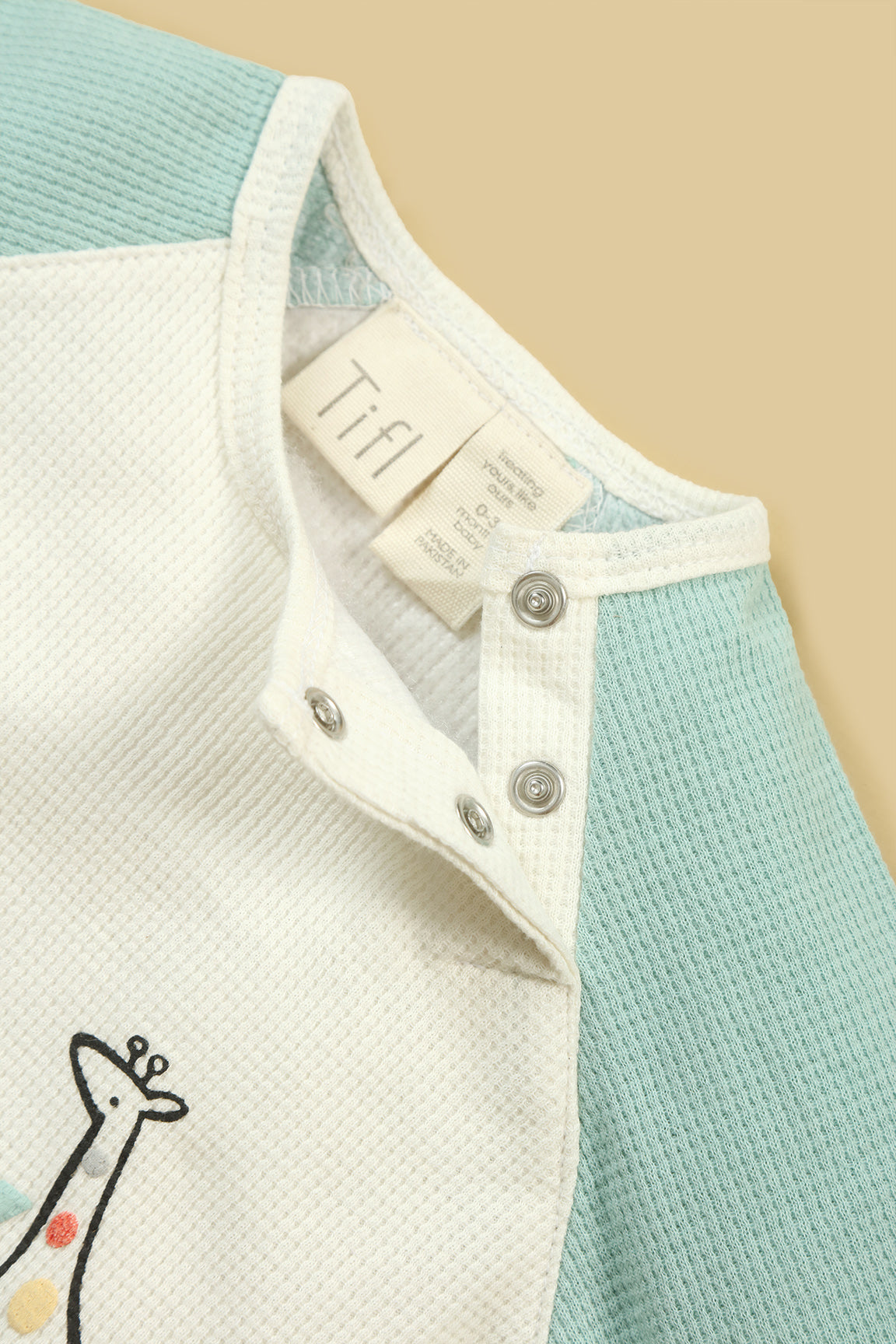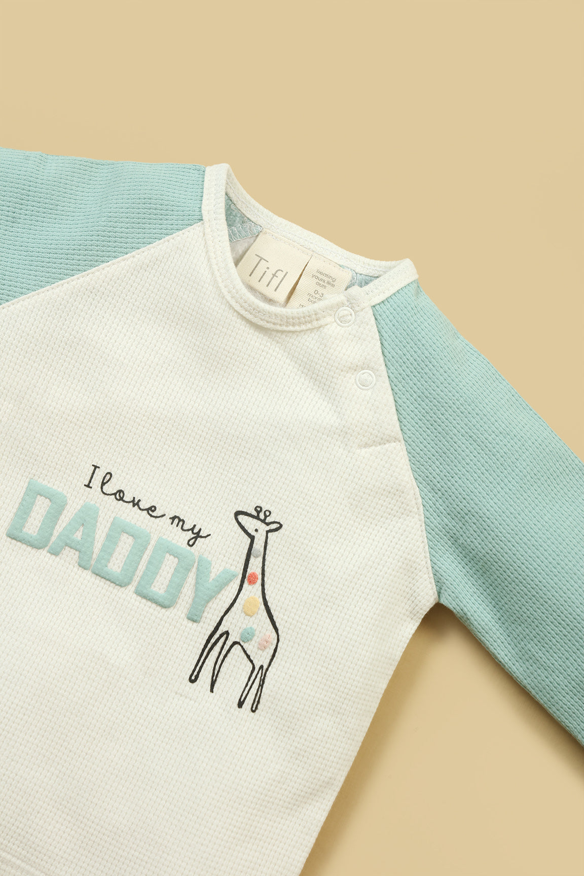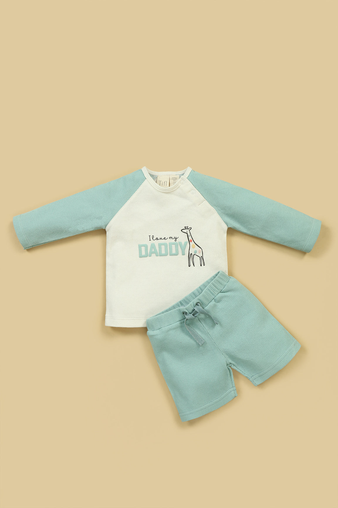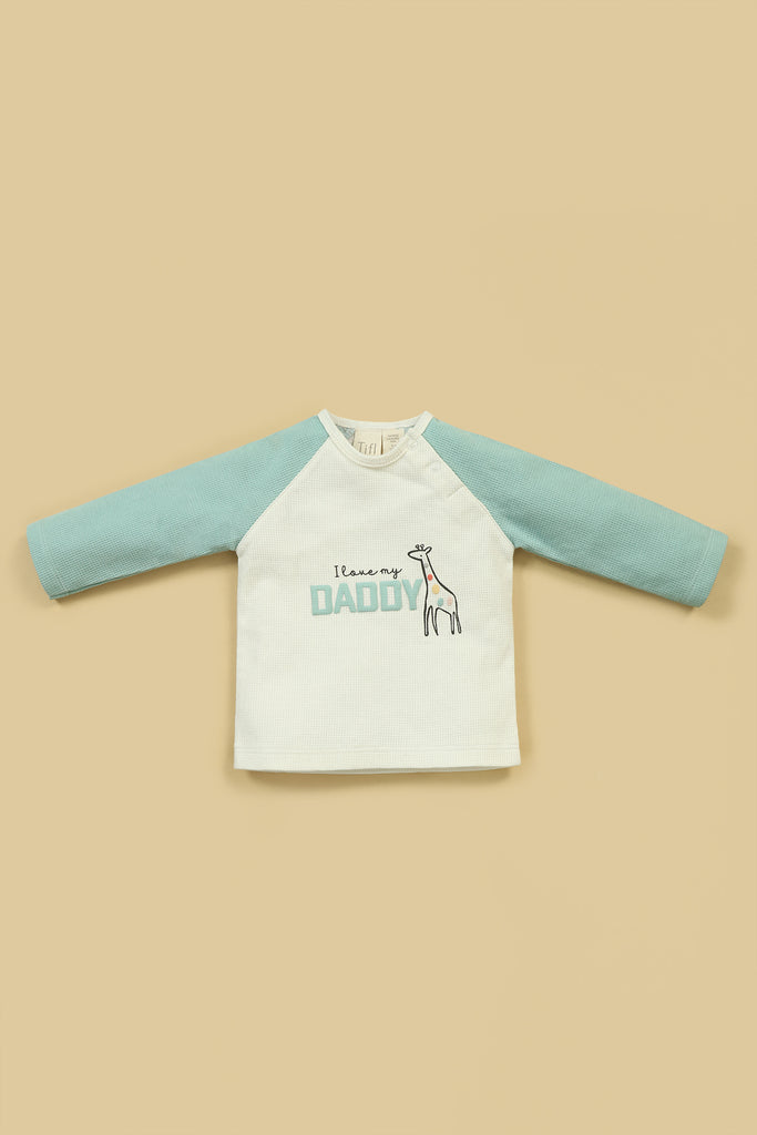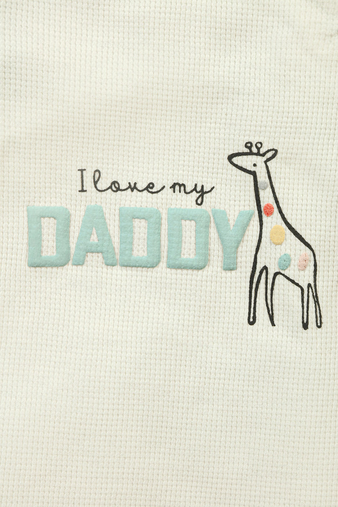 A soft, full-sleeve shirt with short, featuring a cute giraffe and "I love my Daddy" & little elephant print. Made from cozy waffle-knit fabric with front snap buttons for easy wear.