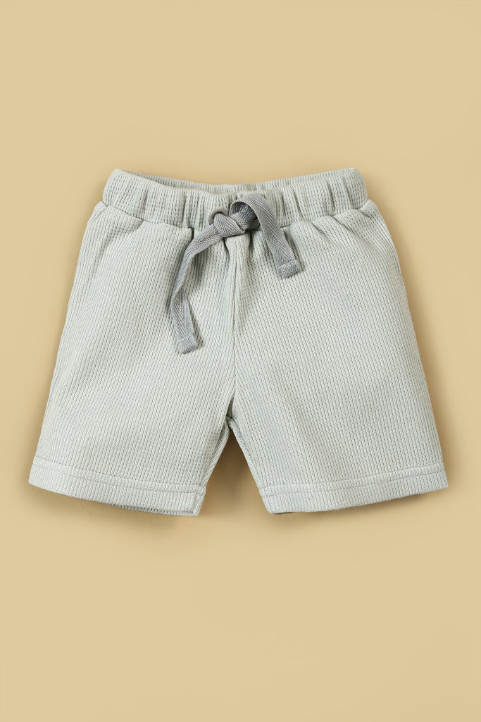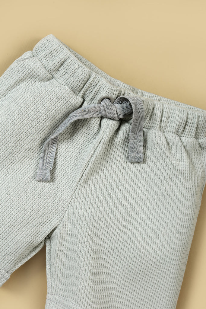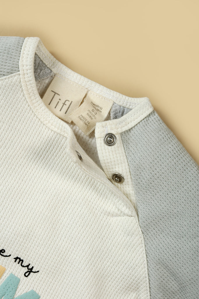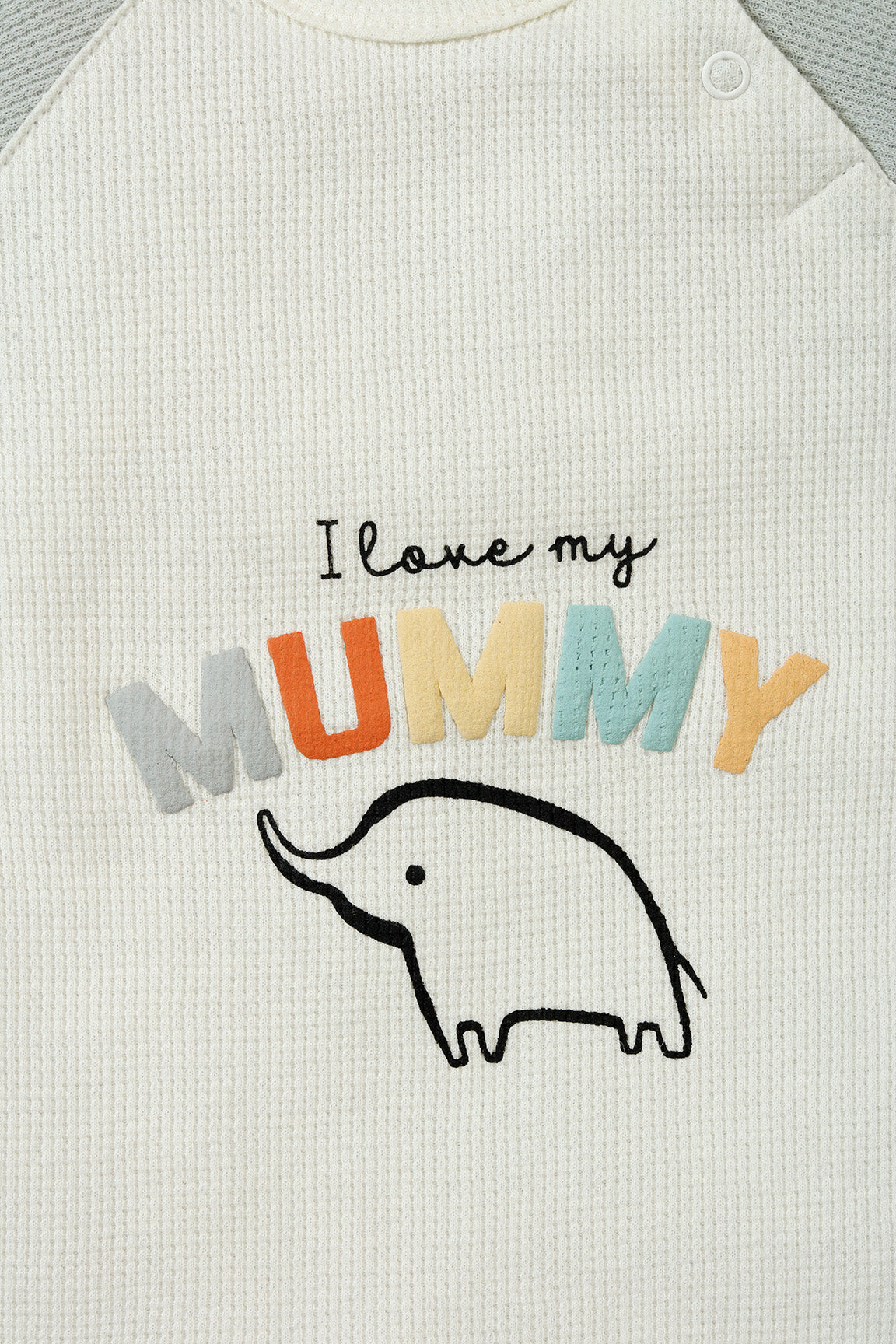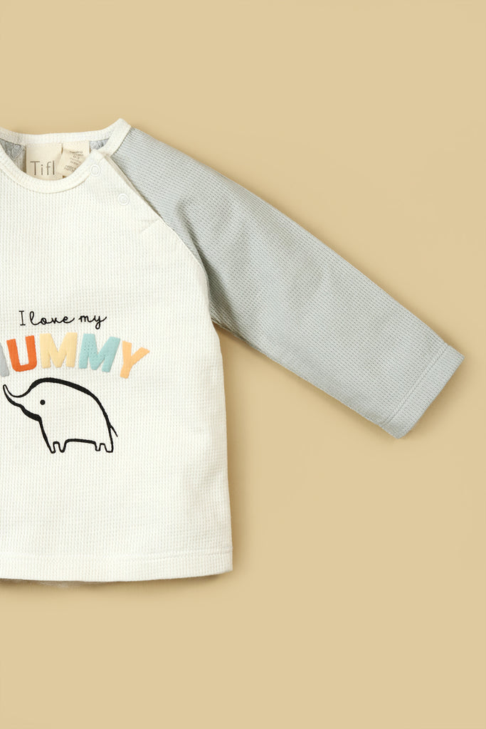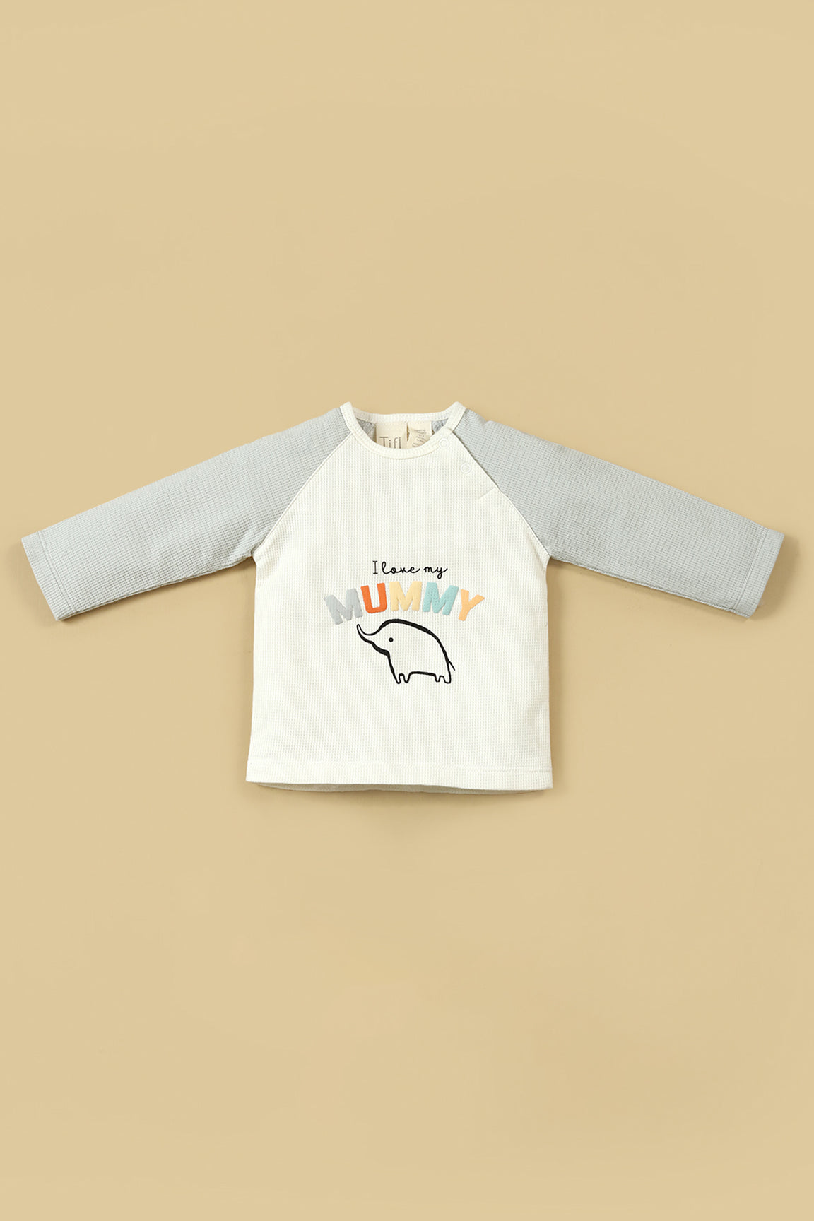 A soft, full-sleeve shirt with short, featuring a cute giraffe and "I love my Mummy" & little elephant print. Made from cozy waffle-knit fabric with front snap buttons for easy wear.