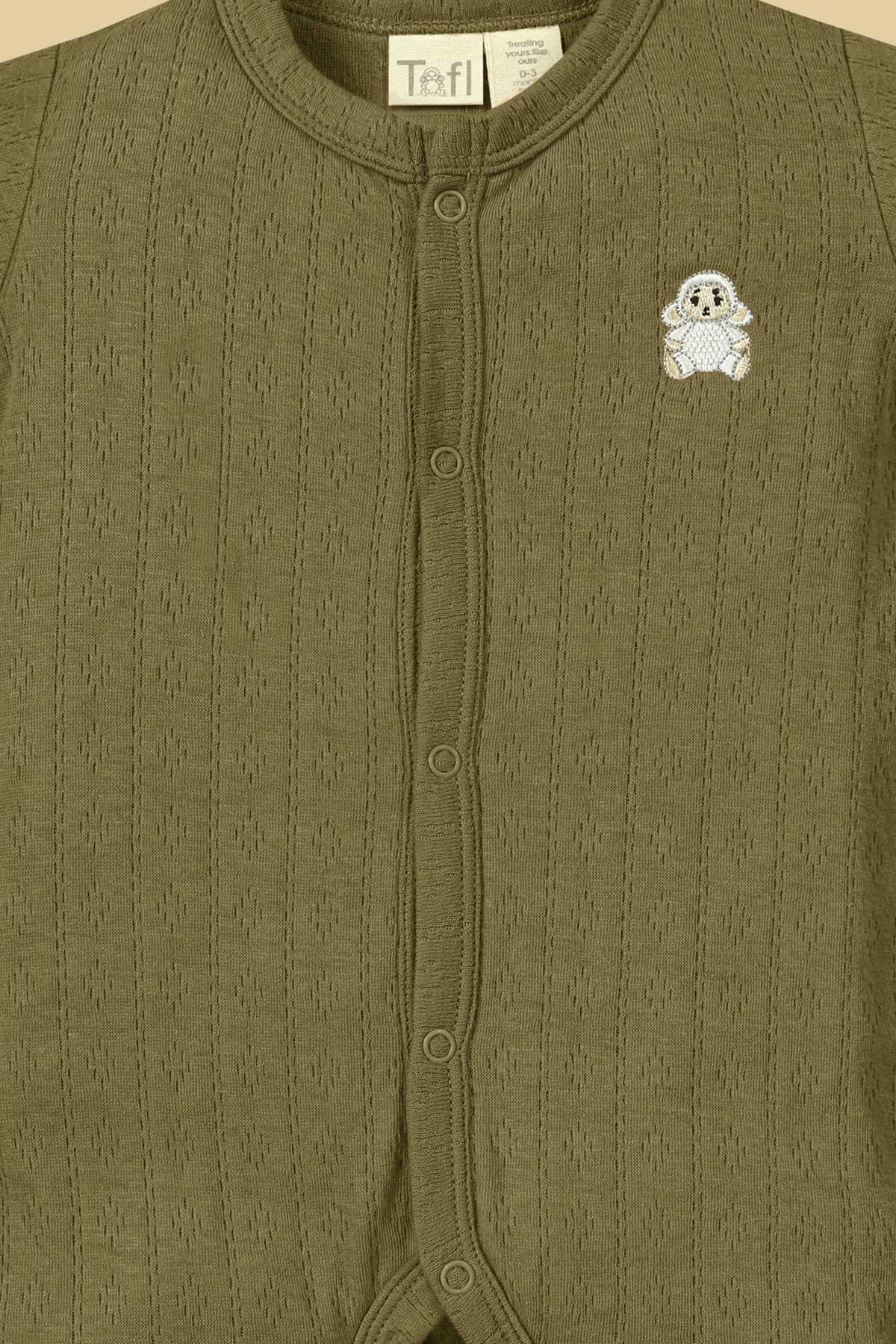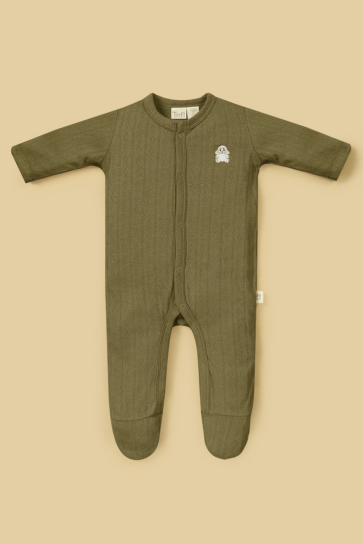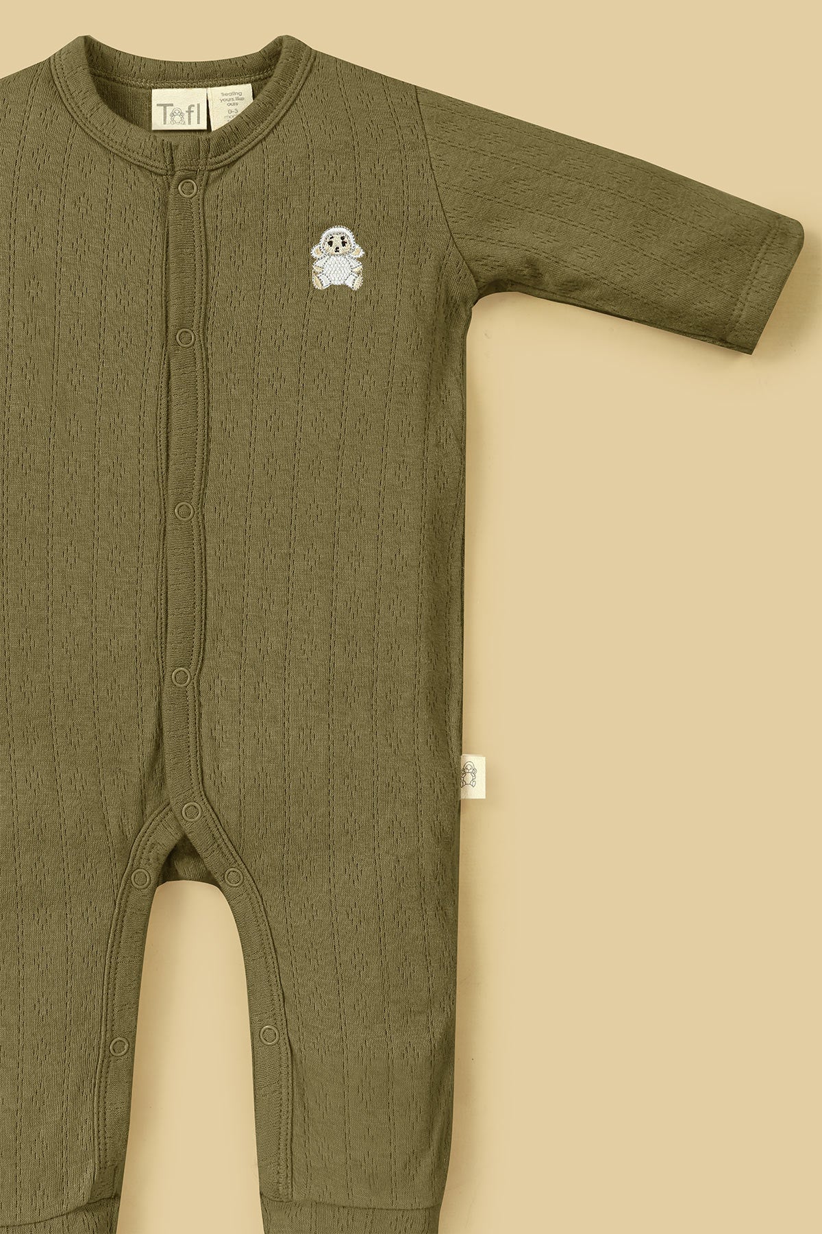 This knitted jacquard baby Rompers is made from soft, cozy fabric to keep your little one comfortable, features Sheep embroidered motif with soft mesh fusing on the back to protect baby’s skin form rashes.