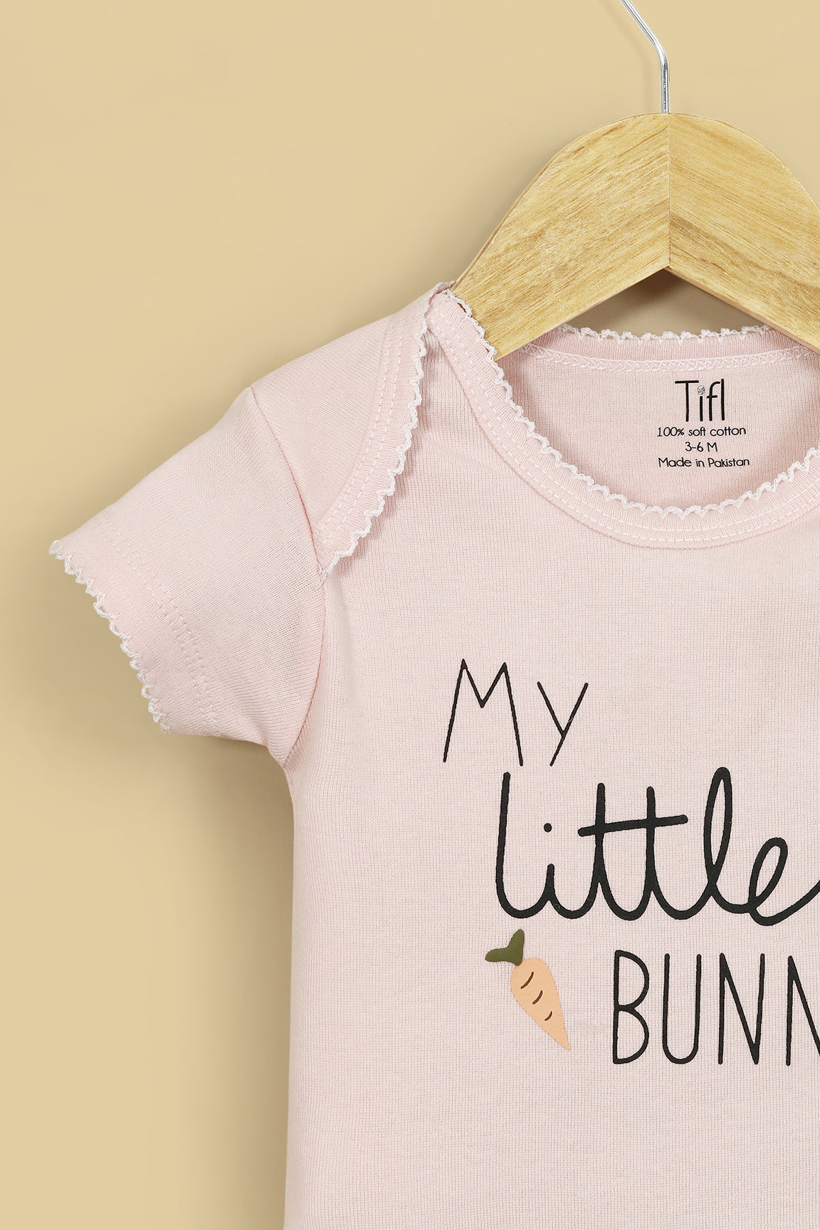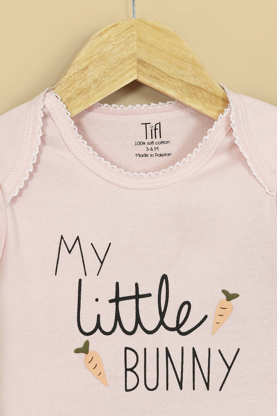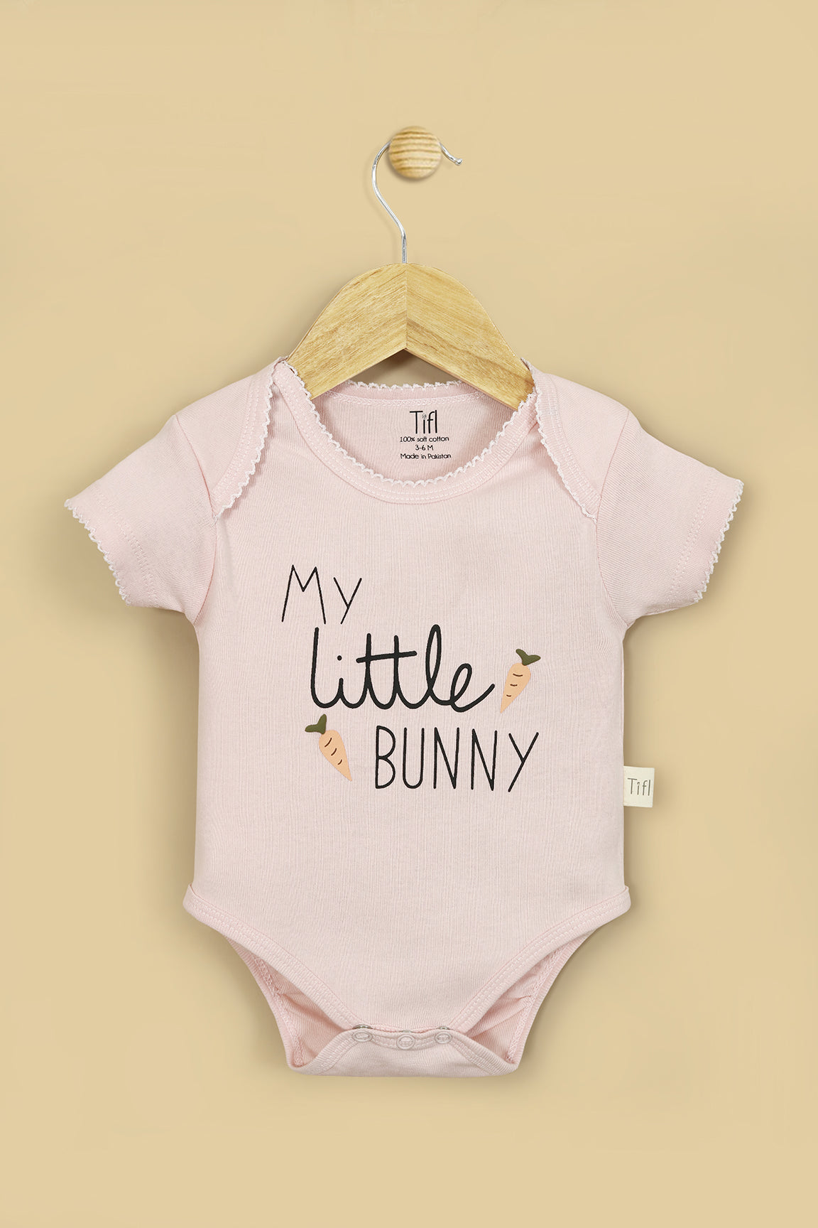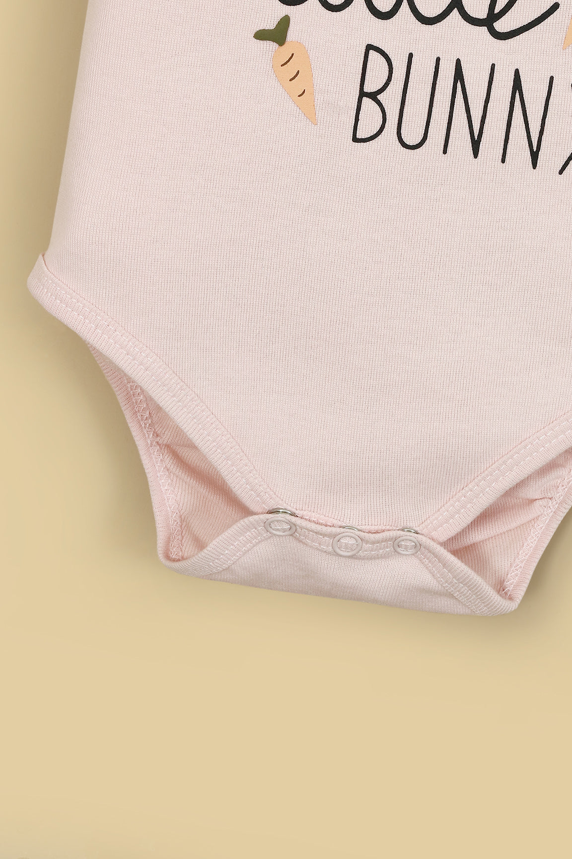 This pastel pink bodysuit features an adorable “My Little Bunny” sticker print with cute carrot accents, adding a playful touch to your little one’s outfit. Designed for everyday comfort, it includes snap buttons for easy diaper changes and an envelope neckline for effortless dressing. Perfect for keeping your baby cozy, comfy, and irresistibly cute.