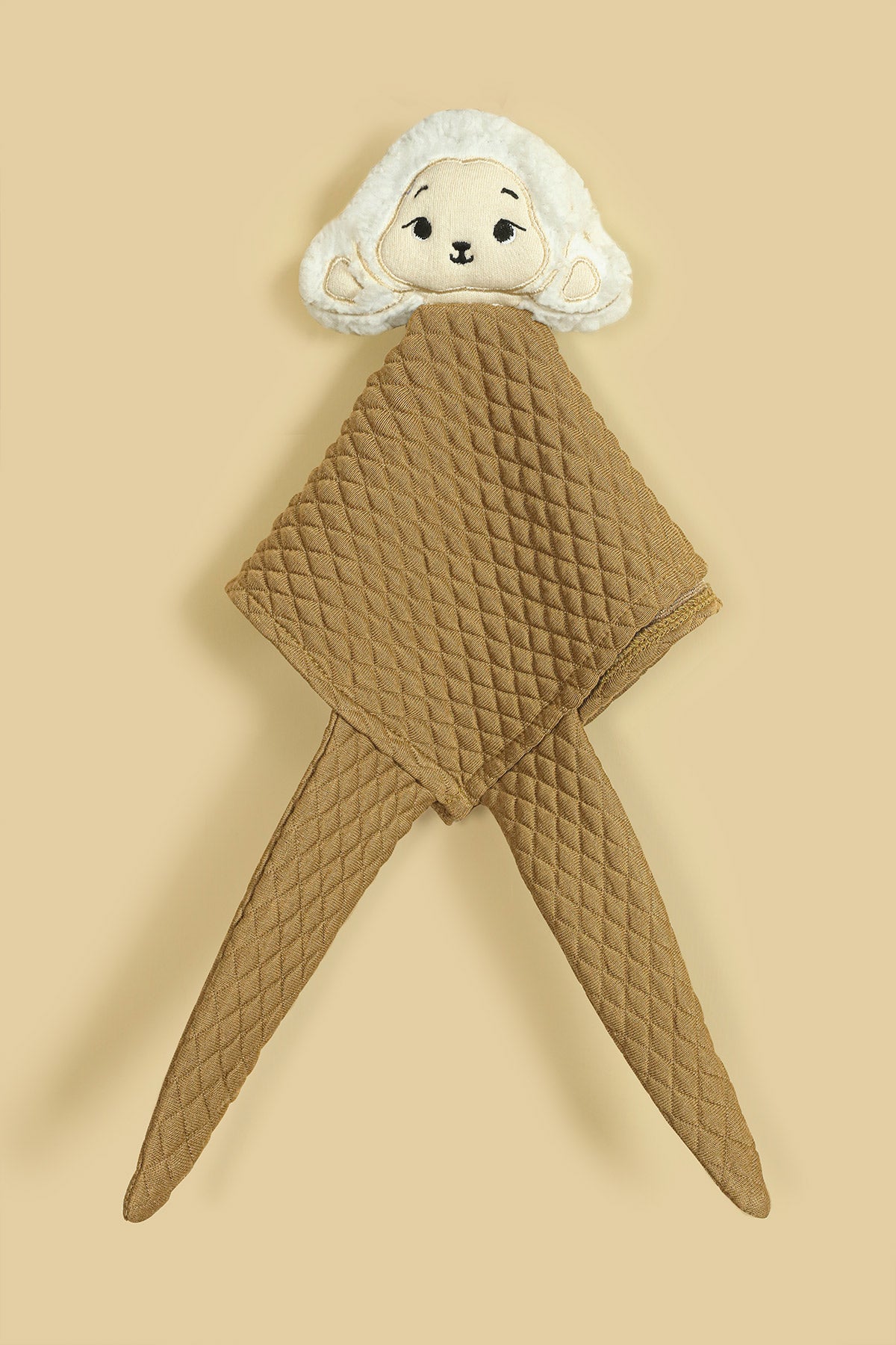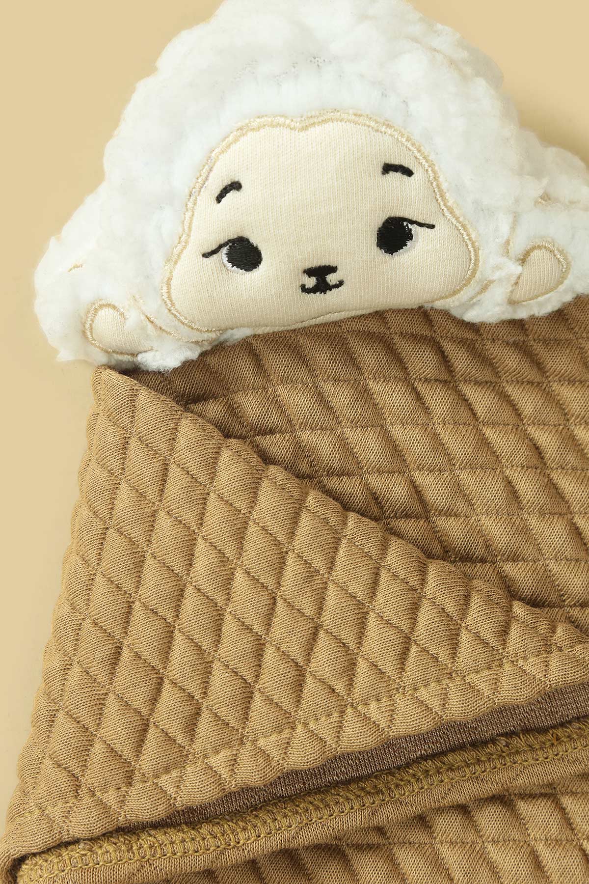 This adorable baby hankie features a soft, padded cotton jacquard fabric with a cute haml face attached for a touch of charm. A practical yet endearing accessory, it combines comfort and style for your little one.