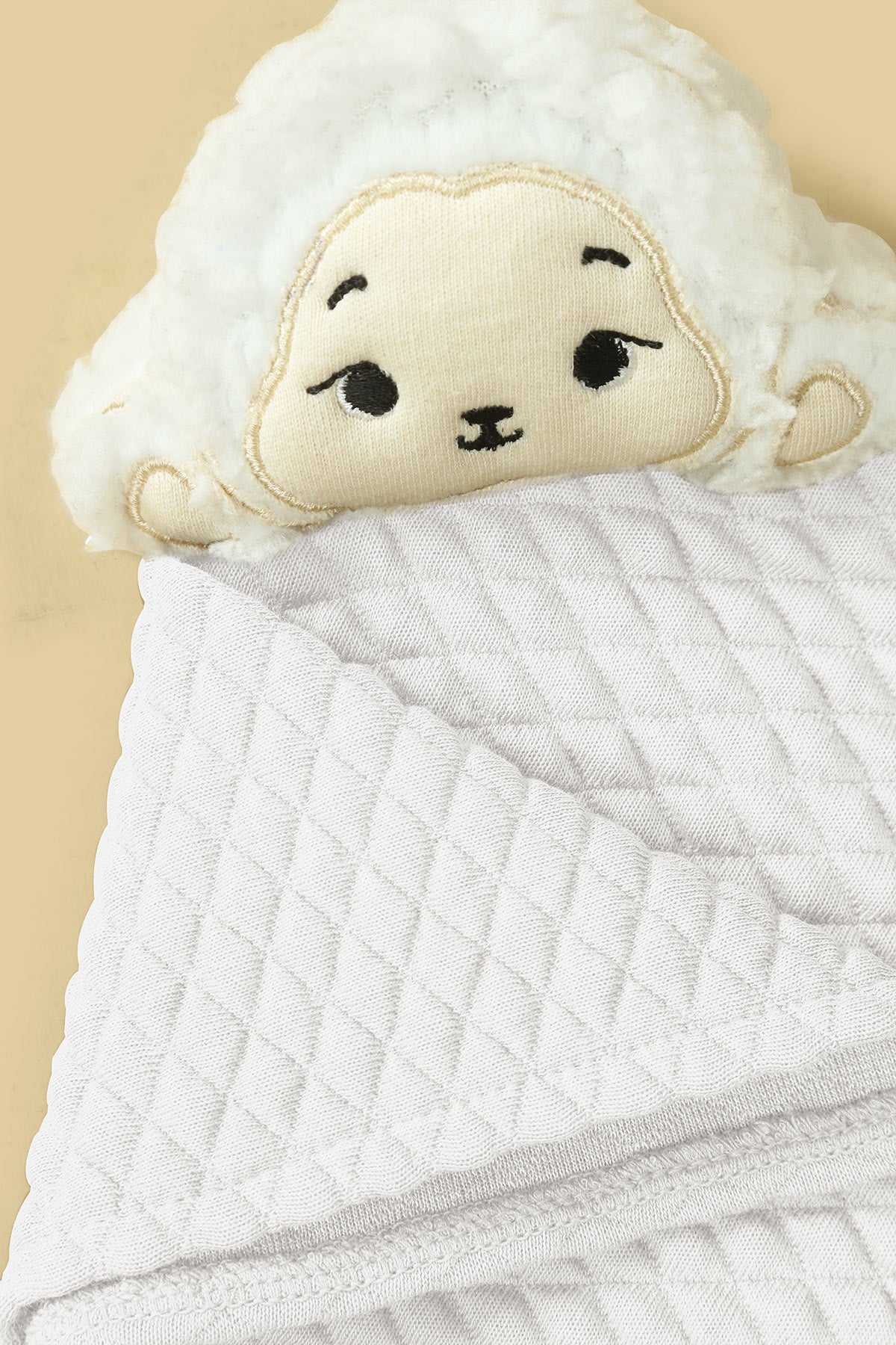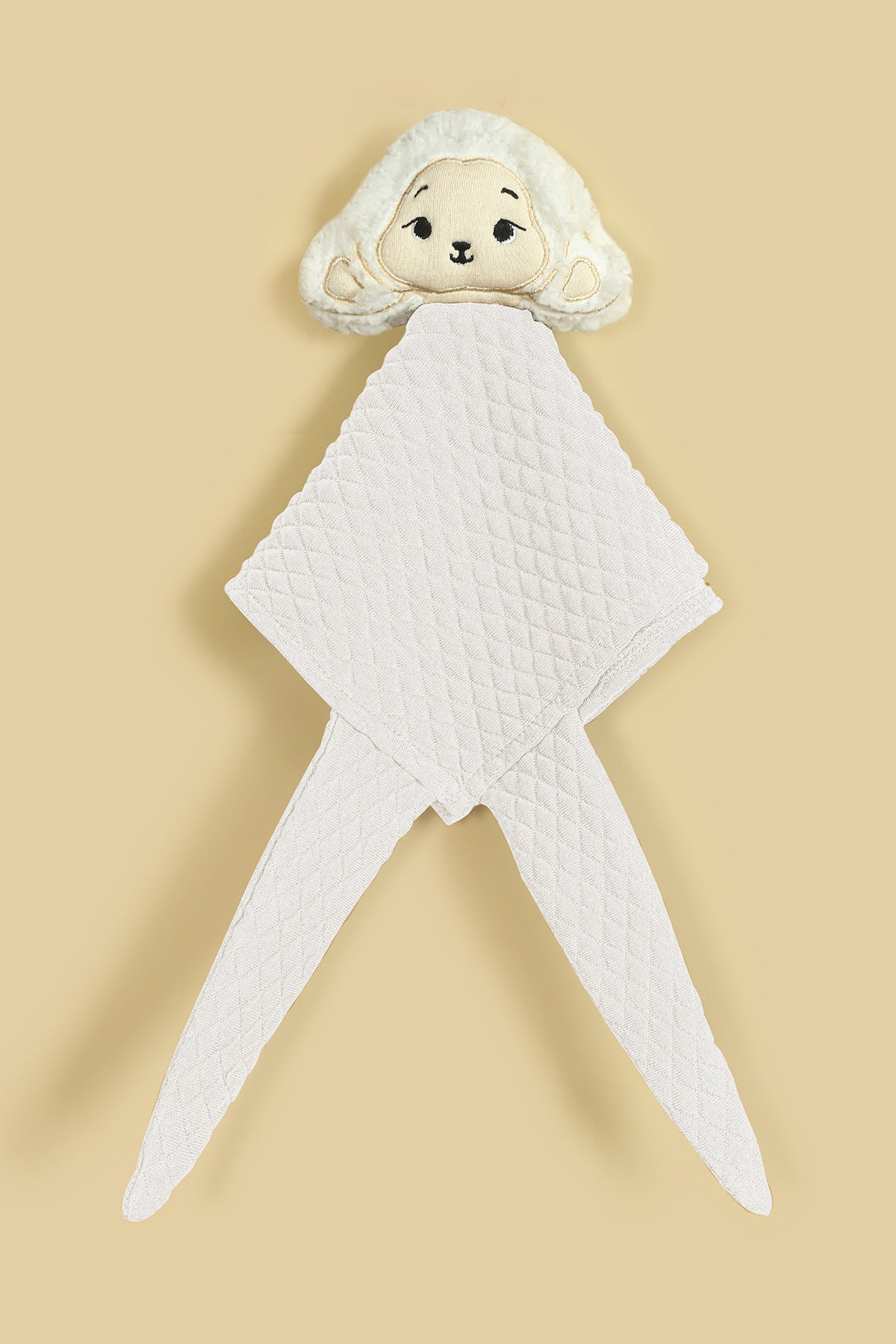 This adorable baby hankie features a soft, padded cotton jacquard fabric with a cute haml face attached for a touch of charm. A practical yet endearing accessory, it combines comfort and style for your little one.