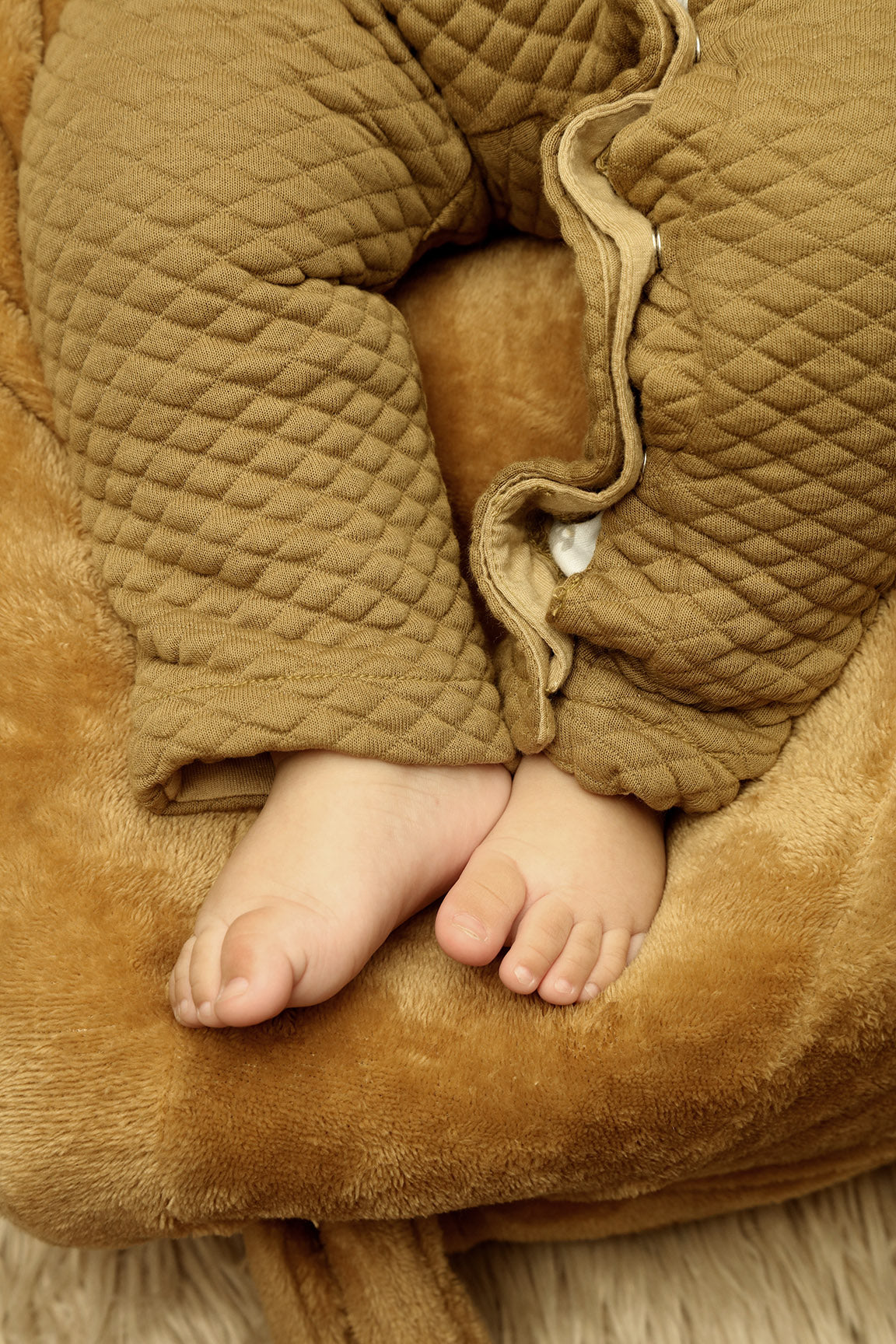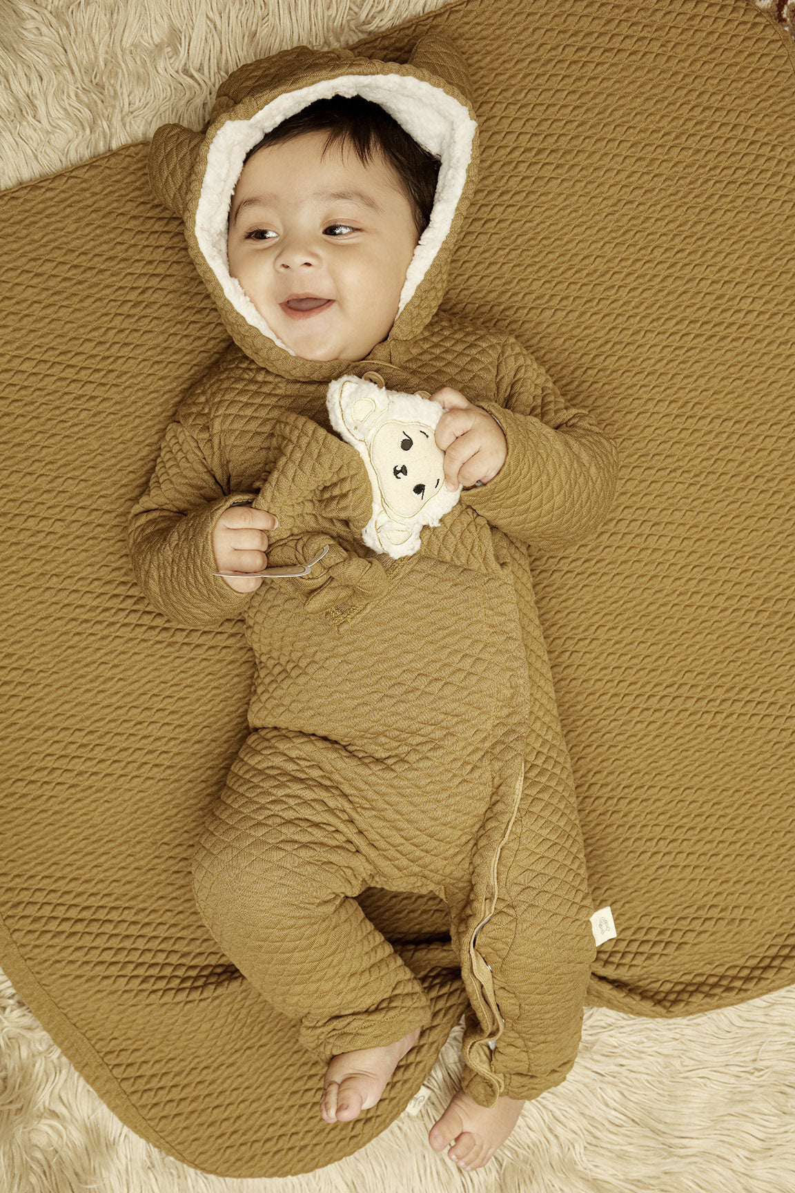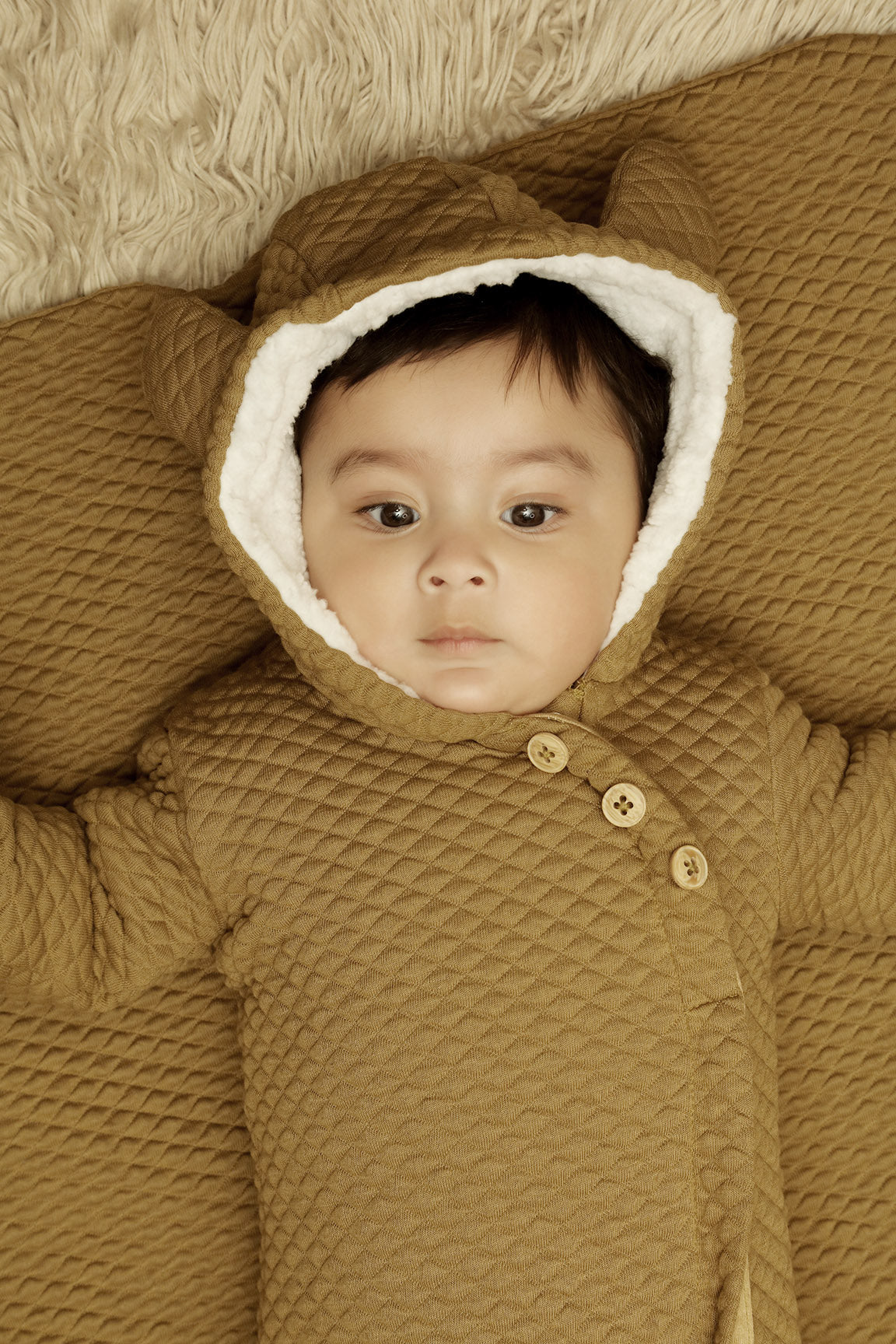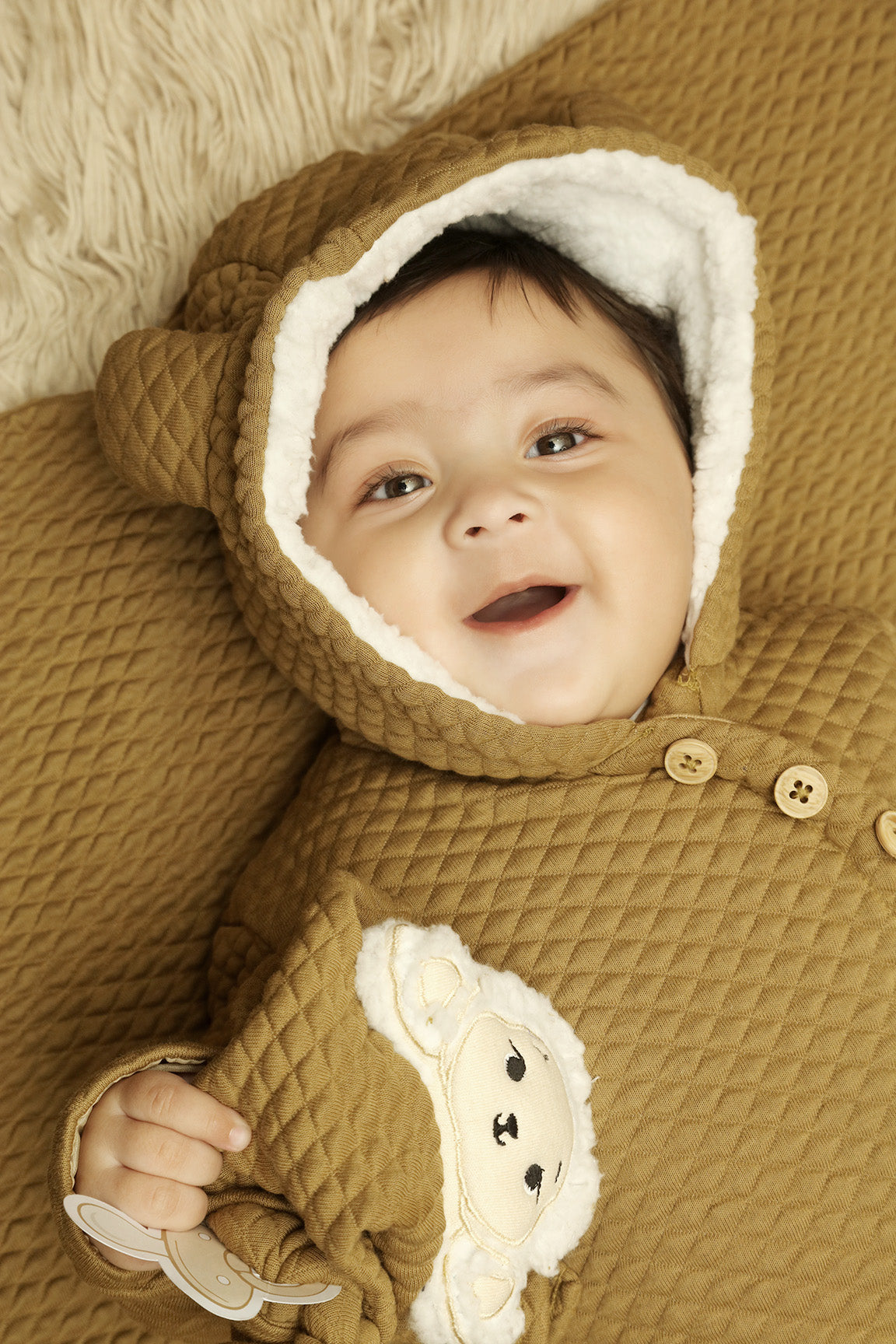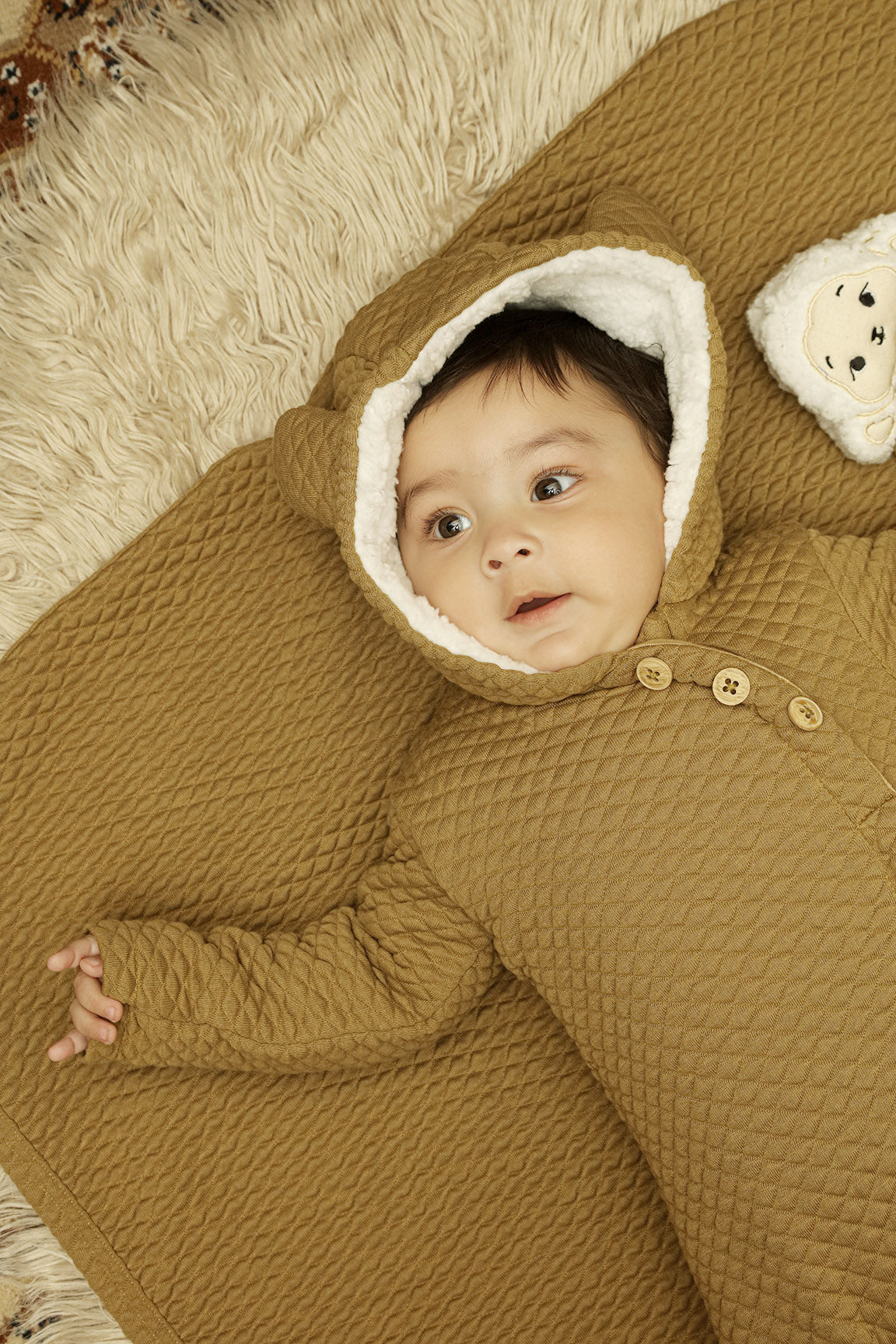 Made from 100% padded cotton jacquard fabric, this cozy baby upper offers warmth and comfort for cooler days. It features a Sherpa-lined hood,  cherry lining in the sleeves for easy wear, and a soft cotton lining as inner to keep your little one comfortable all day.