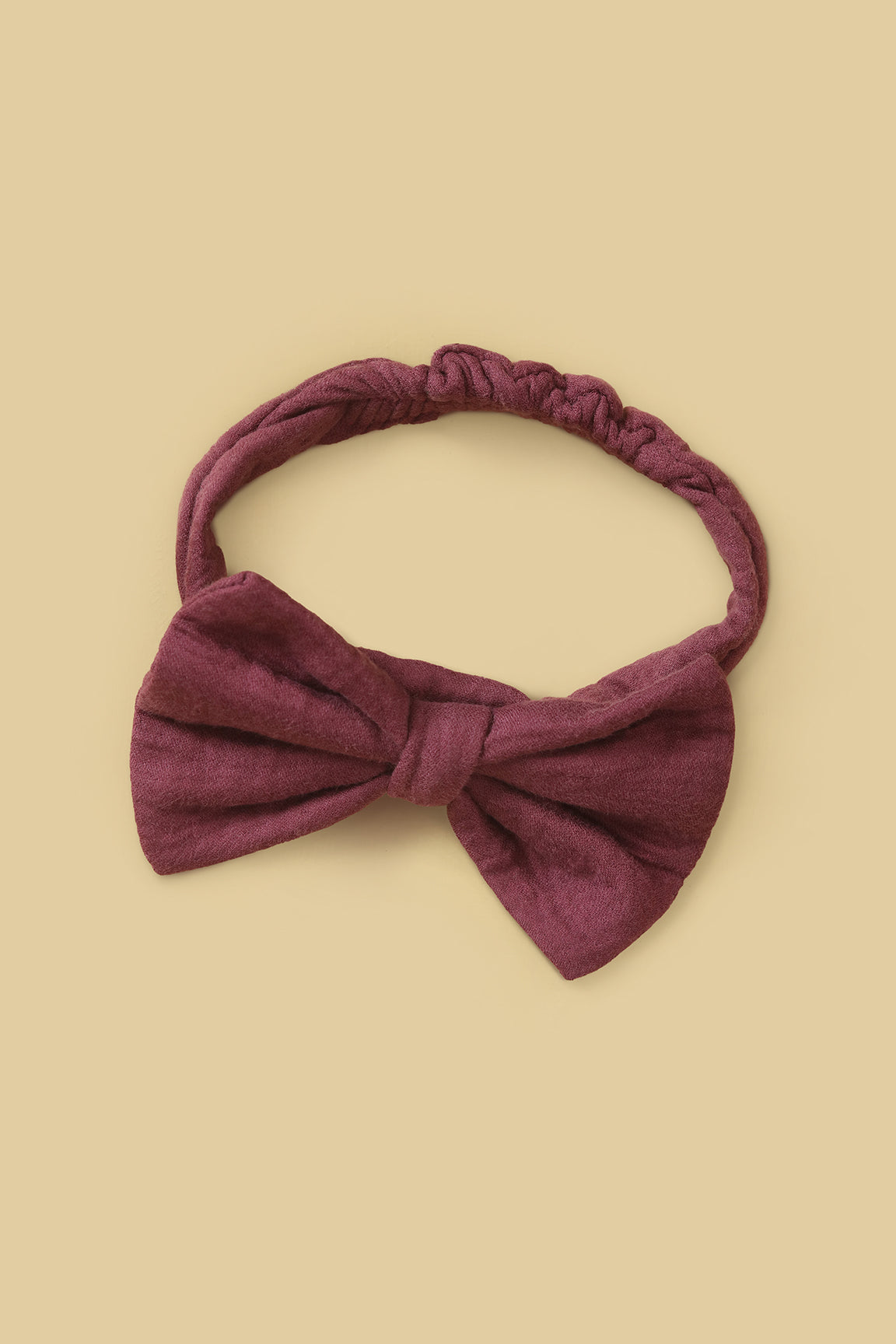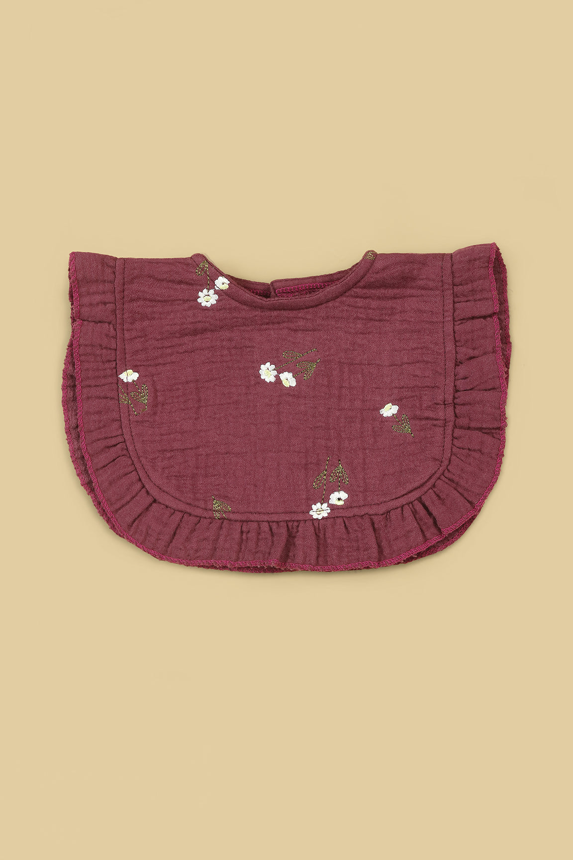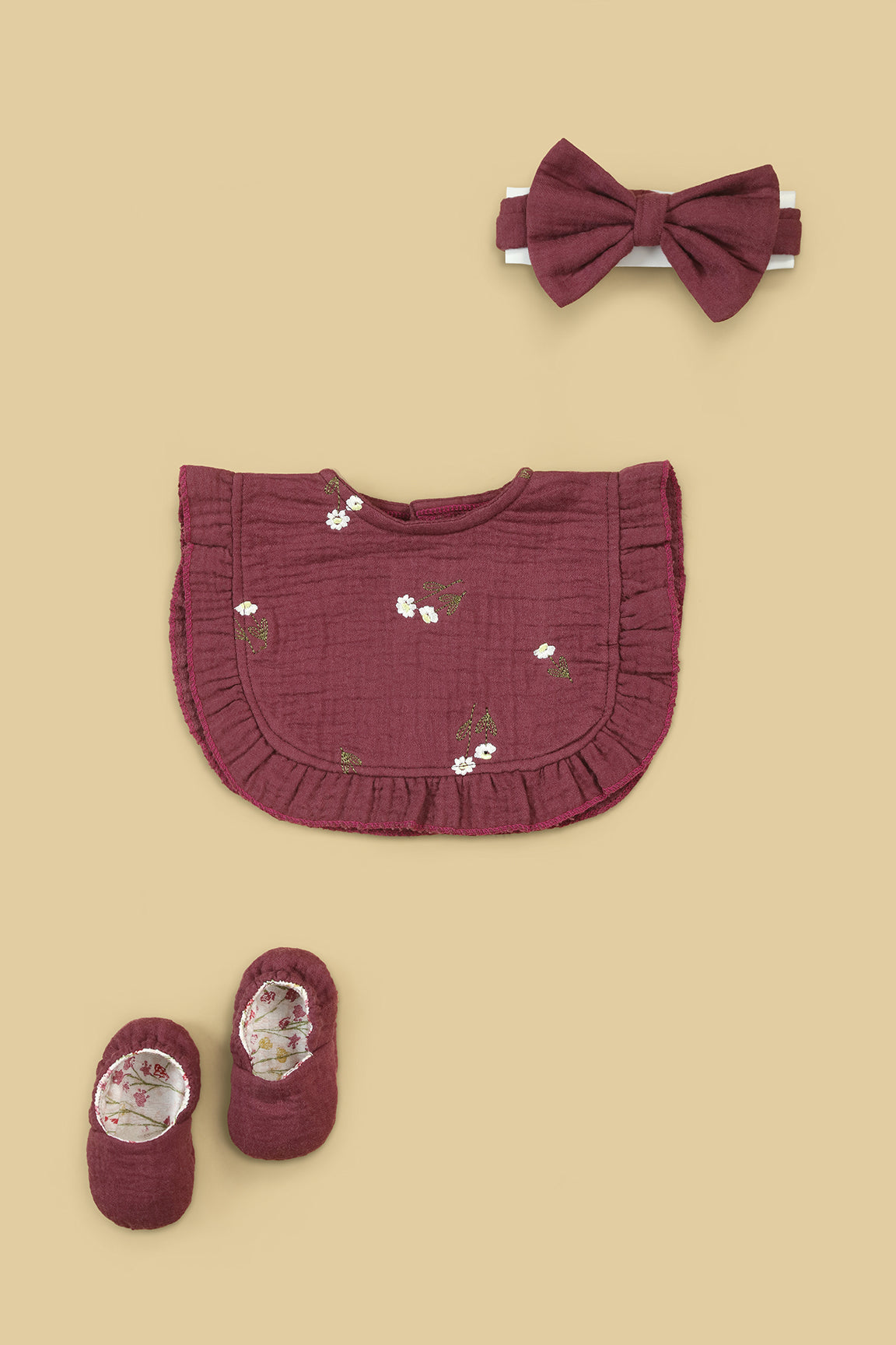 Plum Embroidered Muslin Baby Gift Set (Bow Headband, Shoes, Bib)