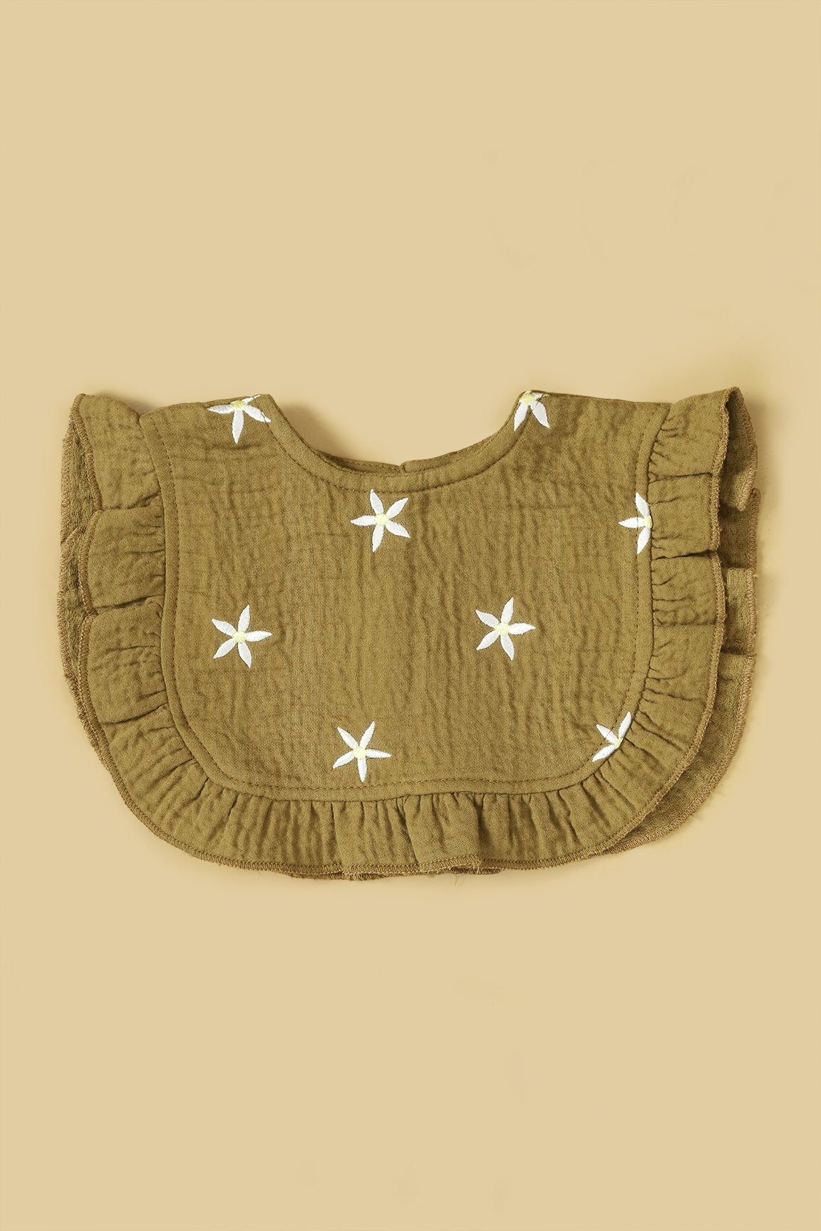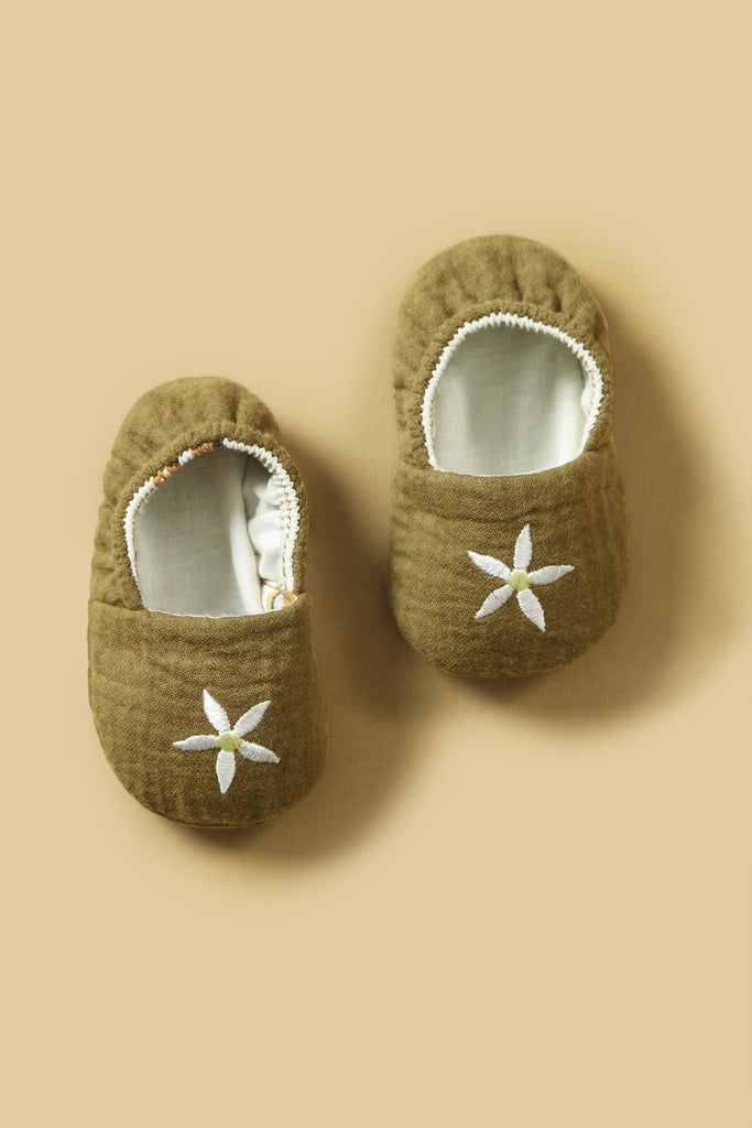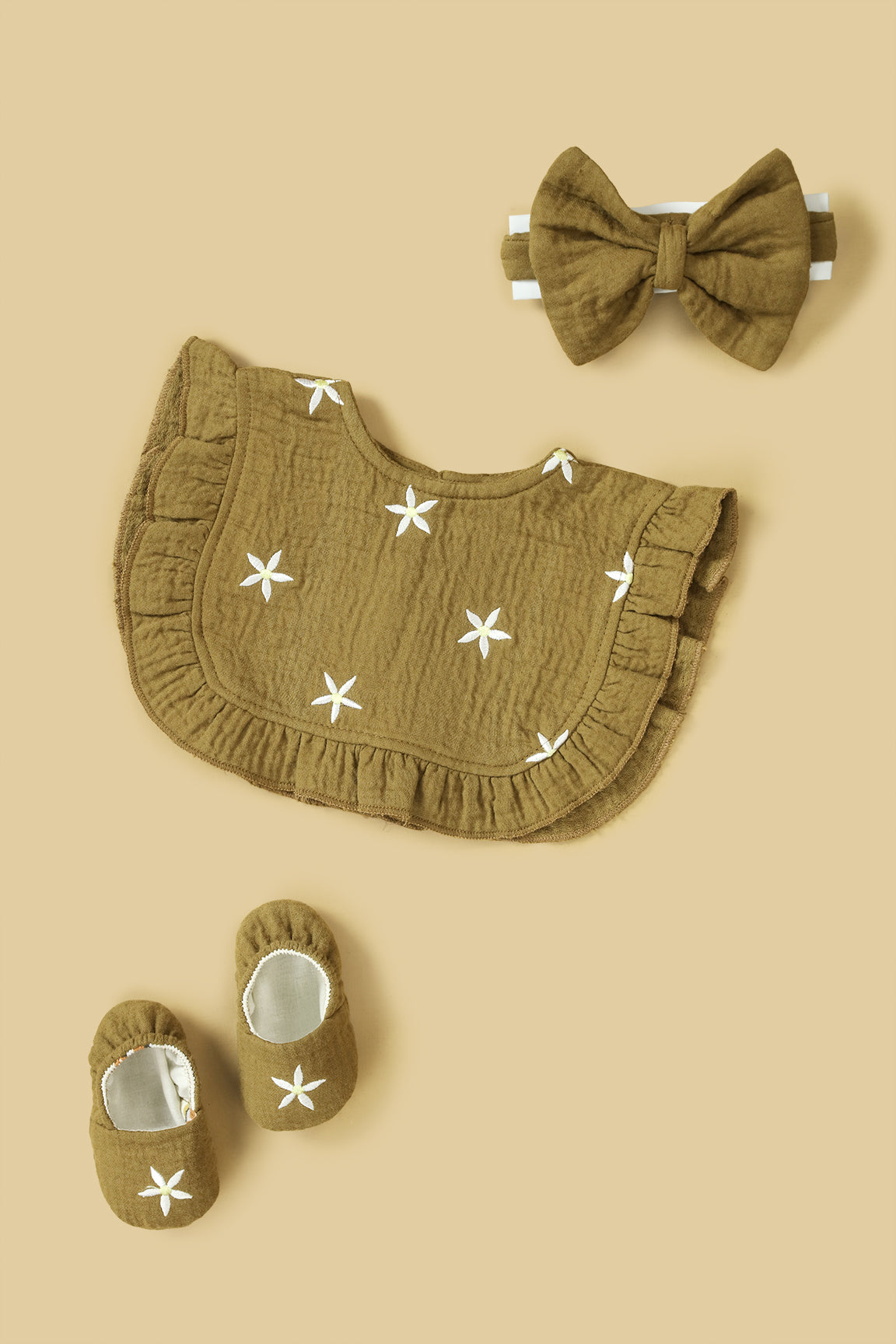 Olive Green Embroidered Muslin Baby Gift Set (Bow Headband, Shoes, Bib)