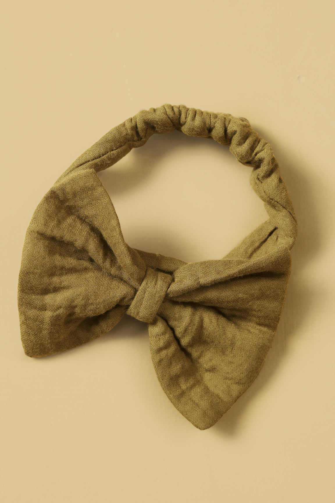 This charming baby accessory set is crafted from premium soft muslin fabric in a warm olive green shade. The set includes a ruffled muslin bib, a pair of matching soft-sole shoes, and a cute bow headband, all perfectly coordinated for a stylish newborn look. Perfect for daily wear, gifting, special events, or newborn photo-shoots, this set brings together comfort, softness, and adorable style.