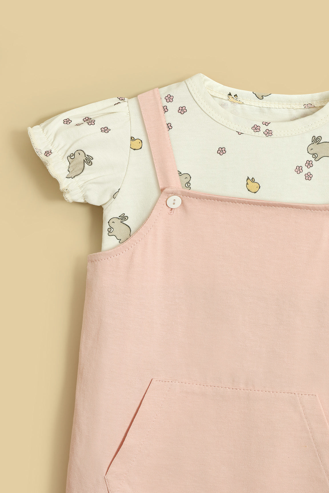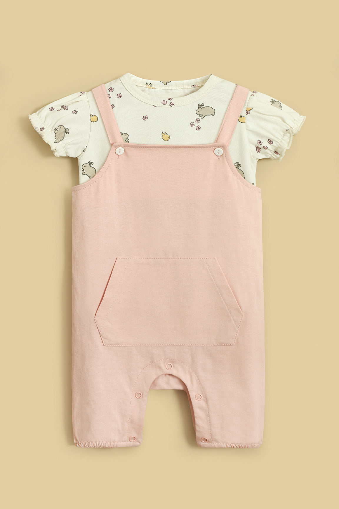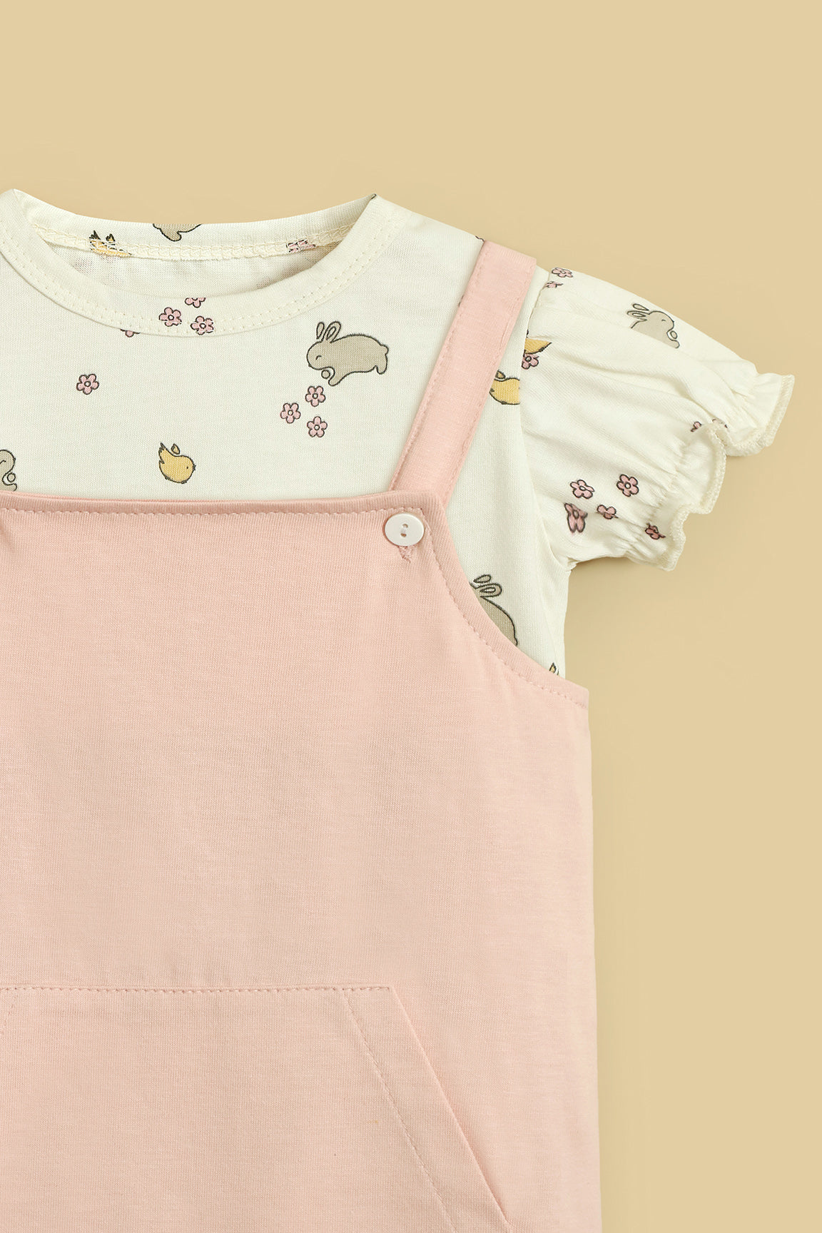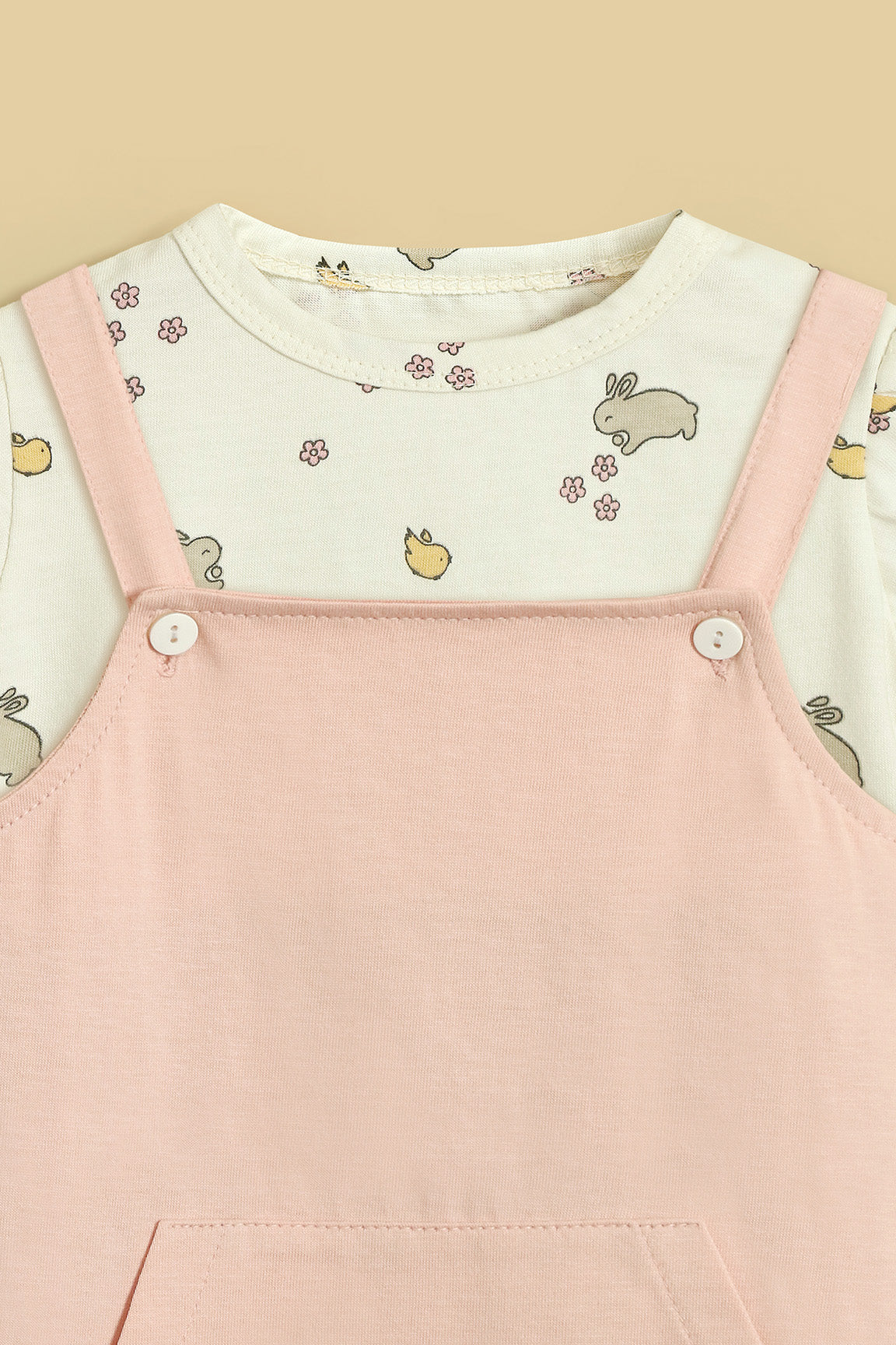 A 2-Piece Rabbit Set featuring an all-over rabbit printed bodysuit paired with a coordinating dungaree. It is crafted from breathable, high-quality cotton that is gentle on baby's skin.