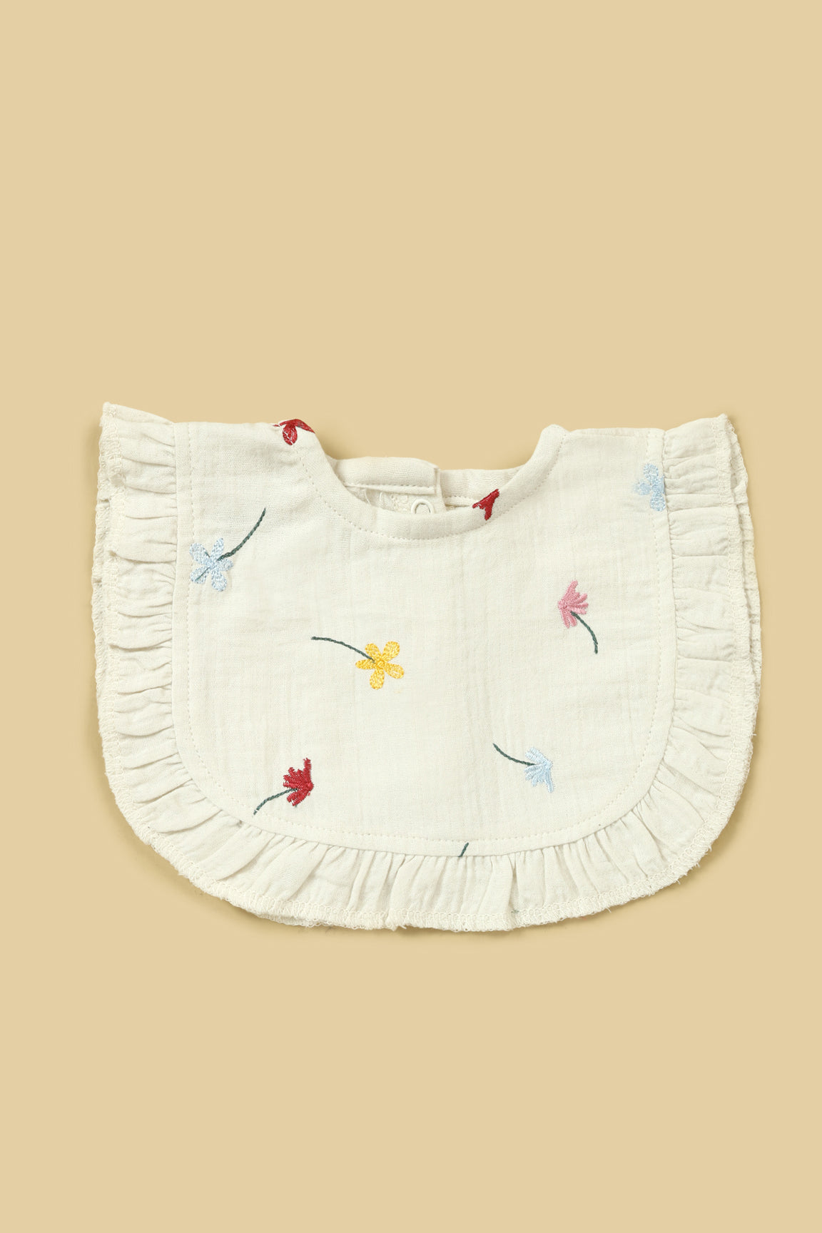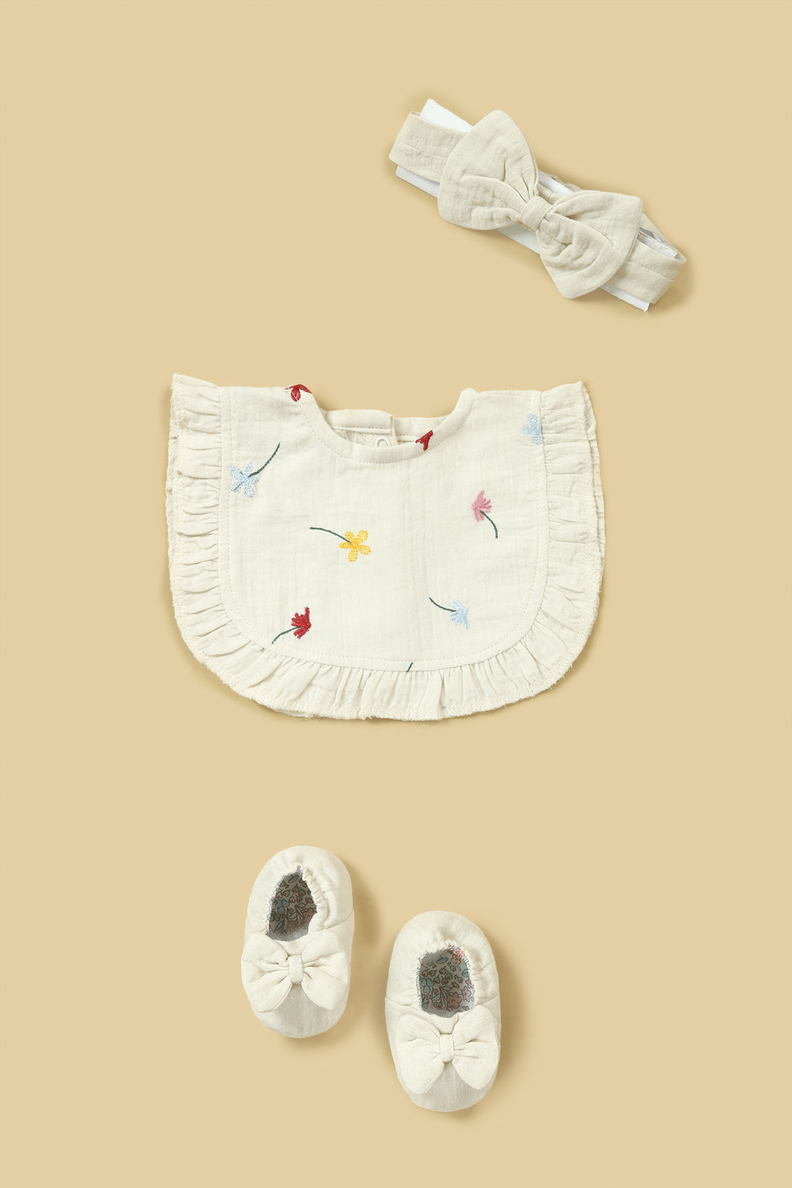 Floral Embroidered Muslin Baby Gift Set (Bow Headband, Shoes, Bib)