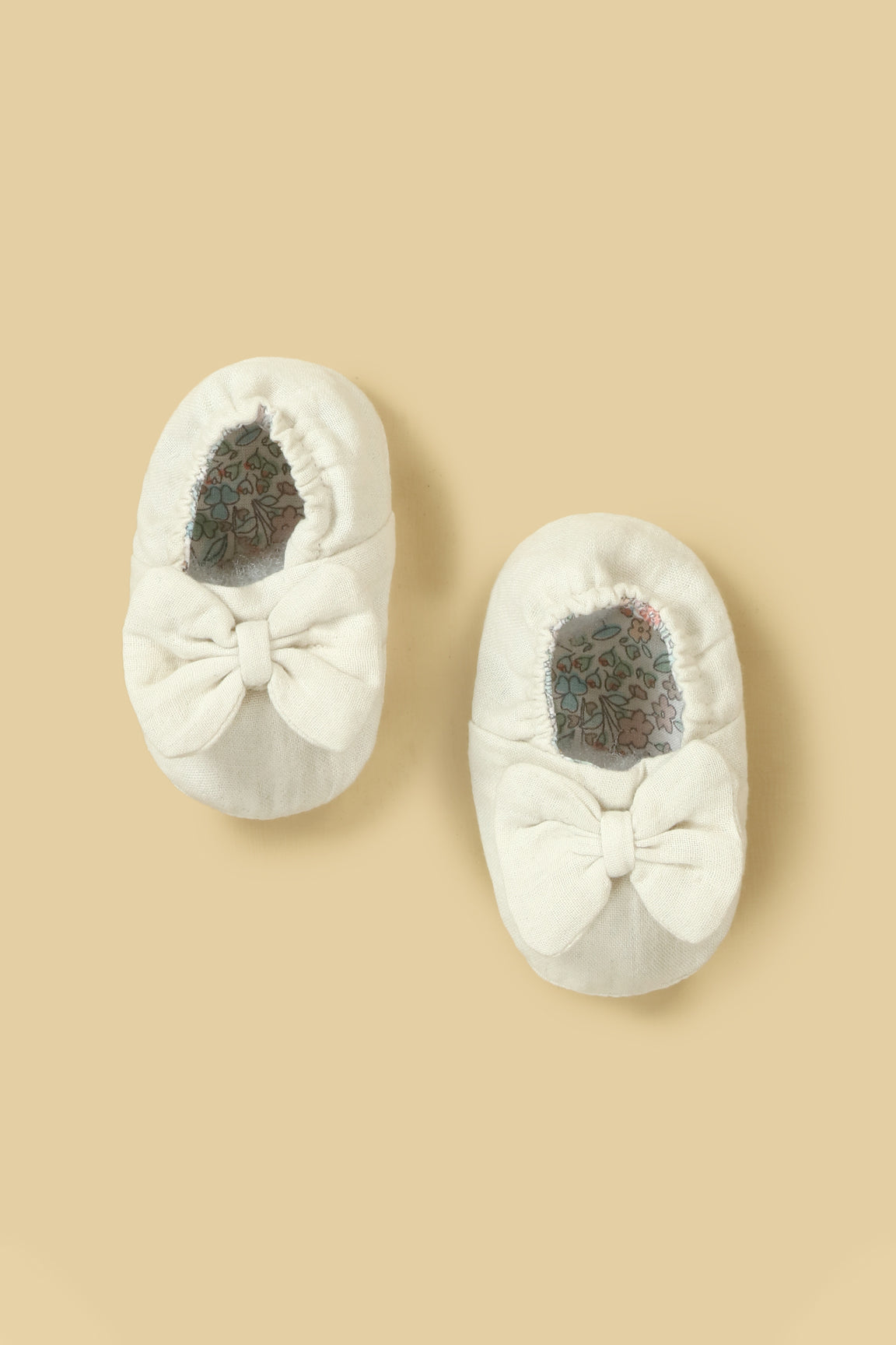 This charming baby accessory set is crafted from premium soft muslin fabric in a creamy shade. The set includes a ruffled muslin bib, a pair of matching soft-sole shoes, and a cute bow headband, all perfectly coordinated for a stylish newborn look. Perfect for daily wear, gifting, special events, or newborn photo-shoots, this set brings together comfort, softness, and adorable style.