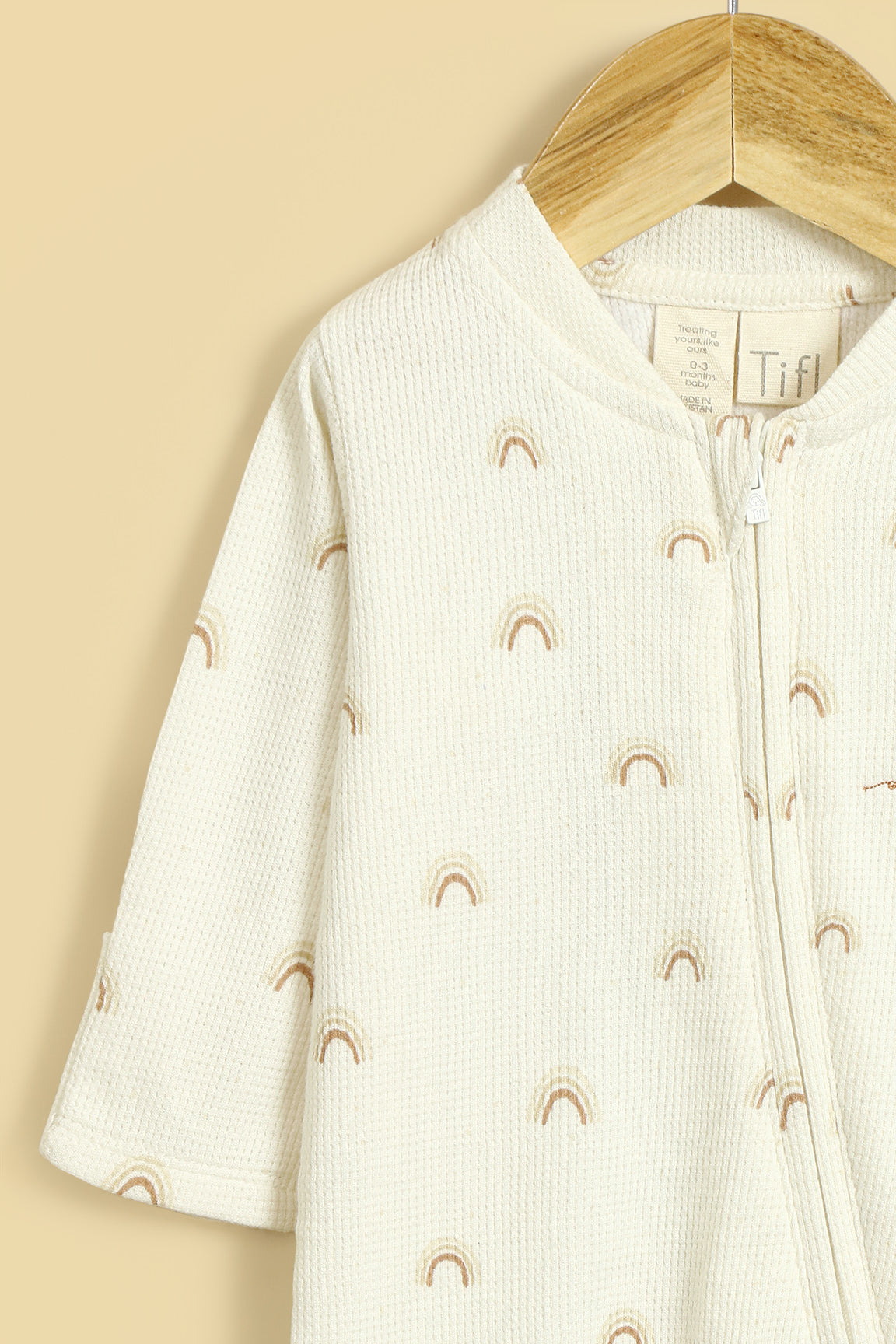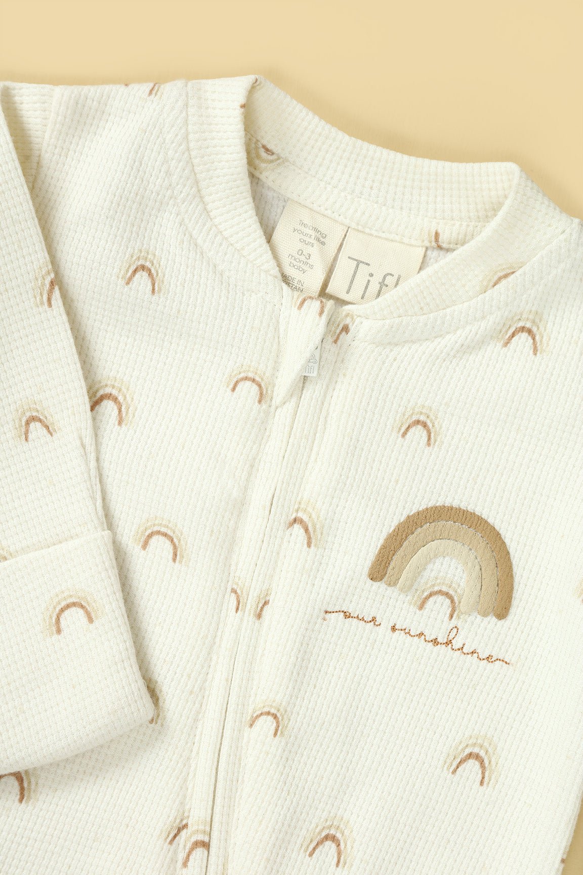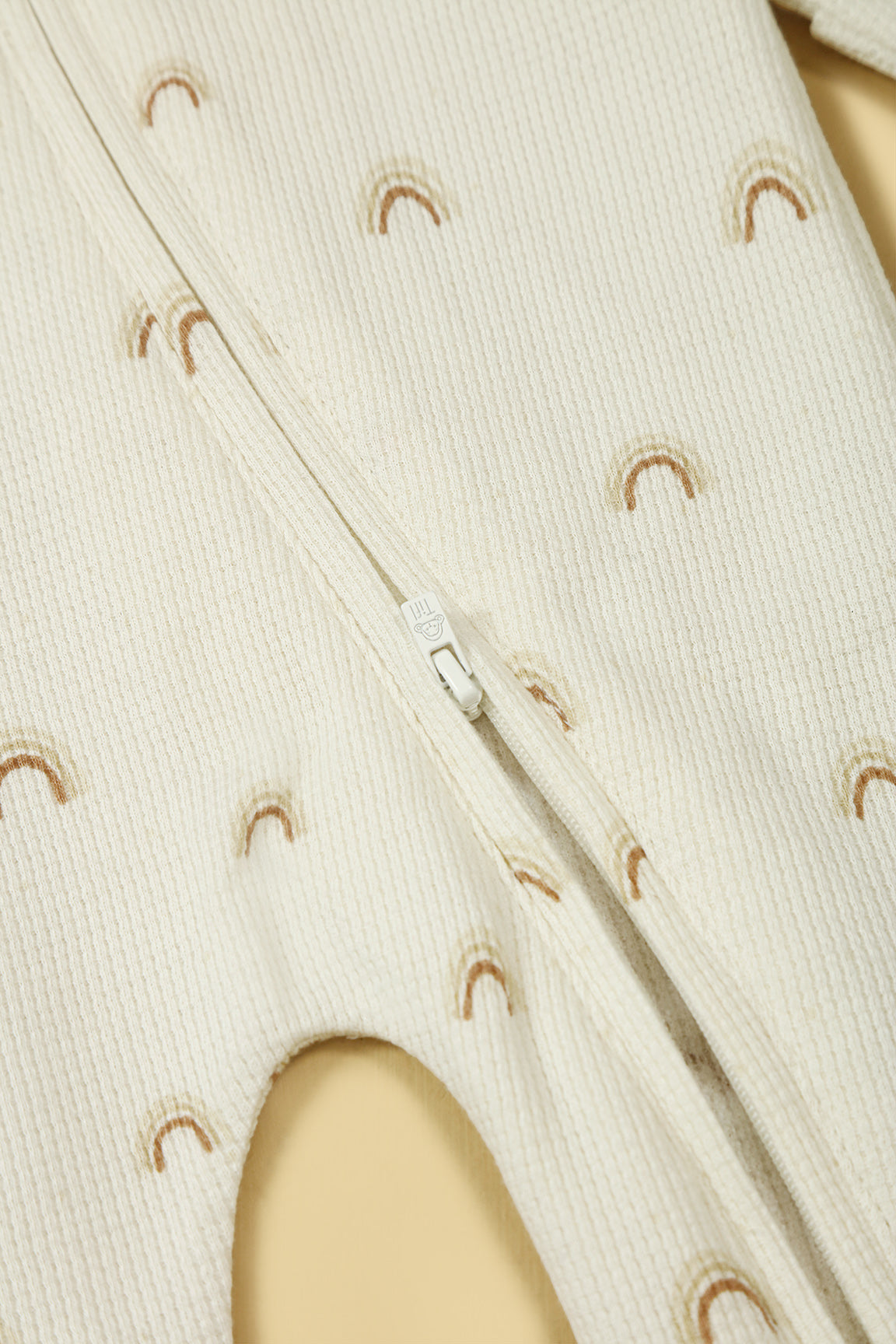 Bring joy to your baby's day with our rainbow waffle weave romper. Bursting with cheerful rainbow prints and made from Waffle Fabric, this adorable one-piece is perfect for cozy naps and colorful adventures.