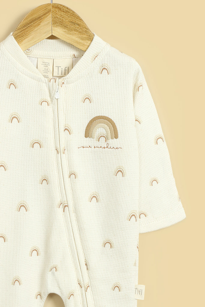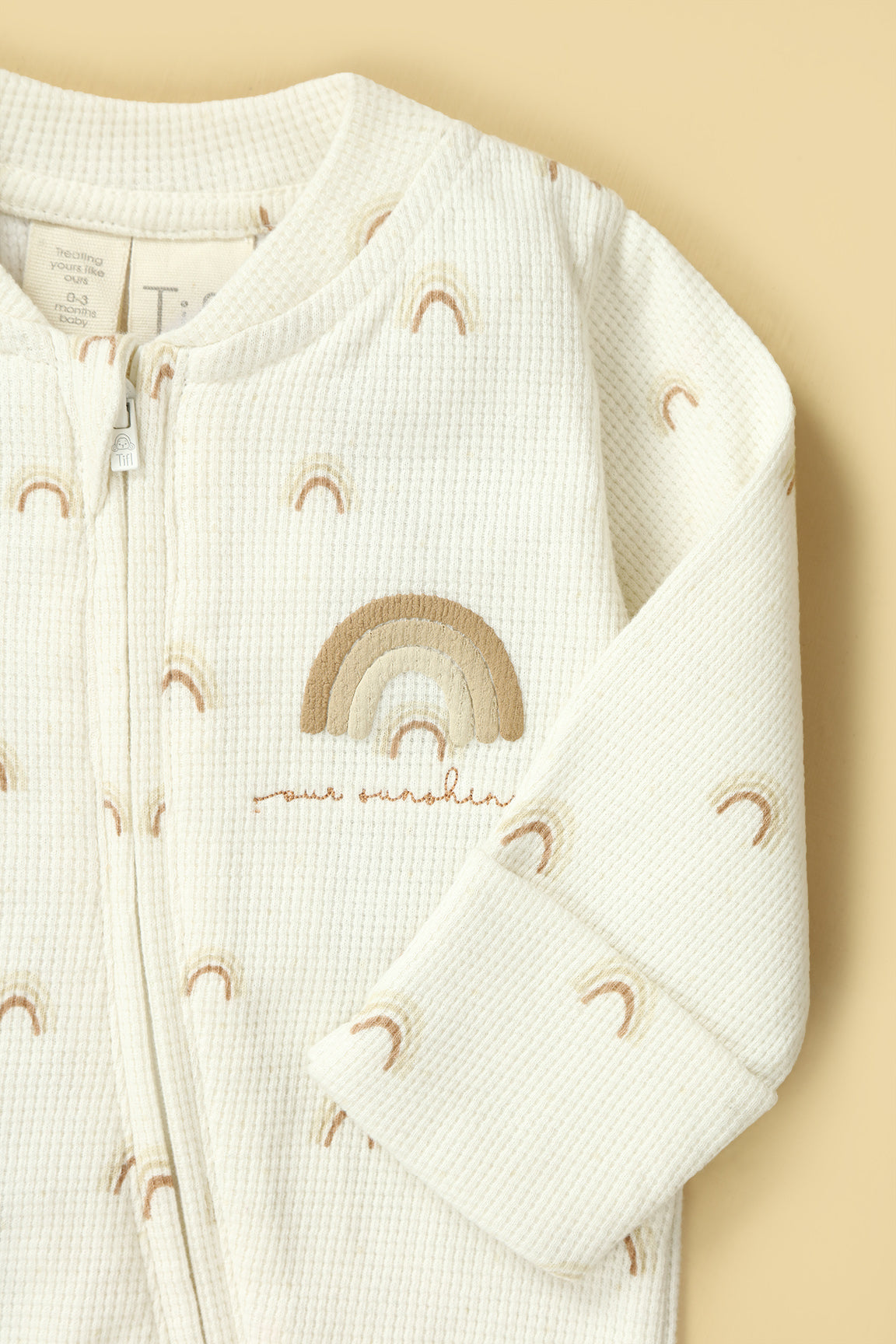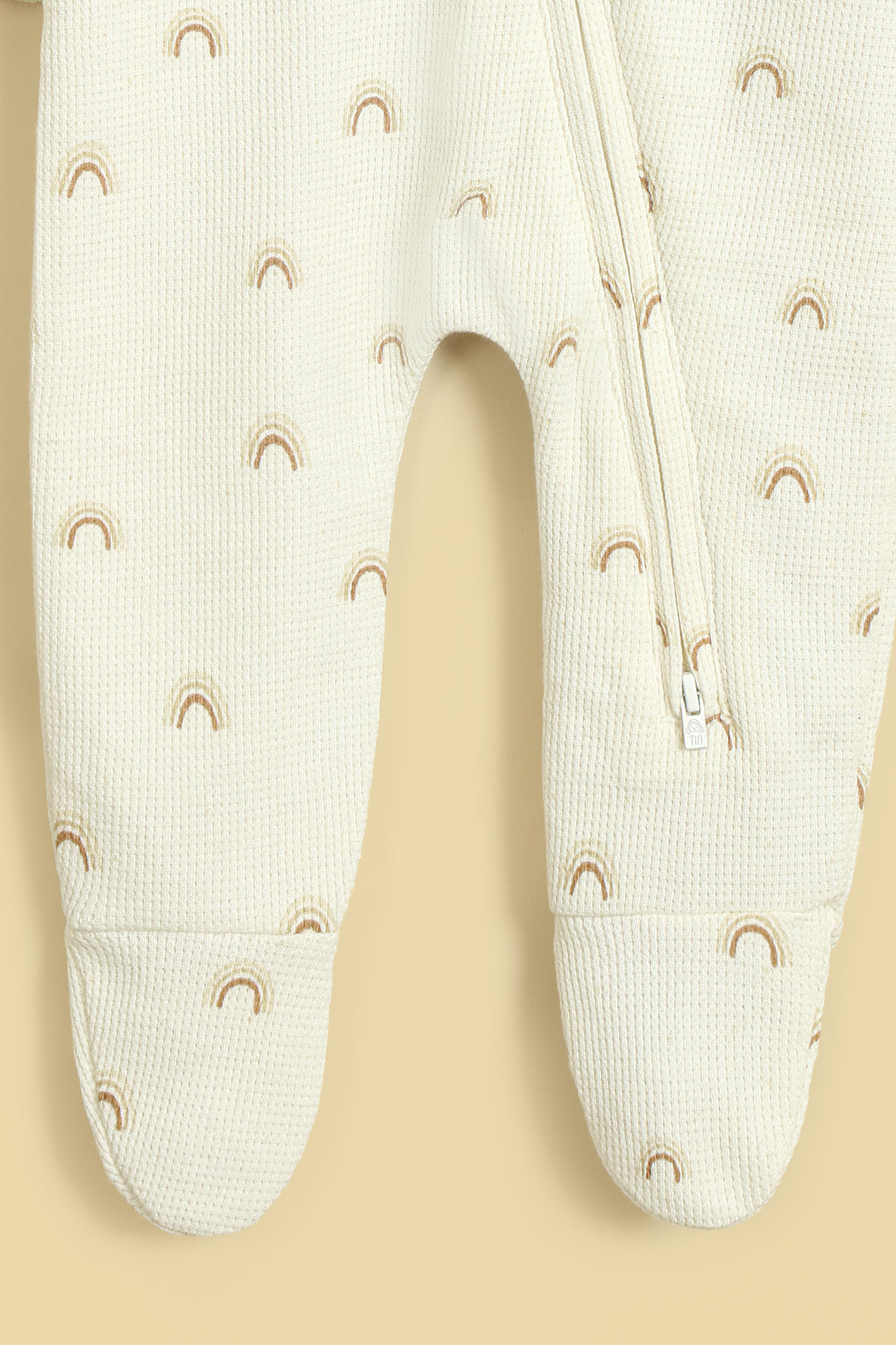 Bring joy to your baby's day with our rainbow waffle weave romper. Bursting with cheerful rainbow prints and made from Waffle Fabric, this adorable one-piece is perfect for cozy naps and colorful adventures.