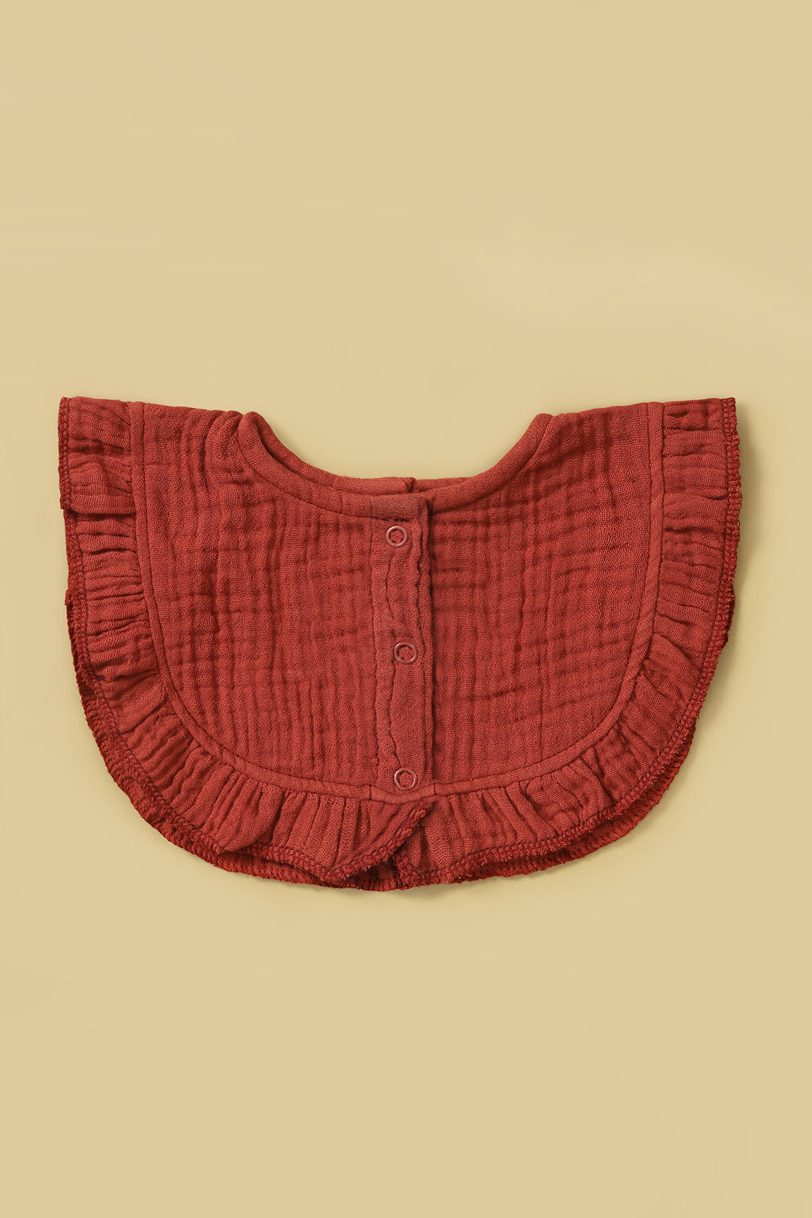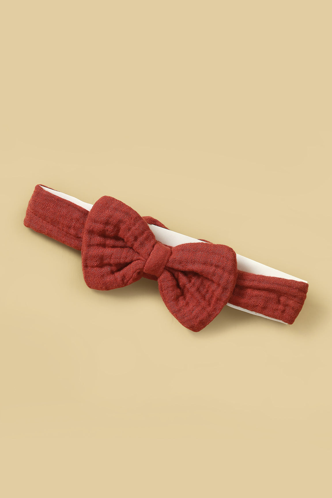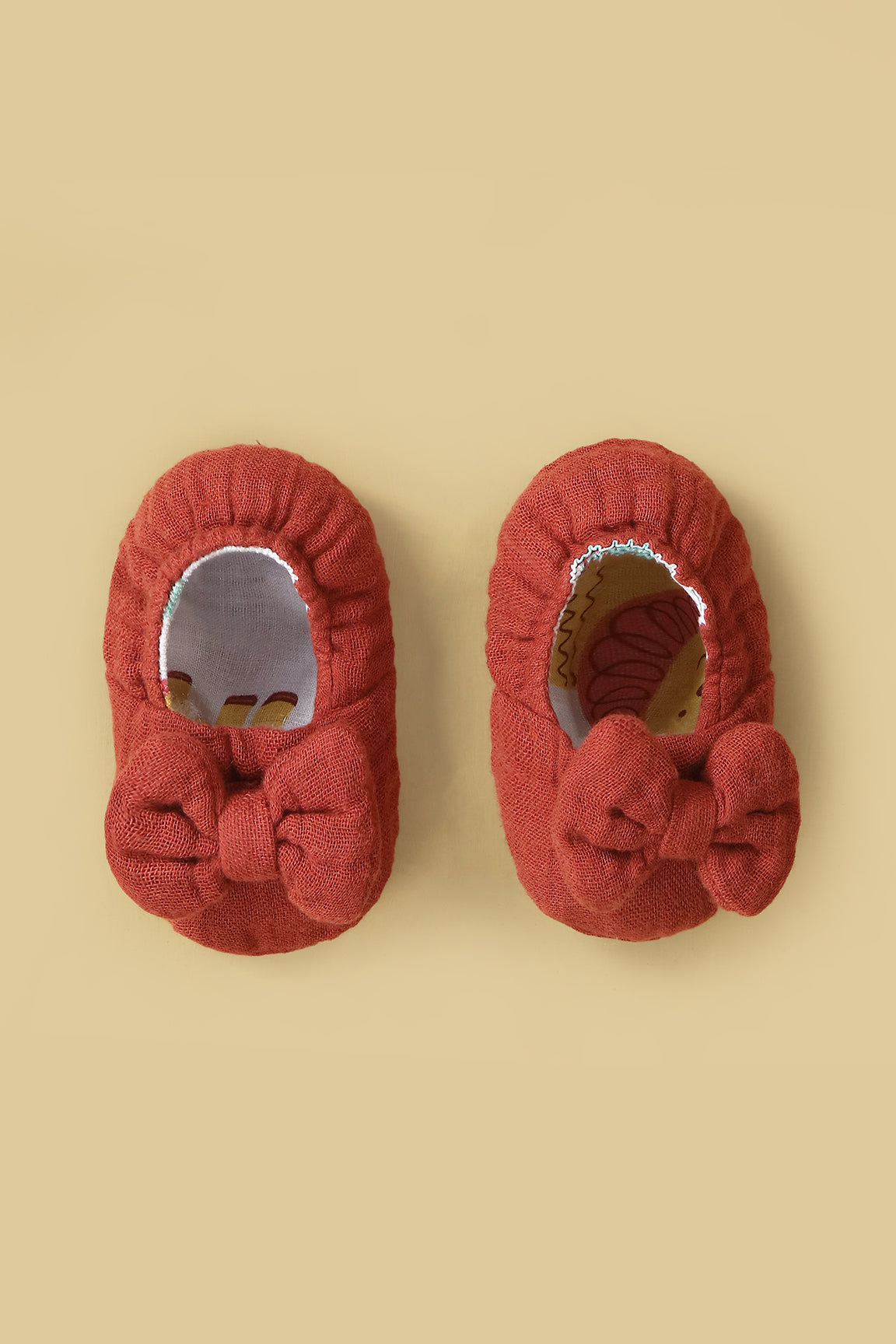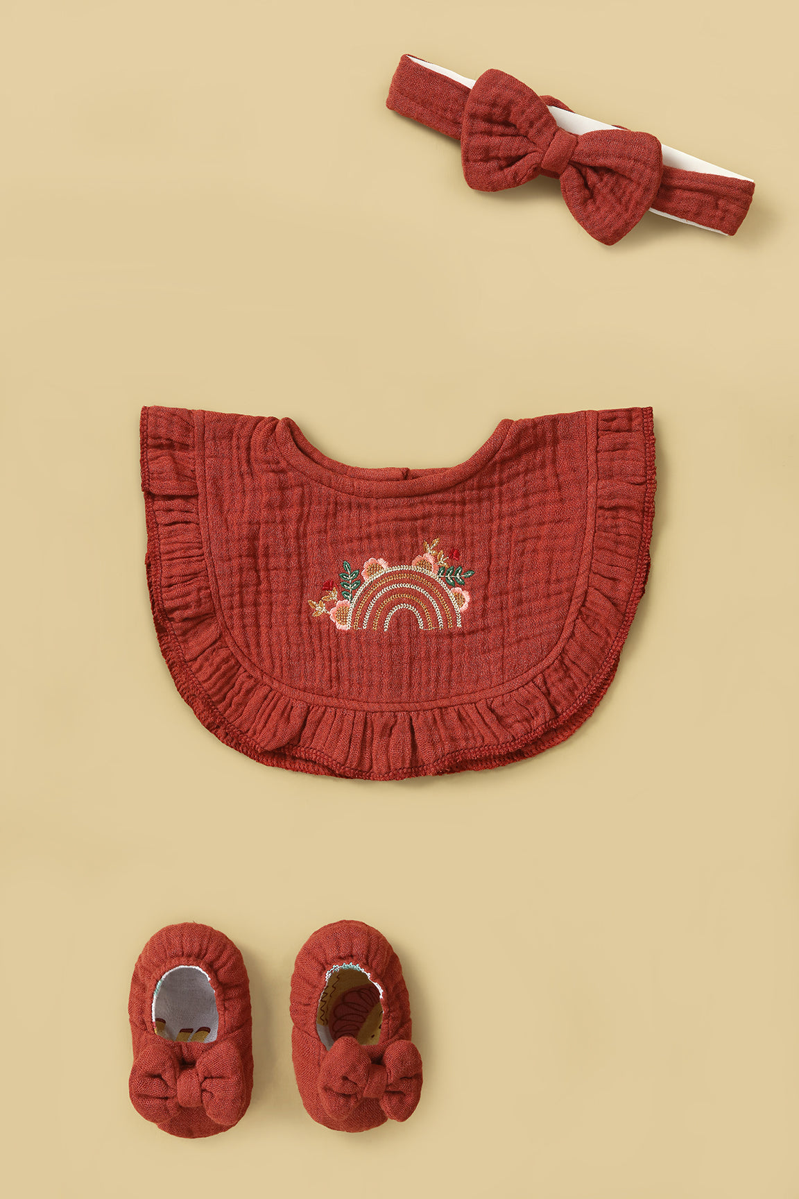 This charming baby accessory set is crafted from premium soft muslin fabric in a rust shade. The set includes a ruffled muslin bib, a pair of matching soft-sole shoes, and a cute bow headband, all perfectly coordinated for a stylish newborn look. Perfect for daily wear, gifting, special events, or newborn photo-shoots, this set brings together comfort, softness, and adorable style.