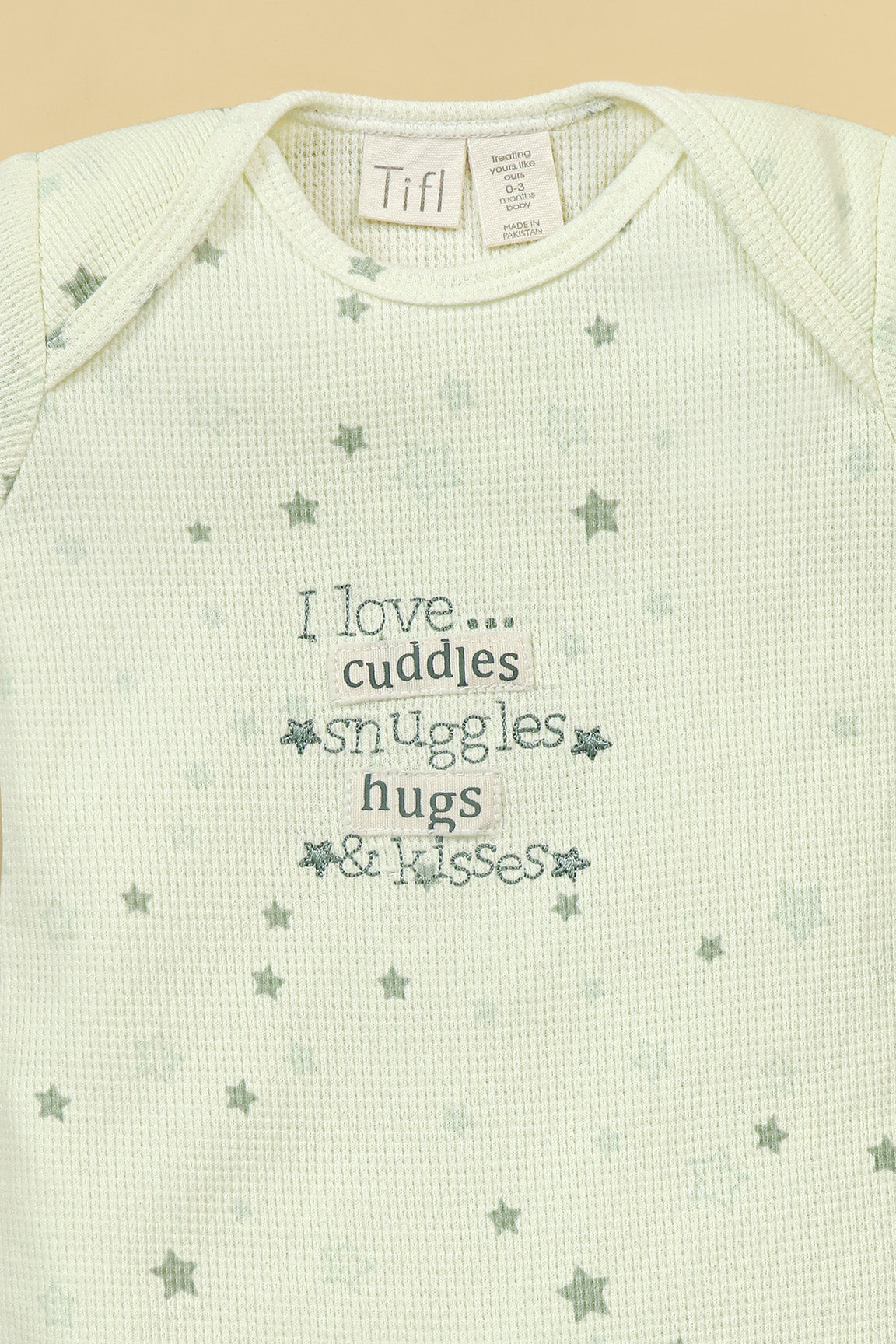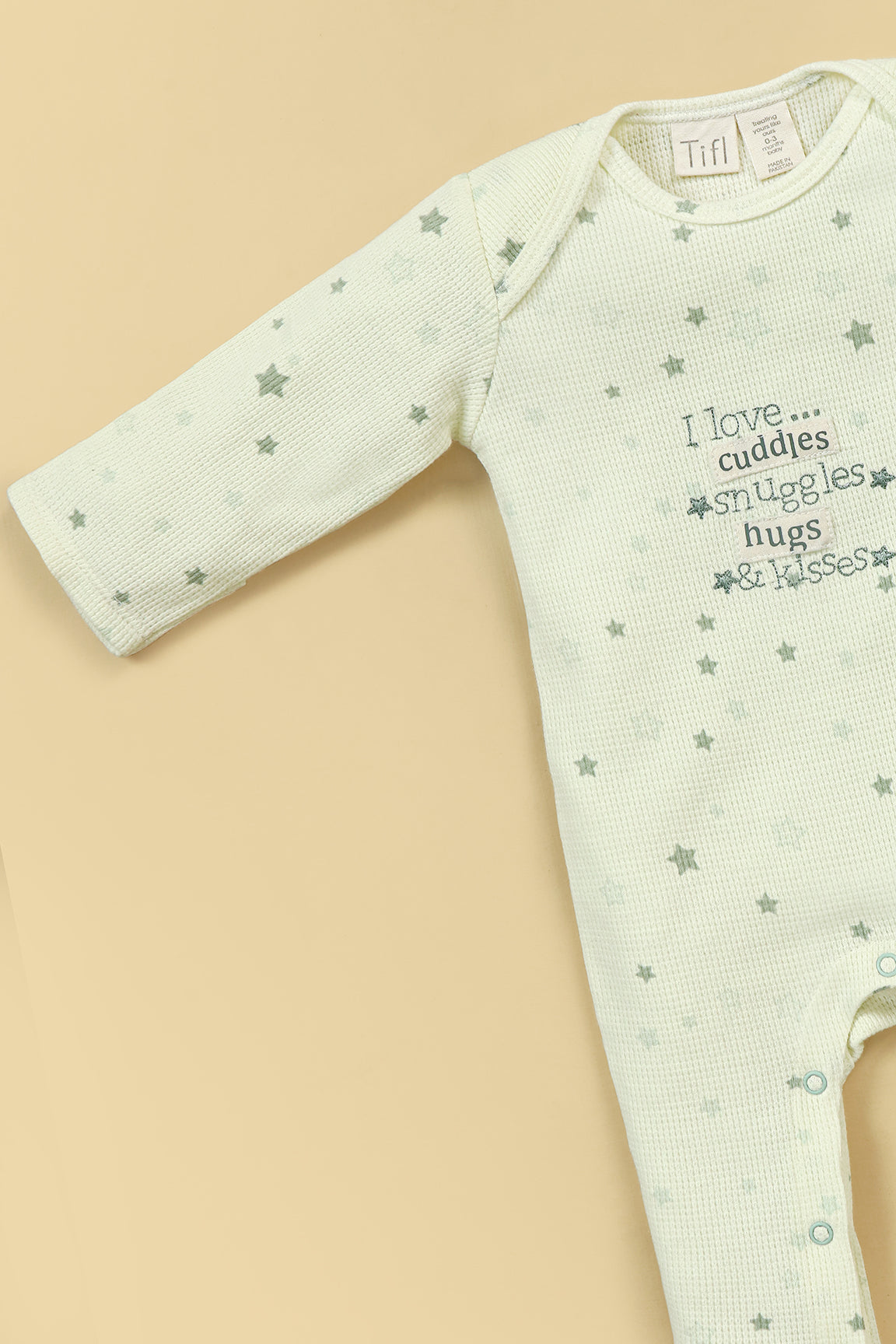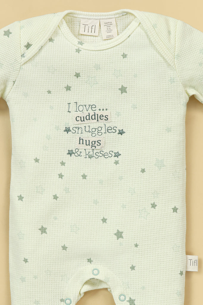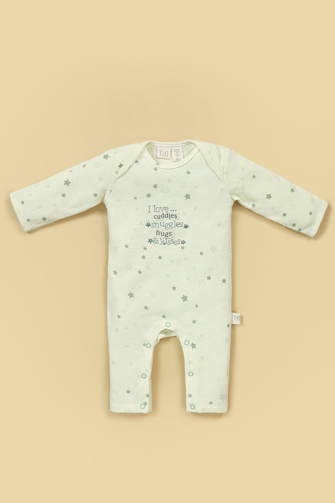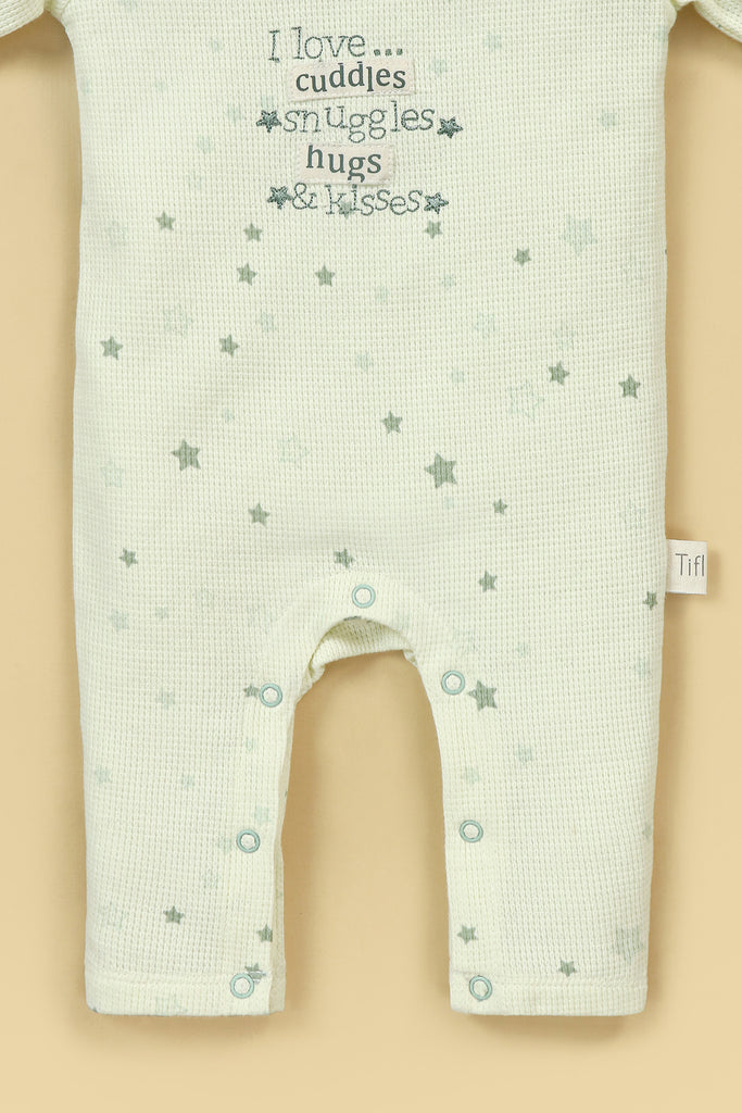 Drift into dreamy snuggles with our Starry Night Waffle Star baby romper—a cozy, full-sleeve romper made from soft waffle-knit fabric. Featuring a soothing mint hue, scattered star print, and an adorable message: "I love cuddles, snuggles, hugs & kisses", this one-piece is perfect for nap time, playtime, or cuddle time.