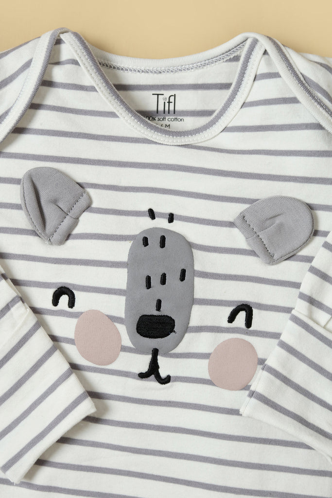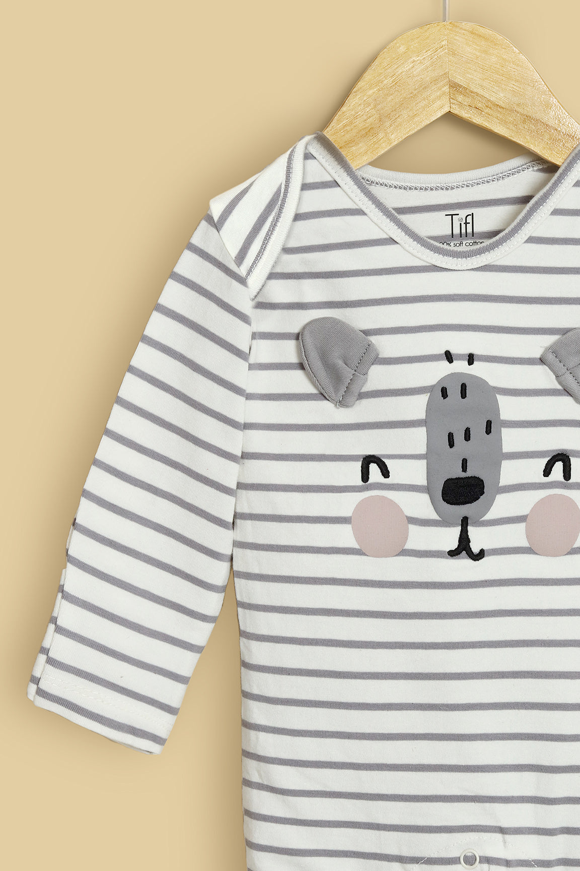 Crafted from soft jersey with Lycra, this set brings gentle stretch and breathable comfort to your little one’s everyday wear. Designed with bear stripe yarn dyed print and easy closures for quick changes — perfect for cozy naps and playful moments.