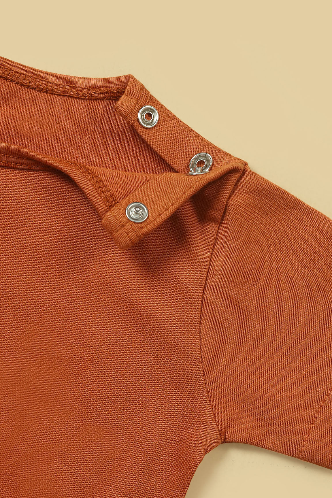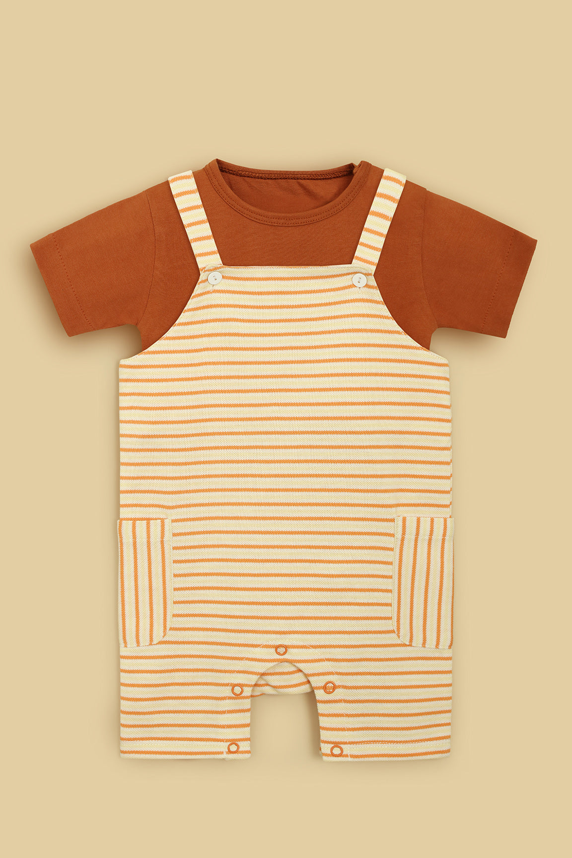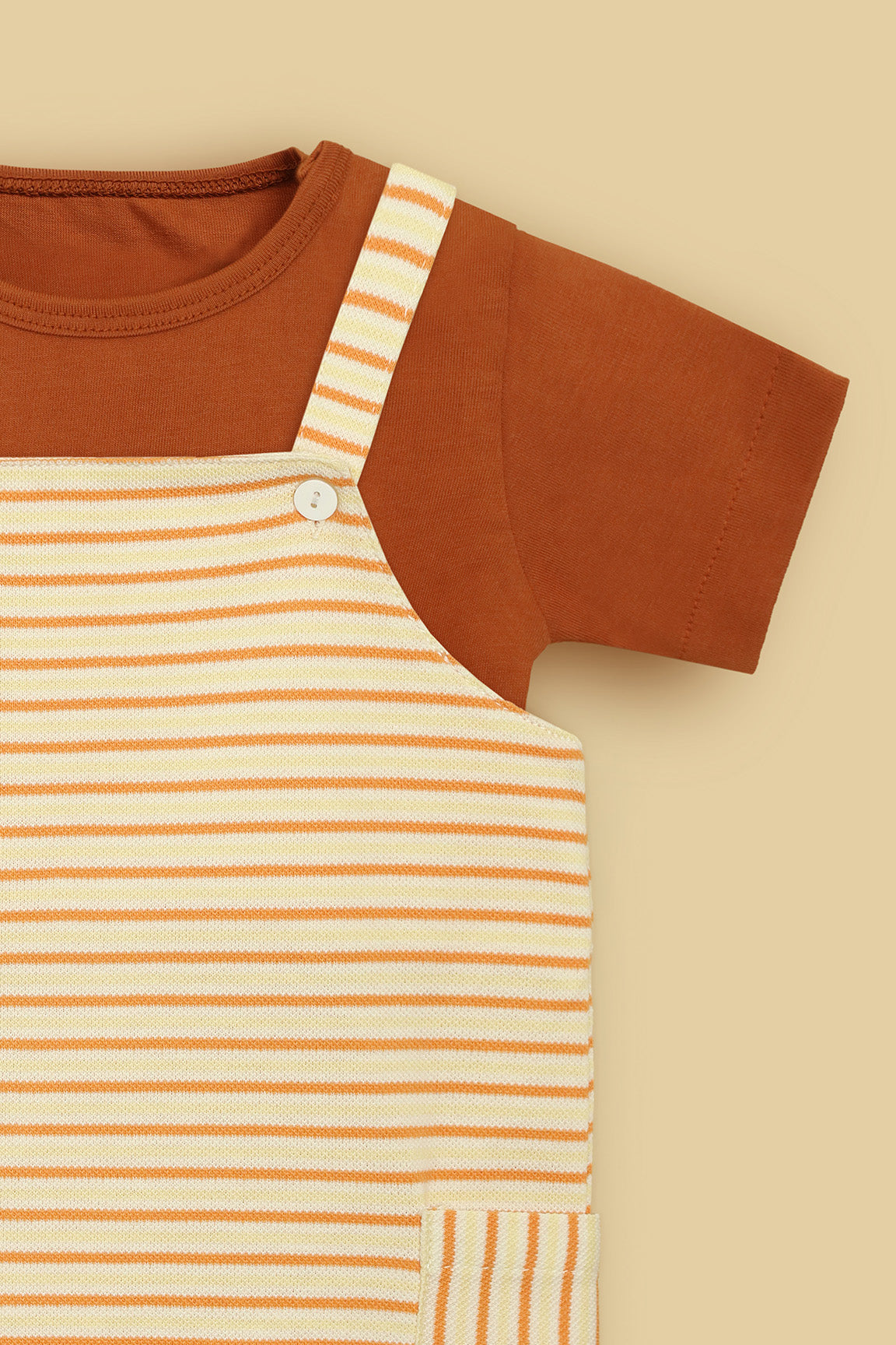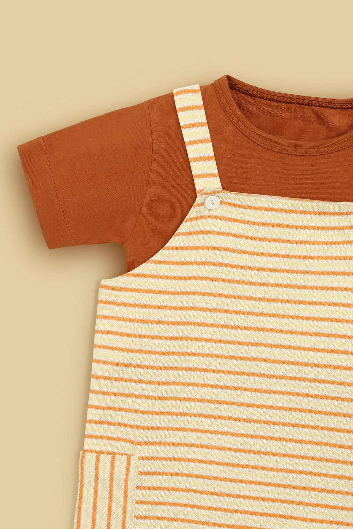 A 2-Piece Summer Set featuring a yarn-dyed striped dungaree paired with a solid rust-toned bodysuit. Designed with a relaxed, roomy fit through the hips and adjustable button fastened straps. It is crafted from breathable, high-quality cotton that is gentle on baby's skin.