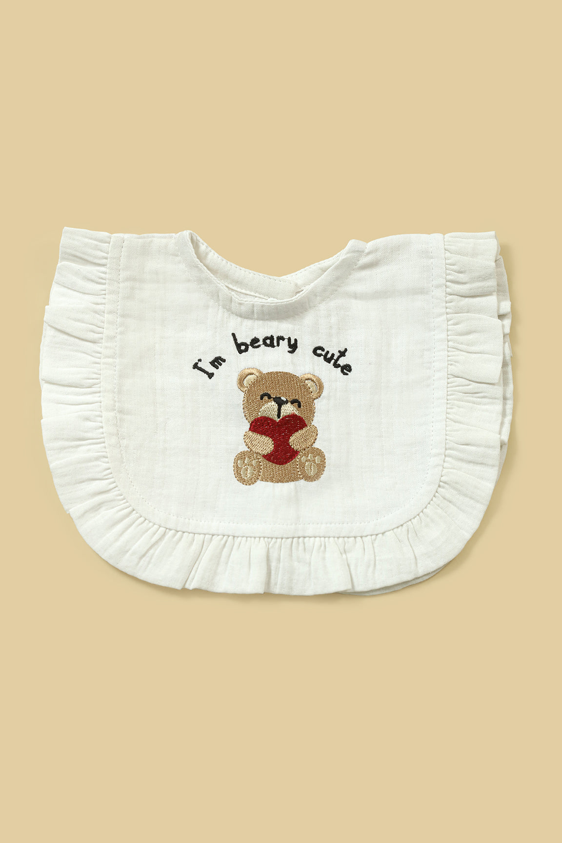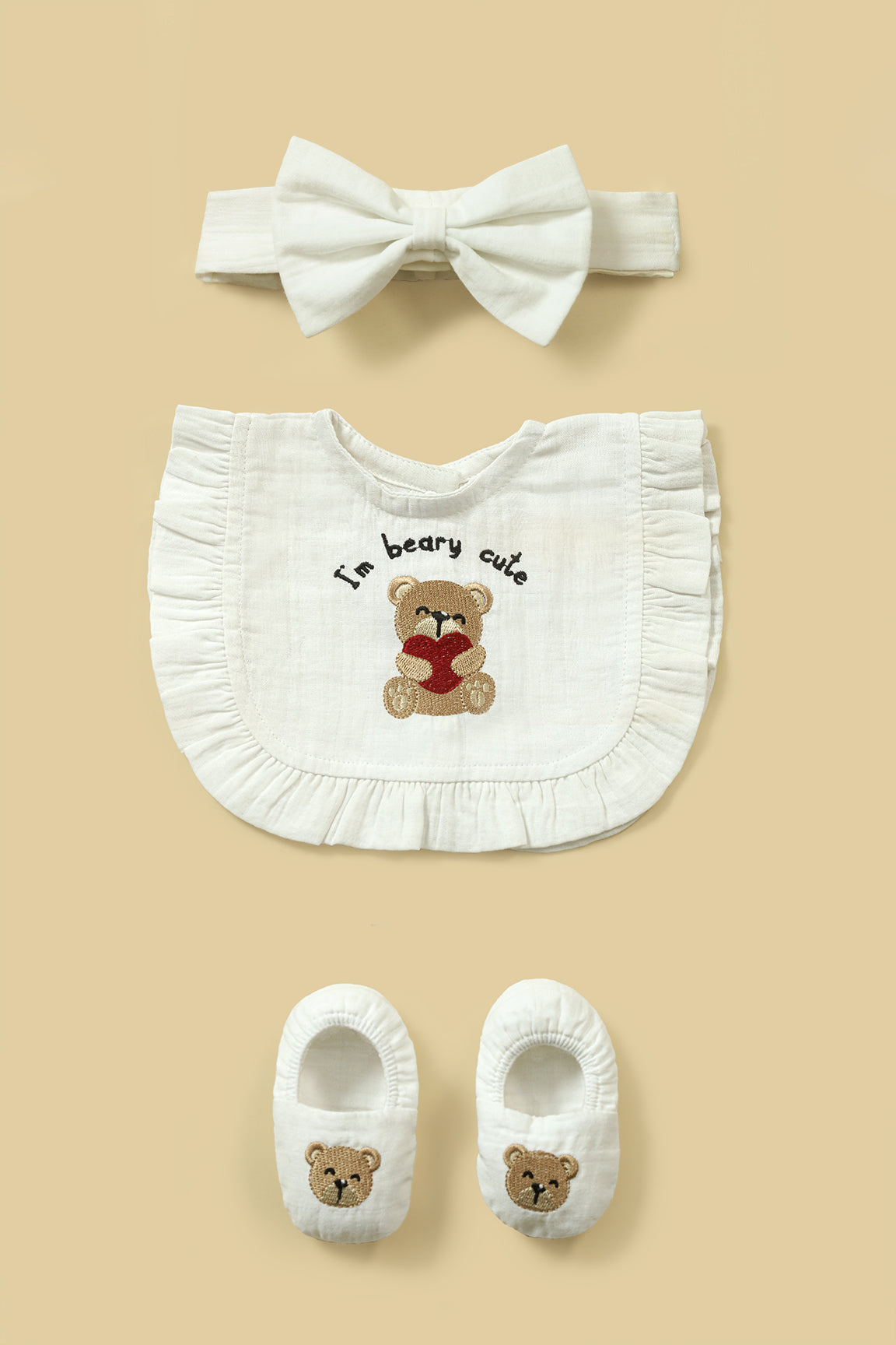 Bear Embroidered Muslin Baby Gift Set (Bow Headband, Shoes, Bib)