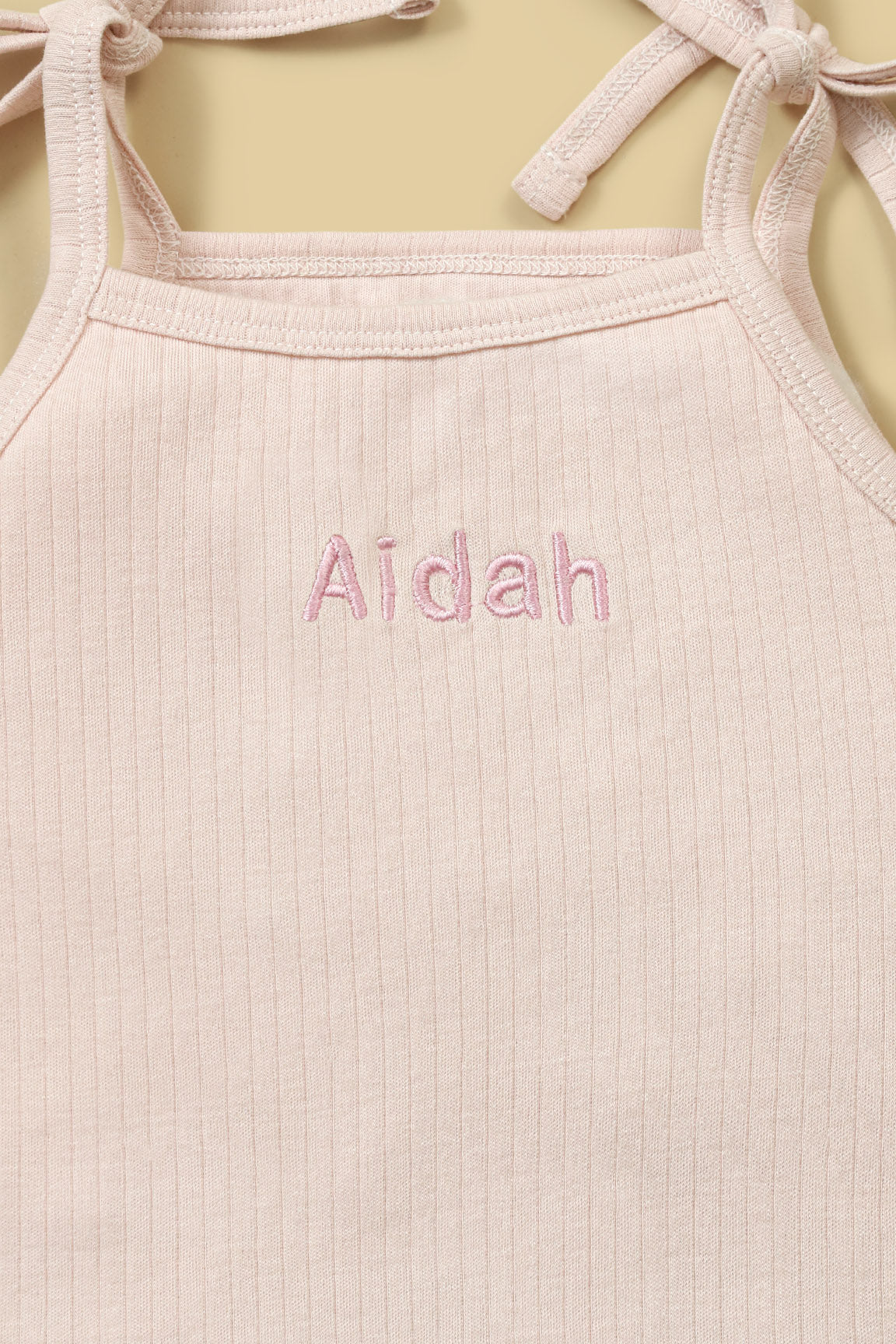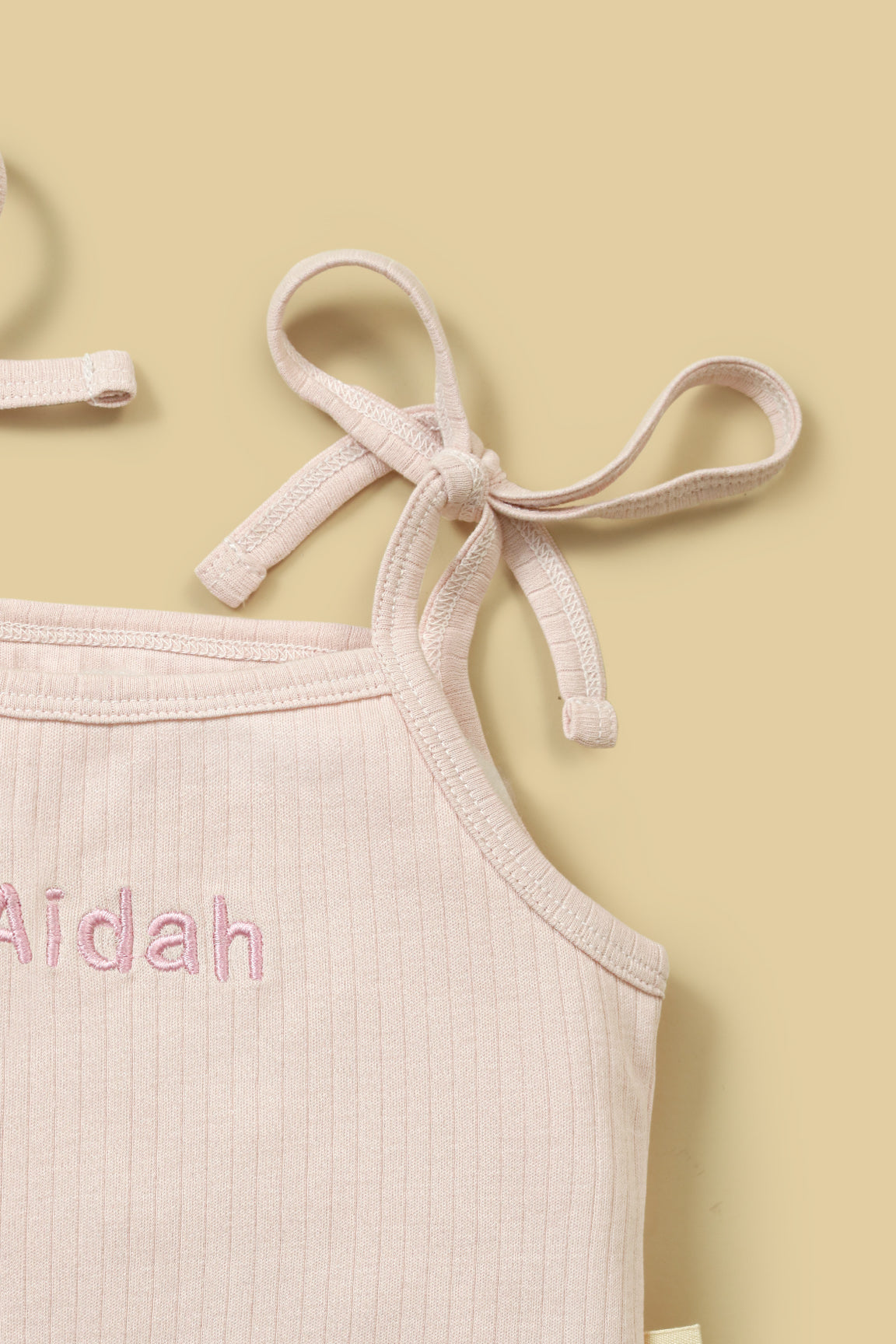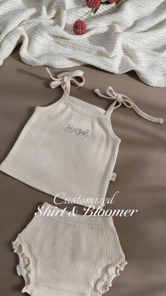 Dress your little one in soft elegance with our customized baby clothing set. This adorable two-piece outfit features a sleeveless ribbed top with charming shoulder tie bows and a delicate personalized name embroidery on the front. The matching bloomer-style shorts are designed with soft elastic waistband and ensuring both comfort and style.