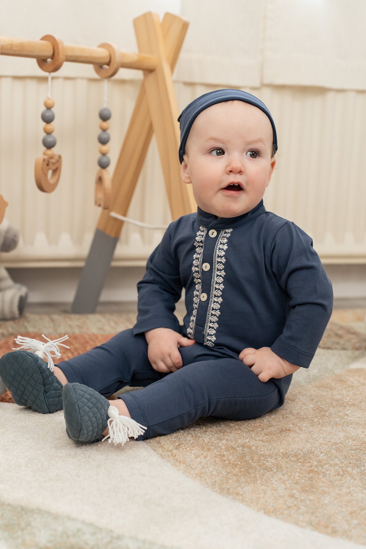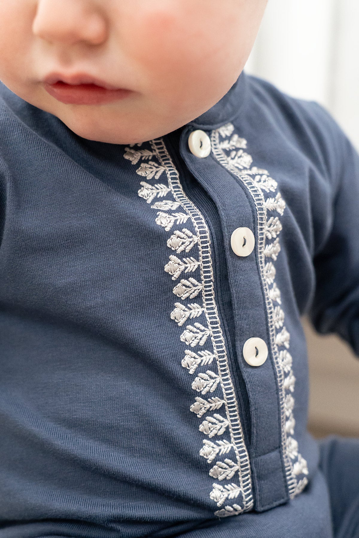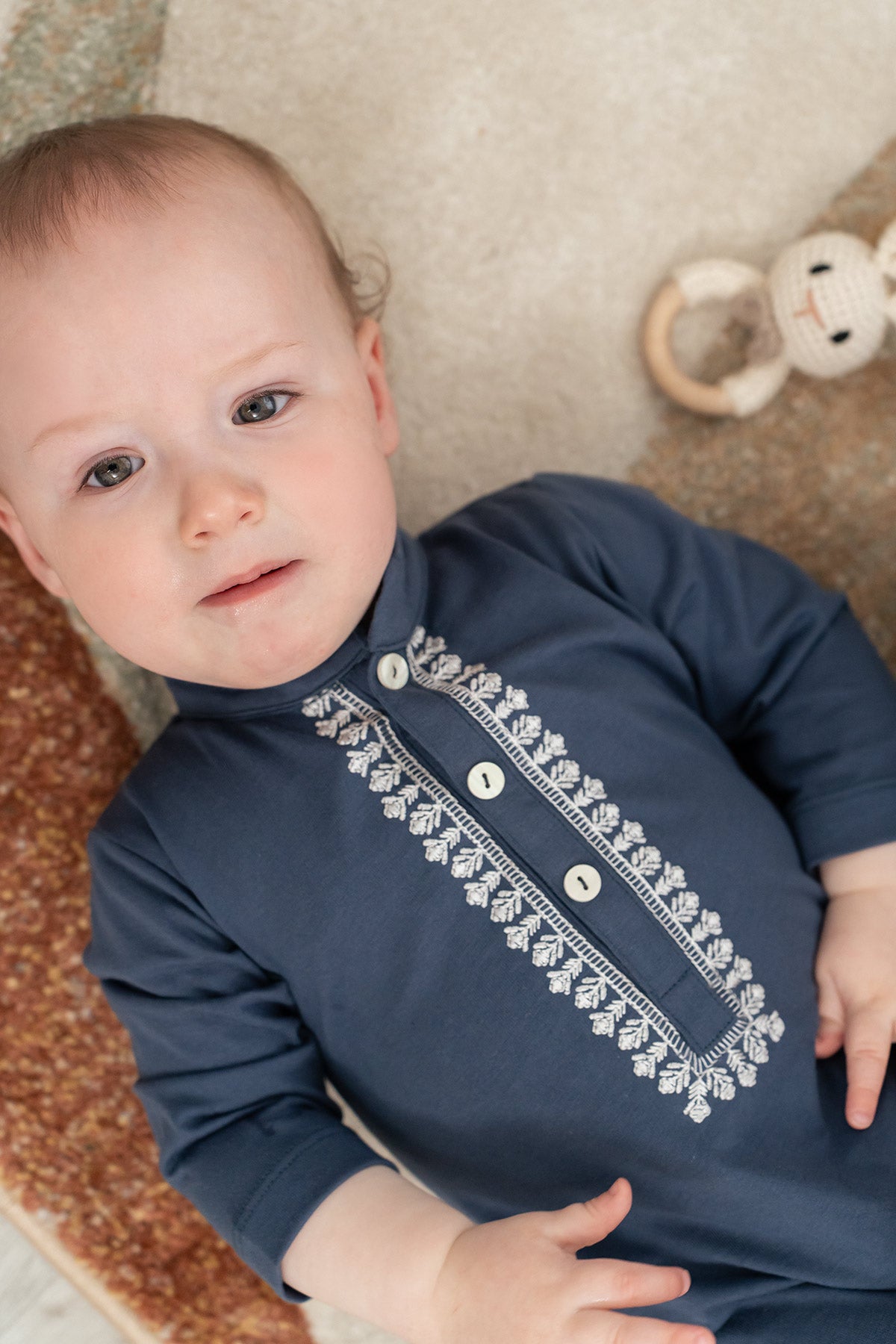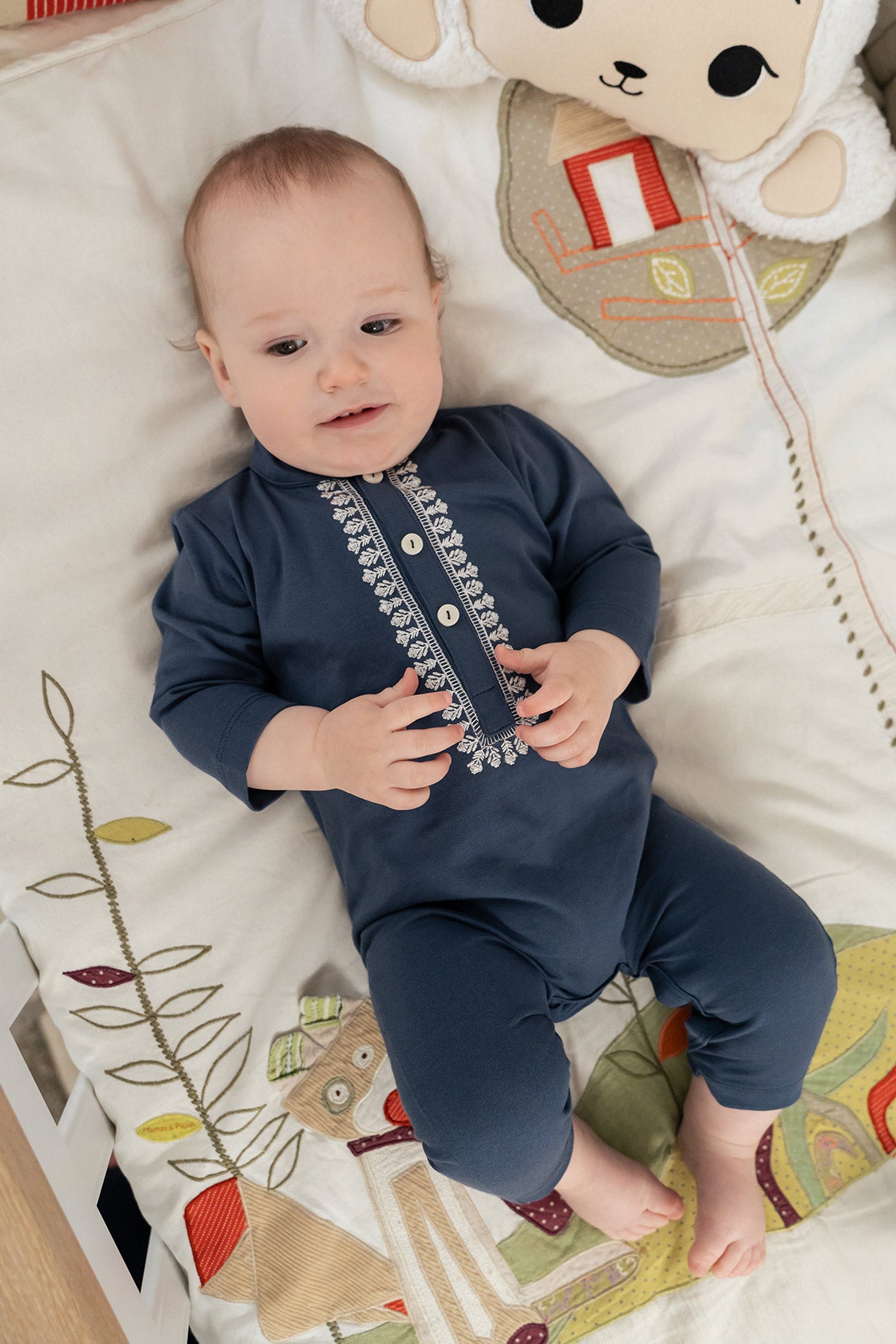 Crafted from soft knitted cotton along with our signature embroidery. featuring front placket with snap button detailing makes it perfect for babies on Eid. The relaxed fit and hidden button at bottom make diaper changes quick and easy.
