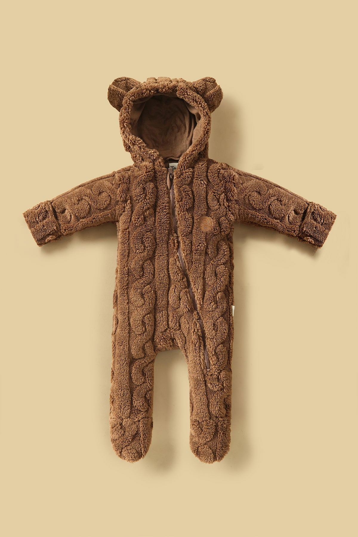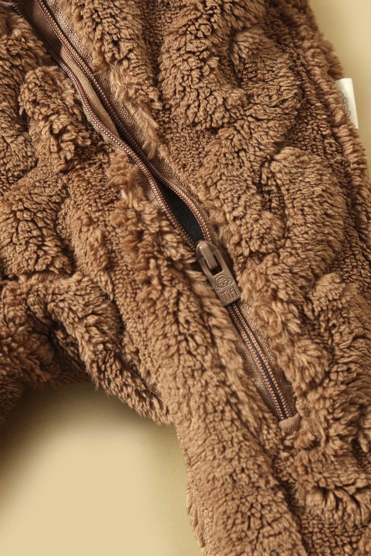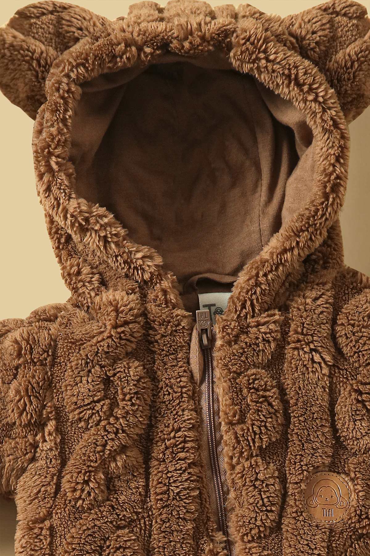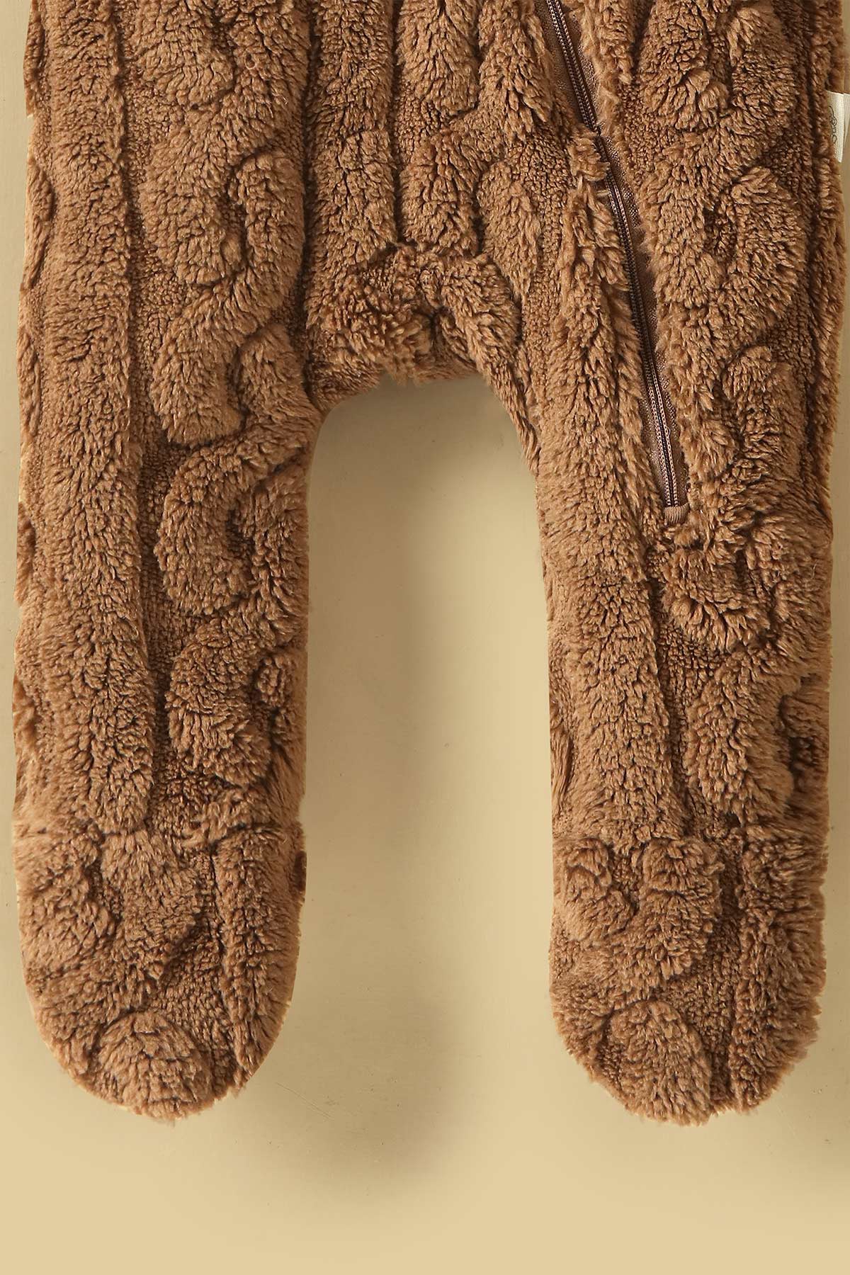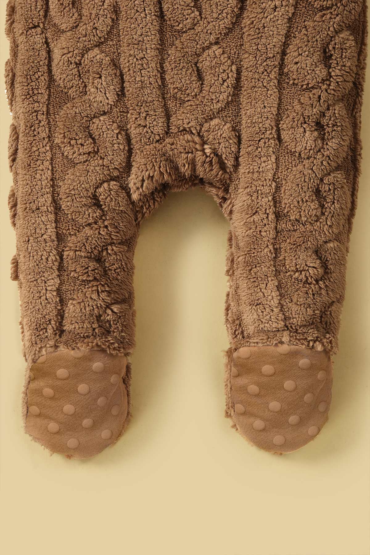 This cozy baby upper features a slider zipper for easy wear. Made from knotted fleece with a comfortable single jersey inner lining, it keeps your little one warm and gentle on the skin. Also has a hood for warmth, zip guard flap, and anti-slip feet to help your baby move easily.