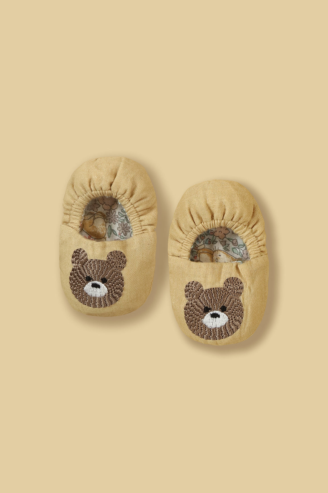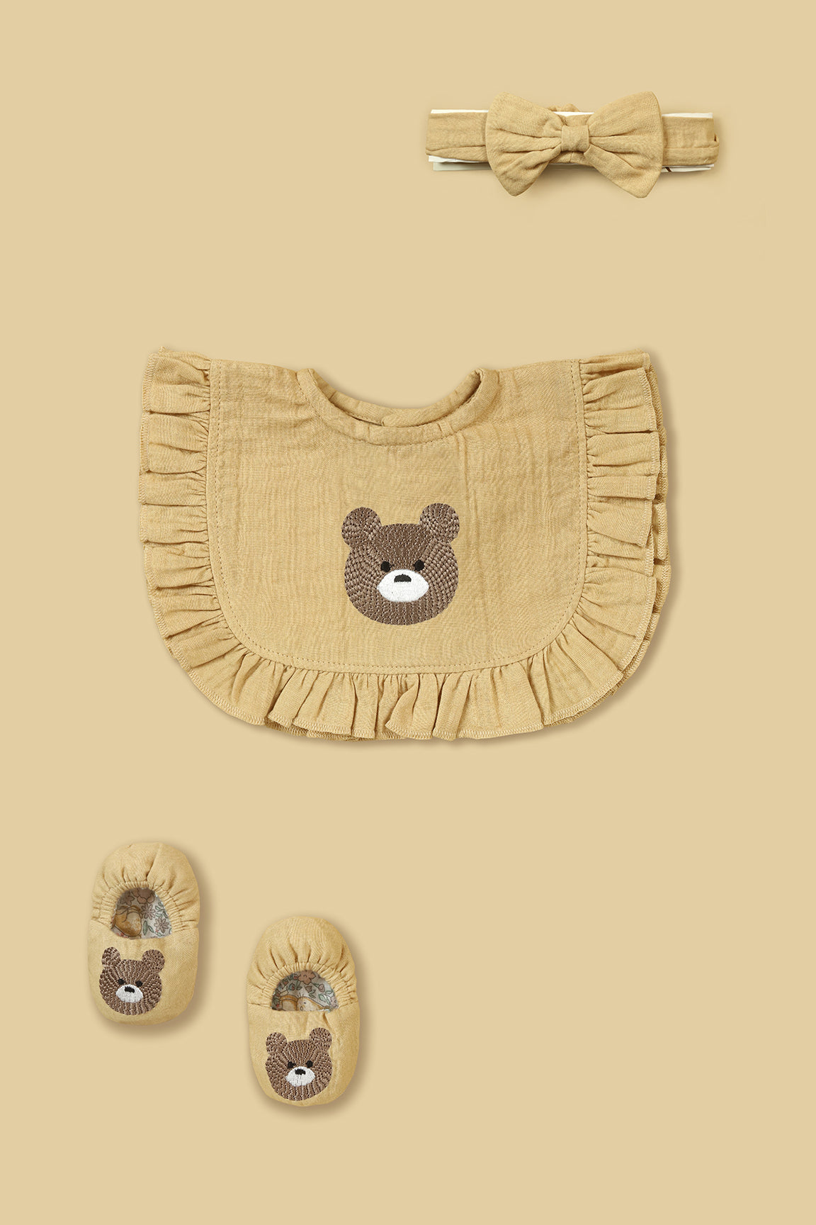 Bear Embroidered Muslin Baby Gift Set (Bow Headband, Shoes, Bib)