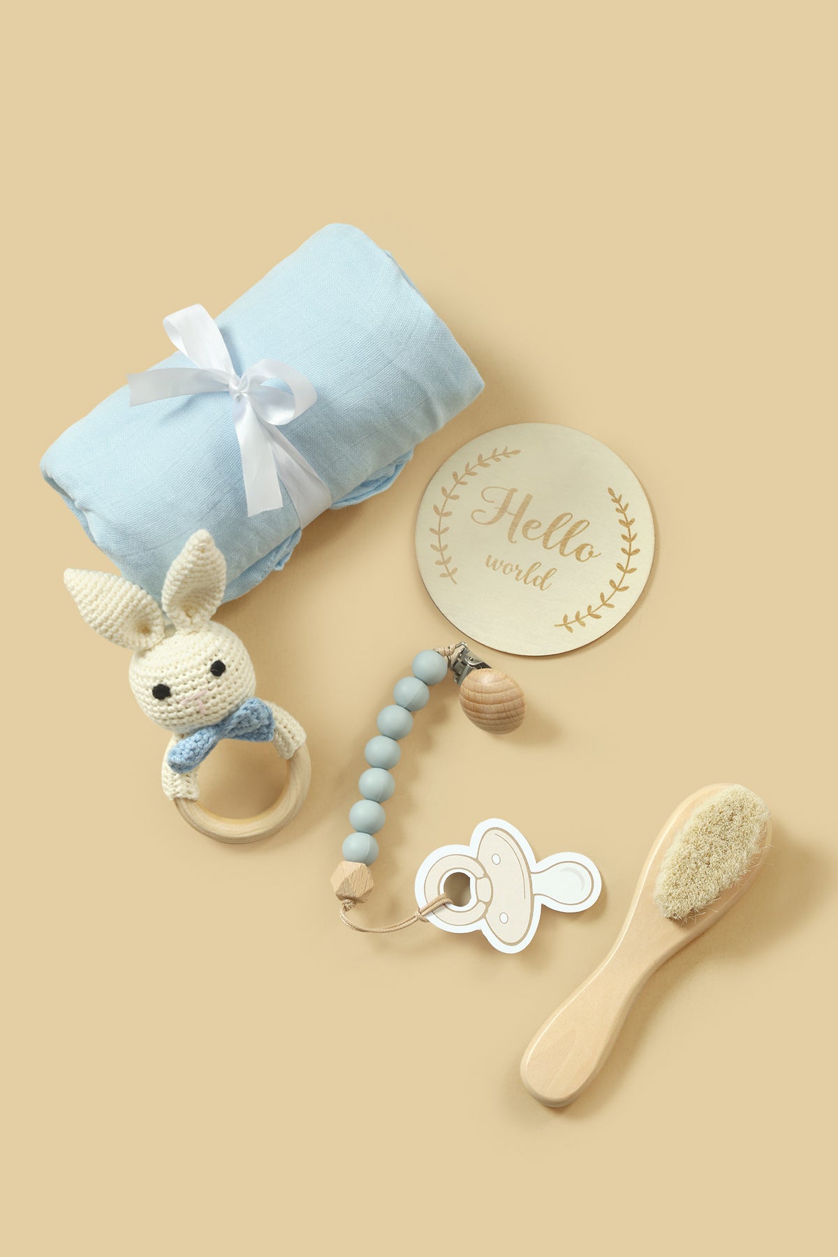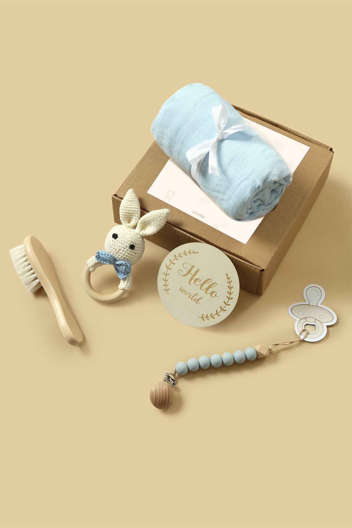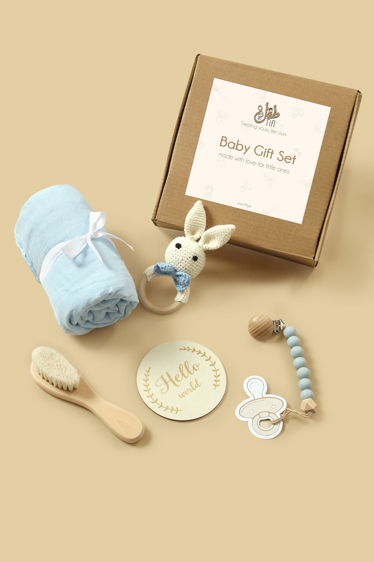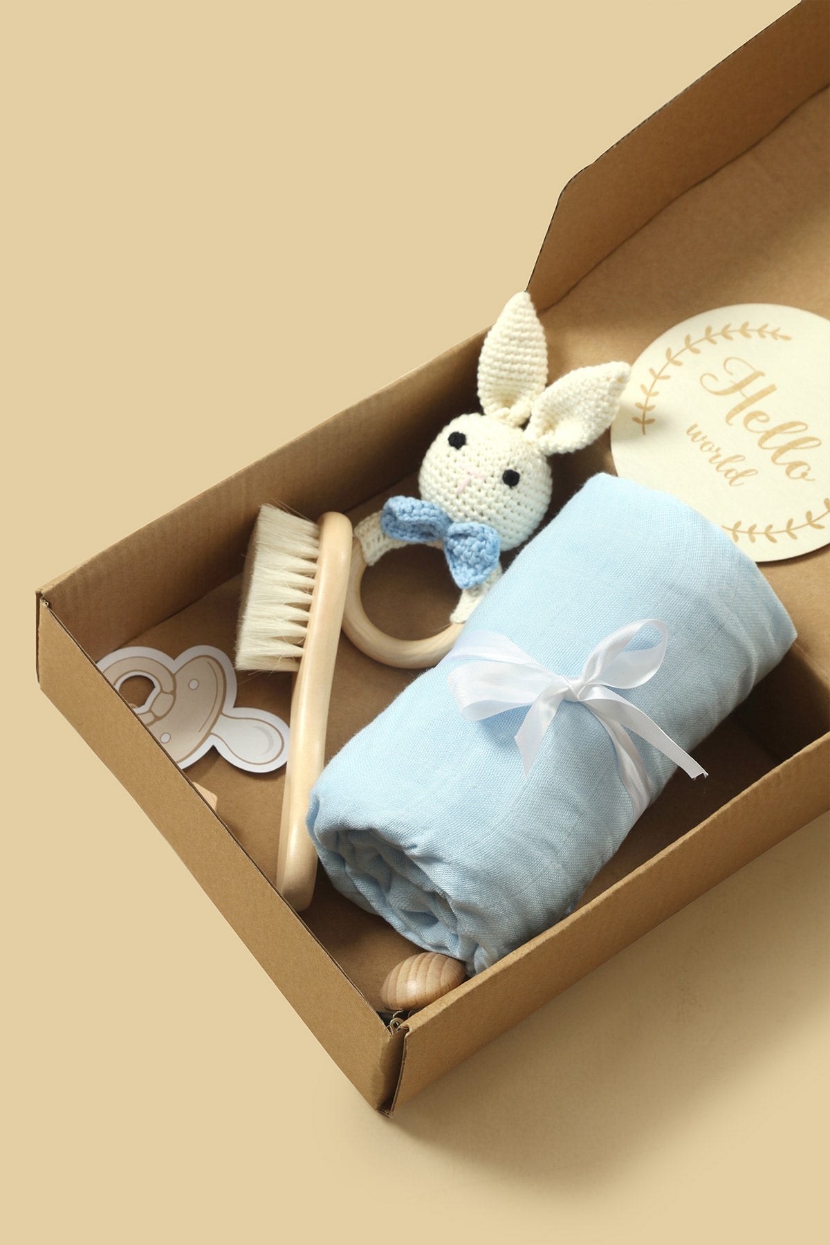 Our baby gift box is a beautifully curated set, perfect for baby showers, newborn celebrations, birthdays, gender reveals, and baby’s first special moments. Thoughtfully crafted from natural, baby-safe materials like organic beech wood, food-grade silicone, and soft cotton, each item is gentle and safe for everyday use. The set includes a muslin wrapping sheet, wooden baby hair comb, knitted rattle, pacifier holder, “Hello World” wooden milestone card, and a gift box making it a complete, ready-to-gift bundle that offers both comfort and lasting memories for your little one.