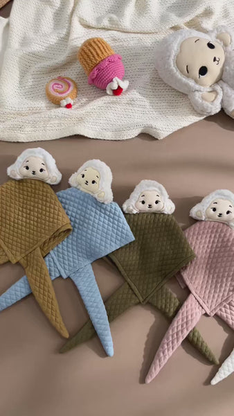 This adorable baby hankie features a soft, padded cotton jacquard fabric with a cute haml face attached for a touch of charm. A practical yet endearing accessory, it combines comfort and style for your little one.