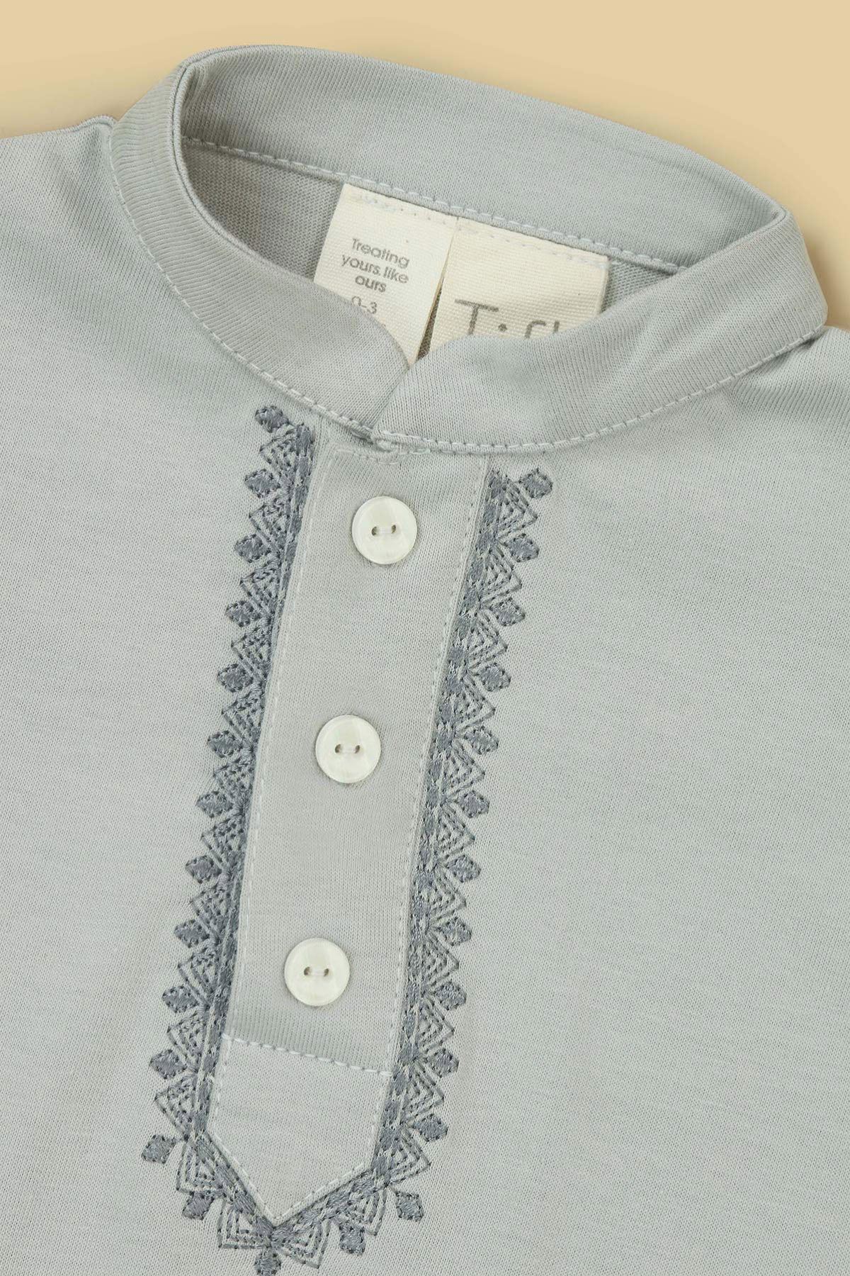 Crafted from soft knitted cotton along with our signature embroidery. featuring front placket with snap button detailing makes it perfect babies on Eid. The relaxed fit and hidden button at bottom make diaper changes quick and easy.