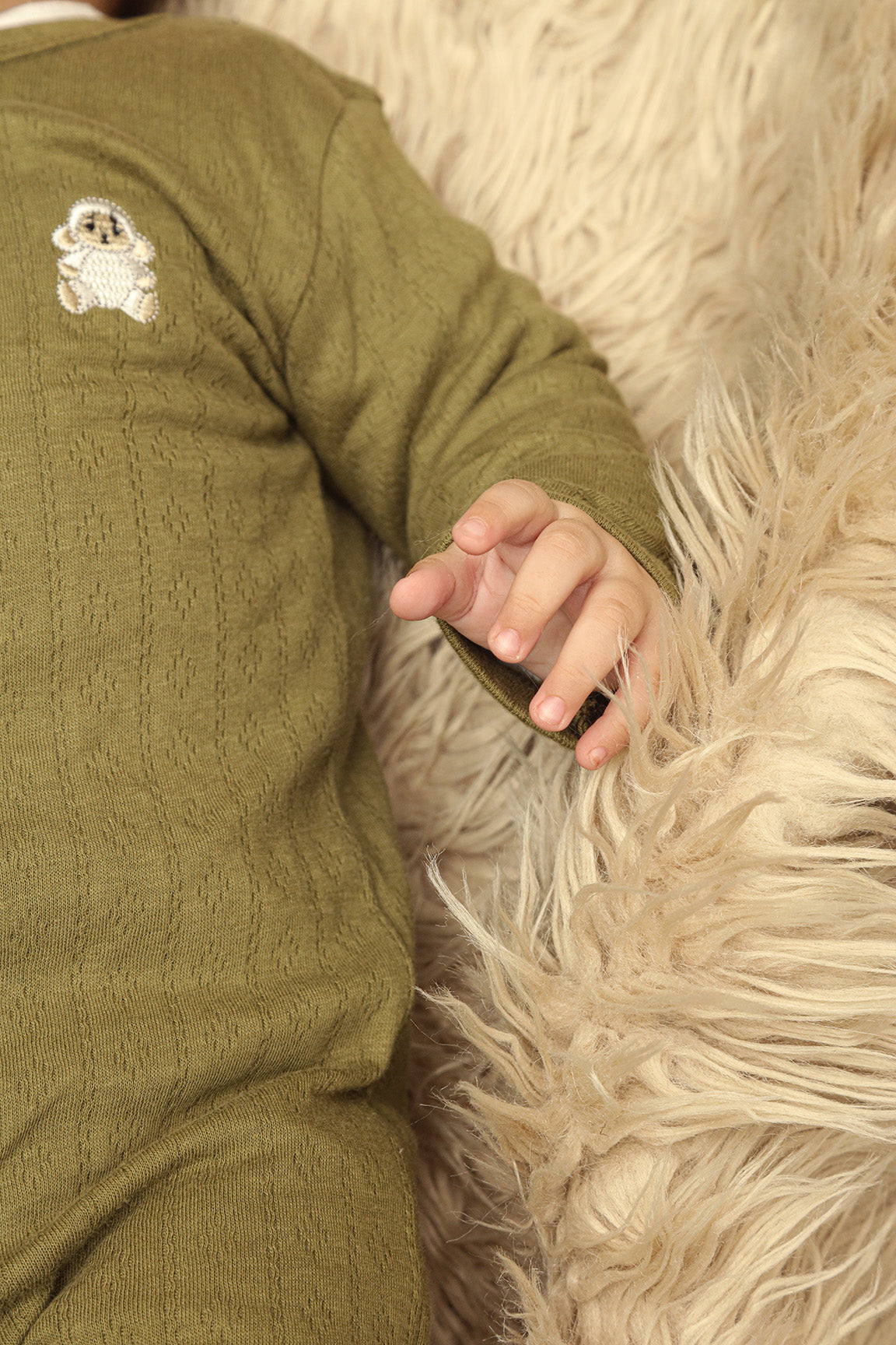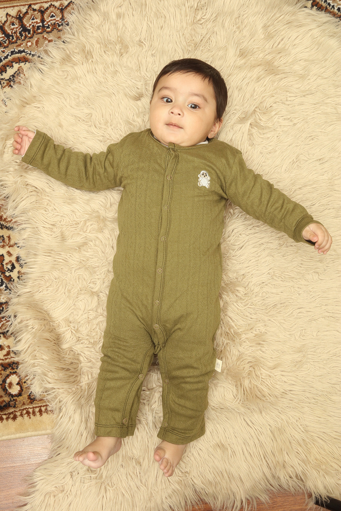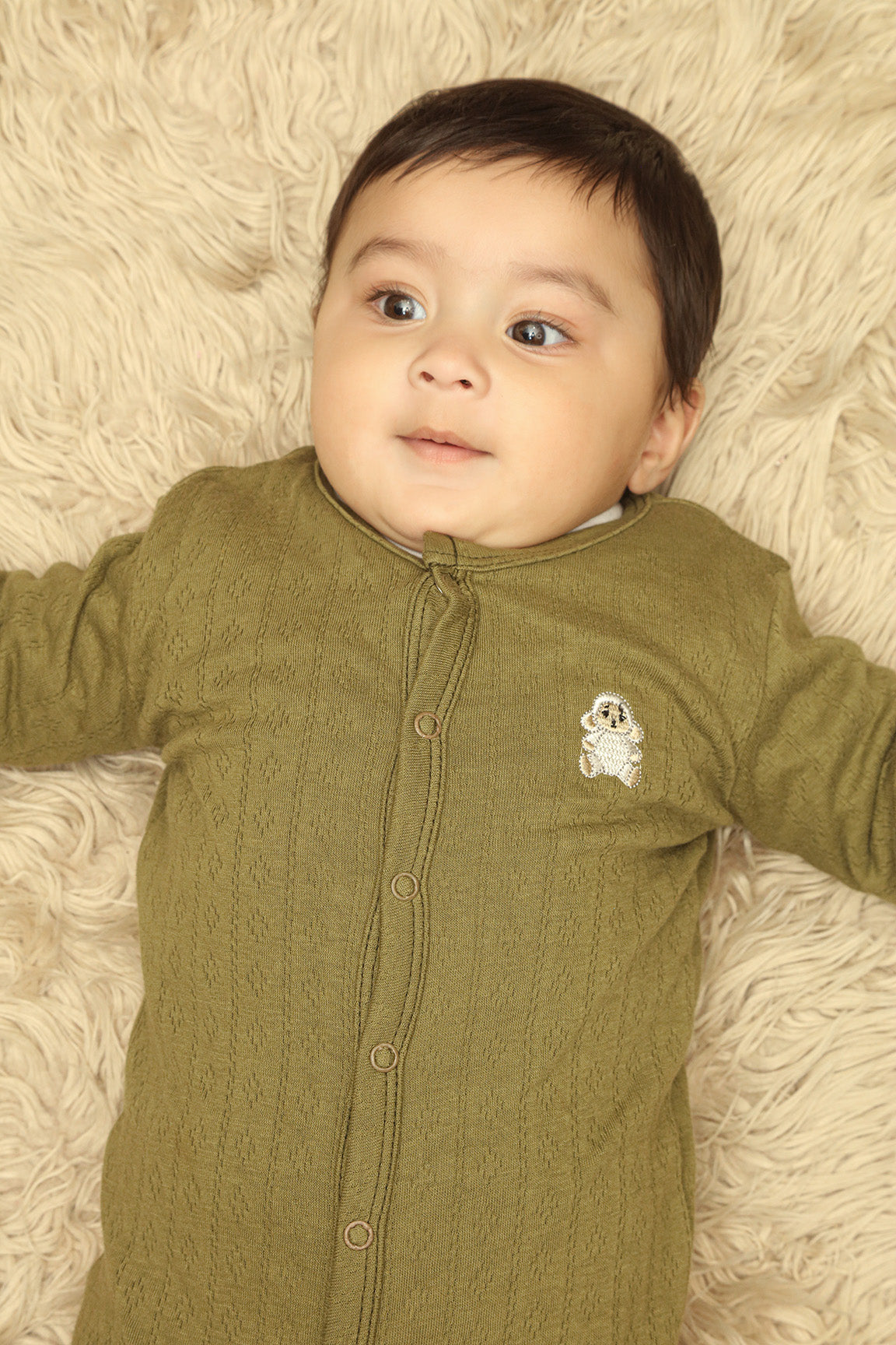 This knitted jacquard baby Rompers is made from soft, cozy fabric to keep your little one comfortable, features Sheep embroidered motif with soft mesh fusing on the back to protect baby’s skin form rashes.