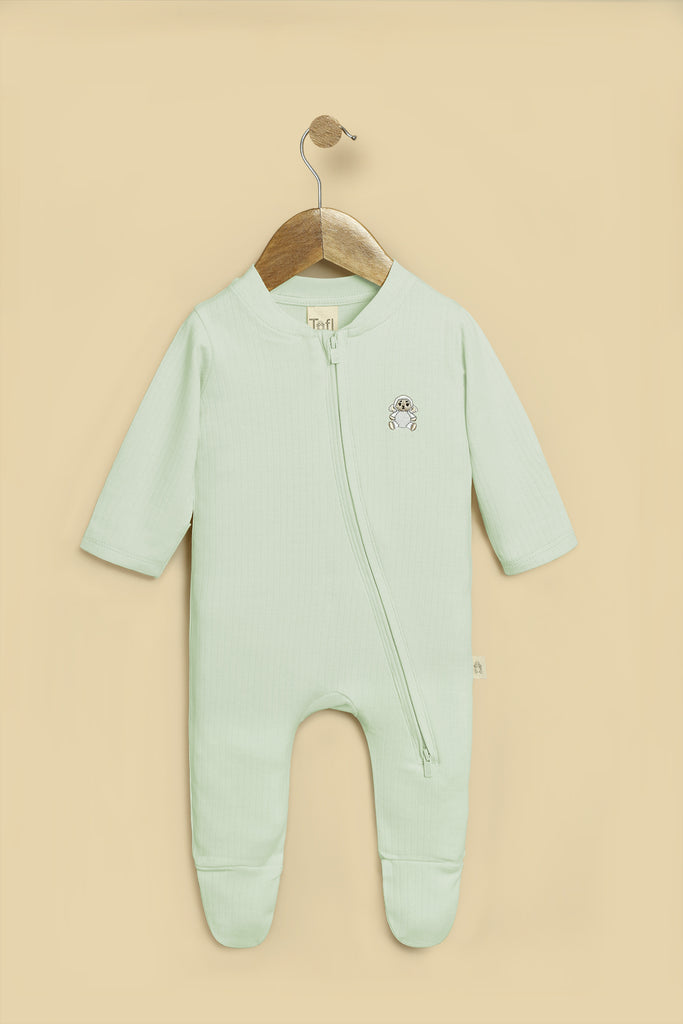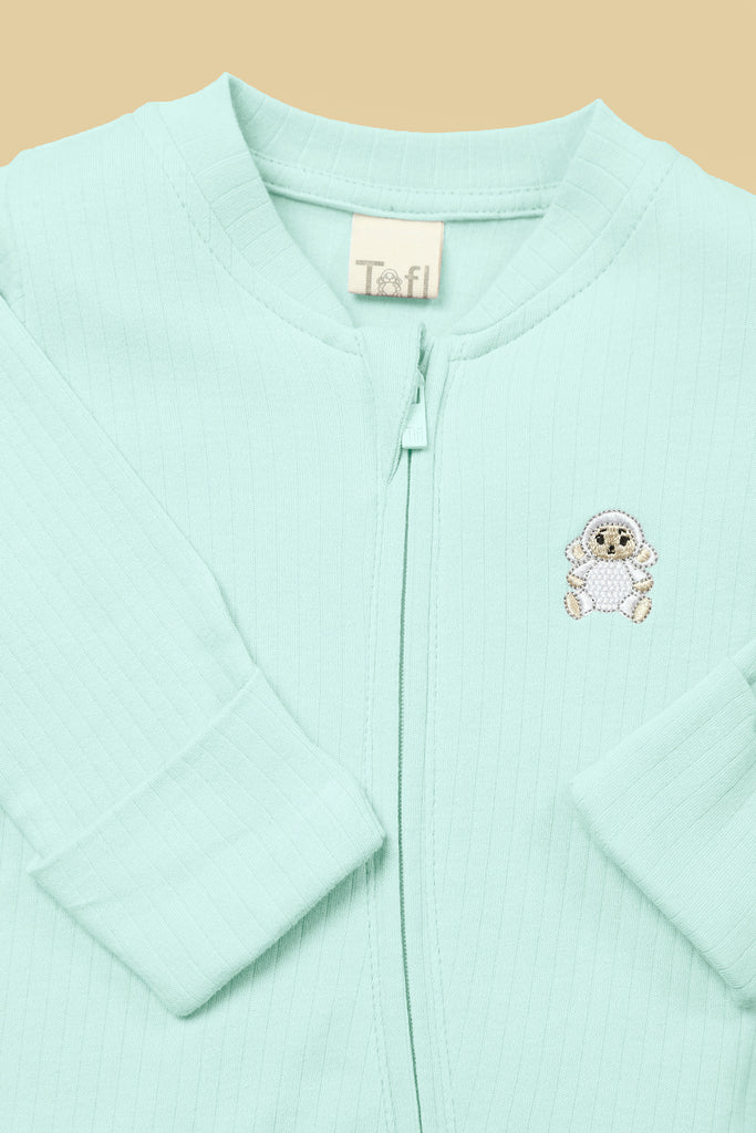 Embroidered Double Zipper Haml Baby Sleepsuit Mint