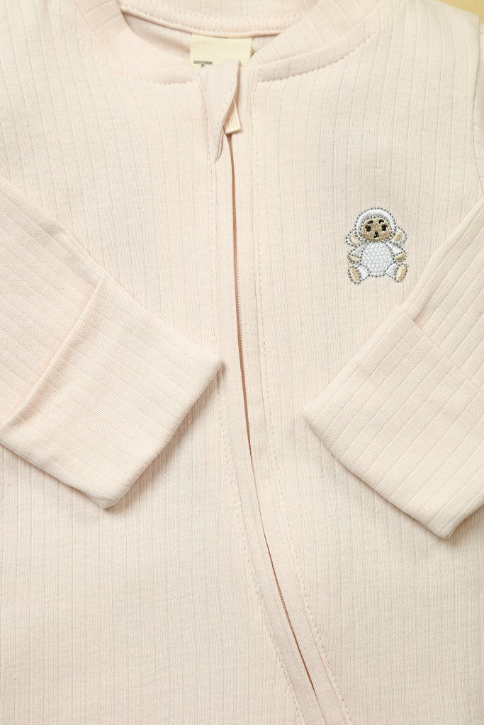 Embroidered Double Zipper Haml Baby Sleepsuit Pink