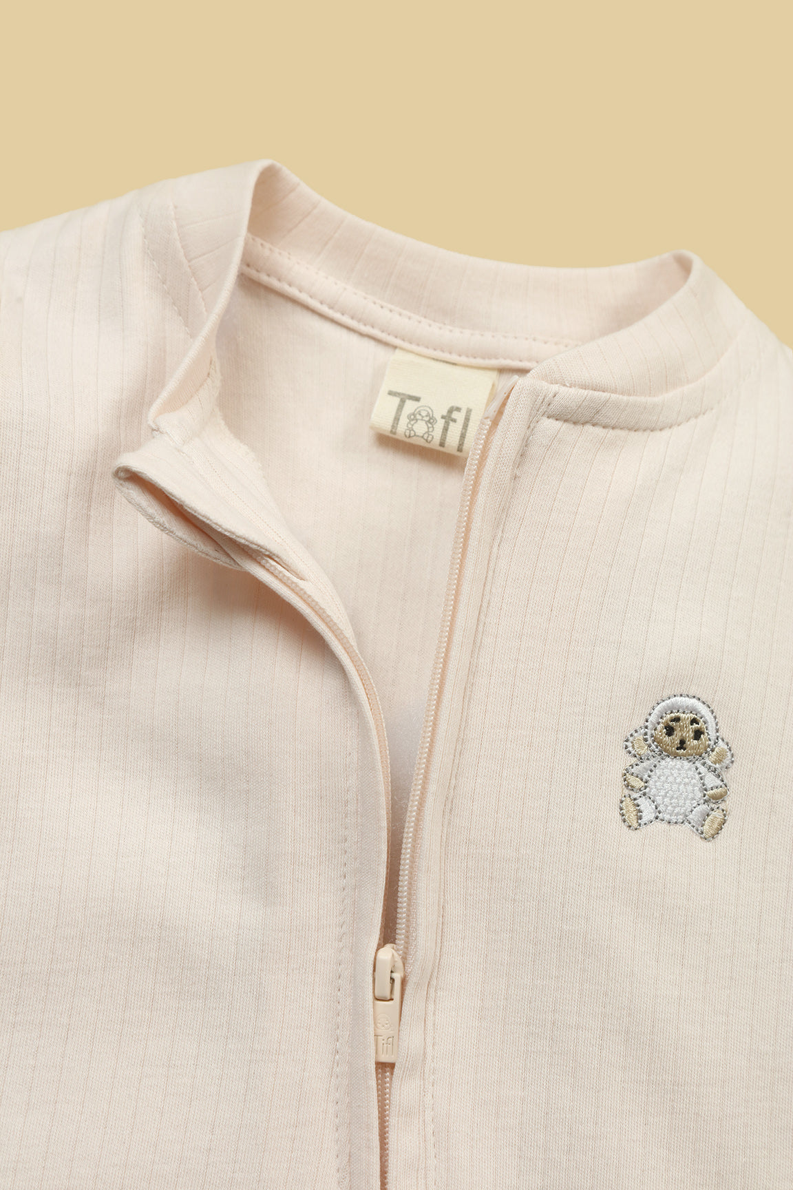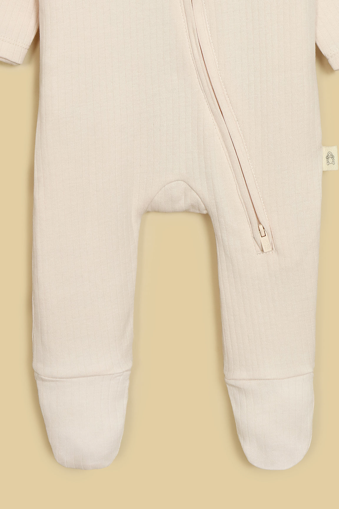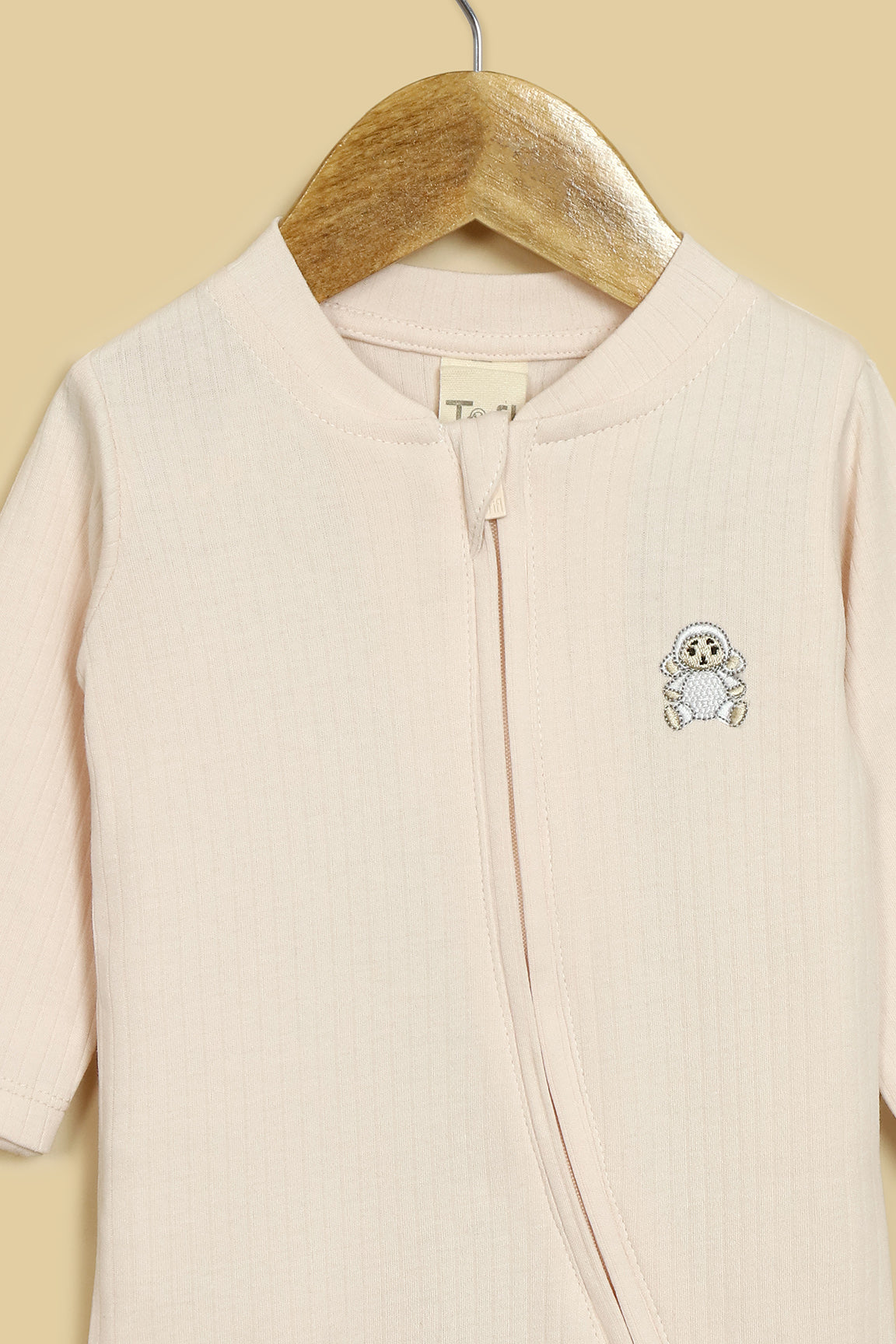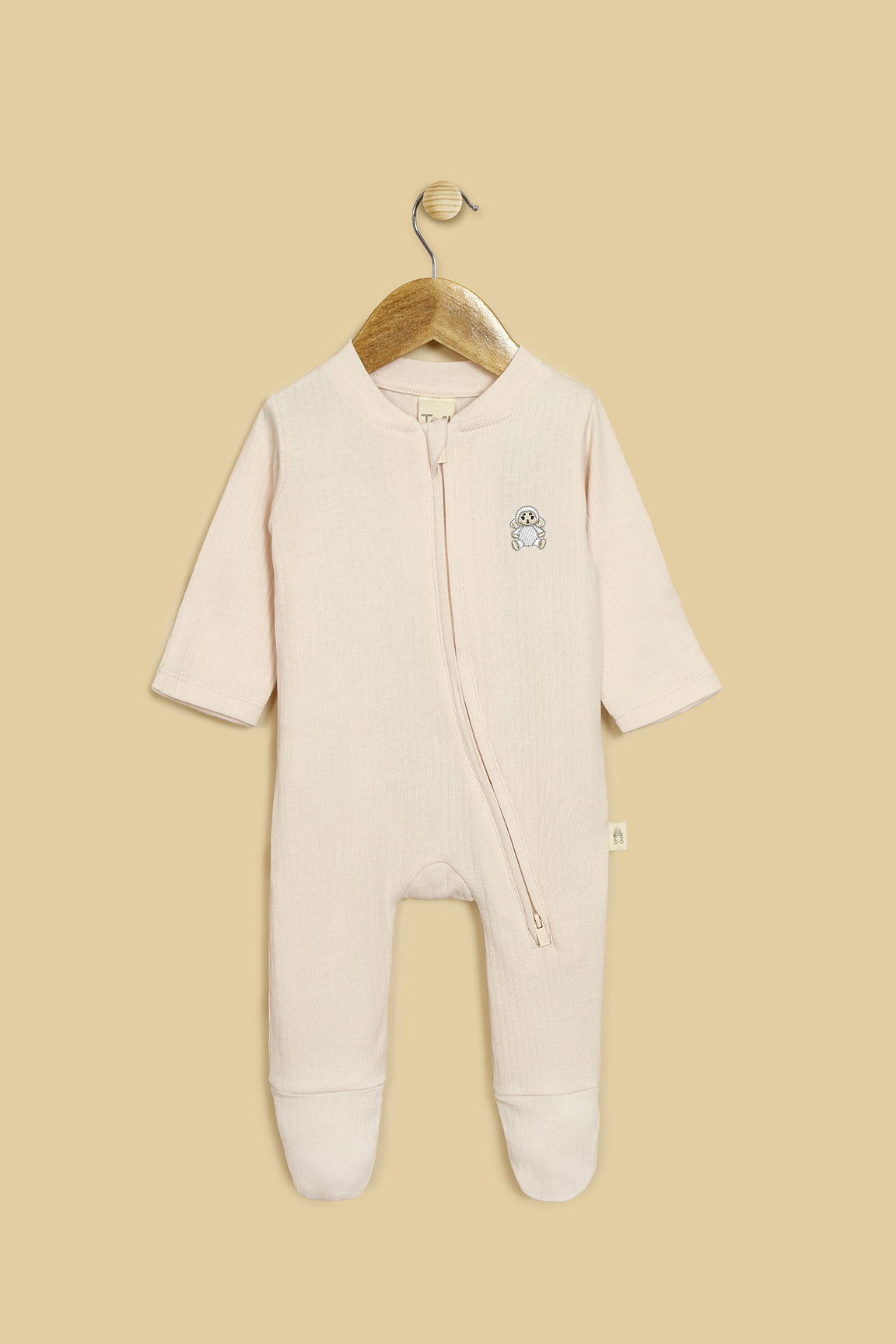 This 100% cotton rib double zipper baby sleeping suits combines comfort and convenience with its soft ribbed fabric and double zipper for easy dressing and quick diaper changes. With luxuriously embroidered Haml motif and soft mesh fusing on back to protect baby’s soft skin from rash, it ensures comfort and minimal styling throughout the day. It also has an added flap on top to protect child from the zip at closure.
