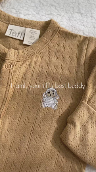 This knitted jacquard baby Rompers is made from soft, cozy fabric to keep your little one comfortable, features Sheep embroidered motif with soft mesh fusing on the back to protect baby’s skin form rashes.