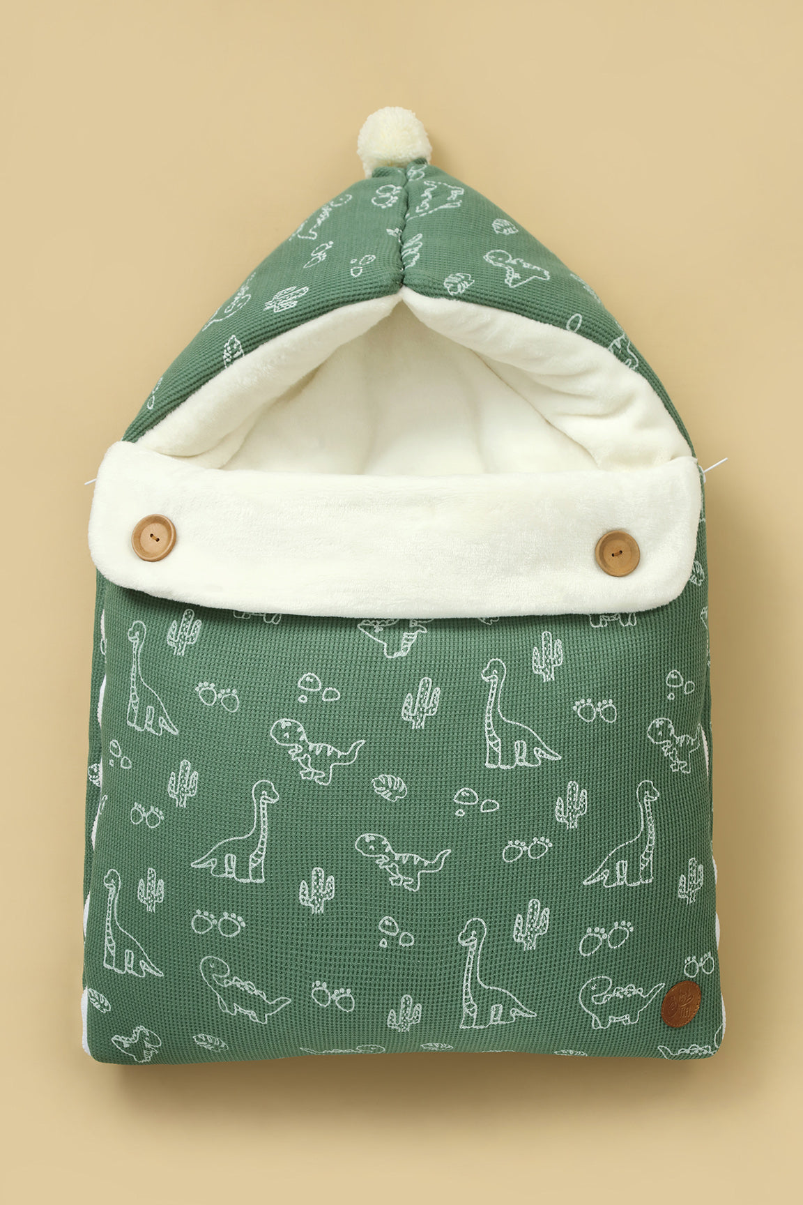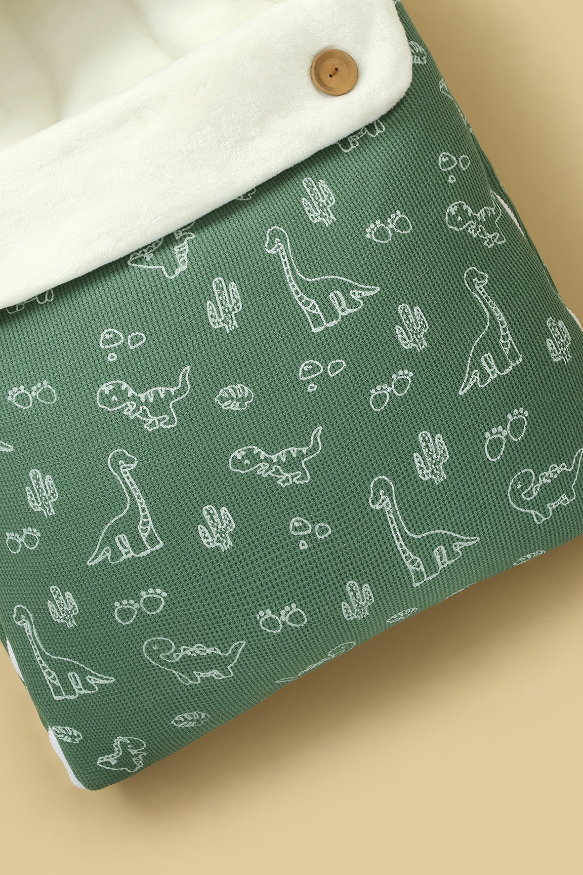 Wrap your little one in playful comfort with the Dino Snug Carry Nest. Designed with cute dinosaur prints on a soft green fabric, it offers a fun yet cozy space for your baby. The plush inner lining ensures warmth, while the button closure makes it easy to secure and carry. Perfect for snuggles, outings, or peaceful naps.