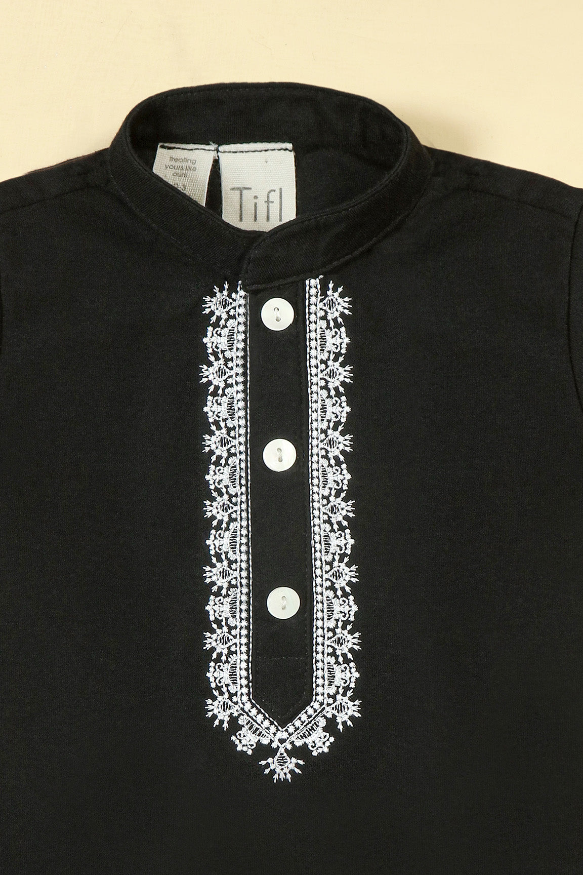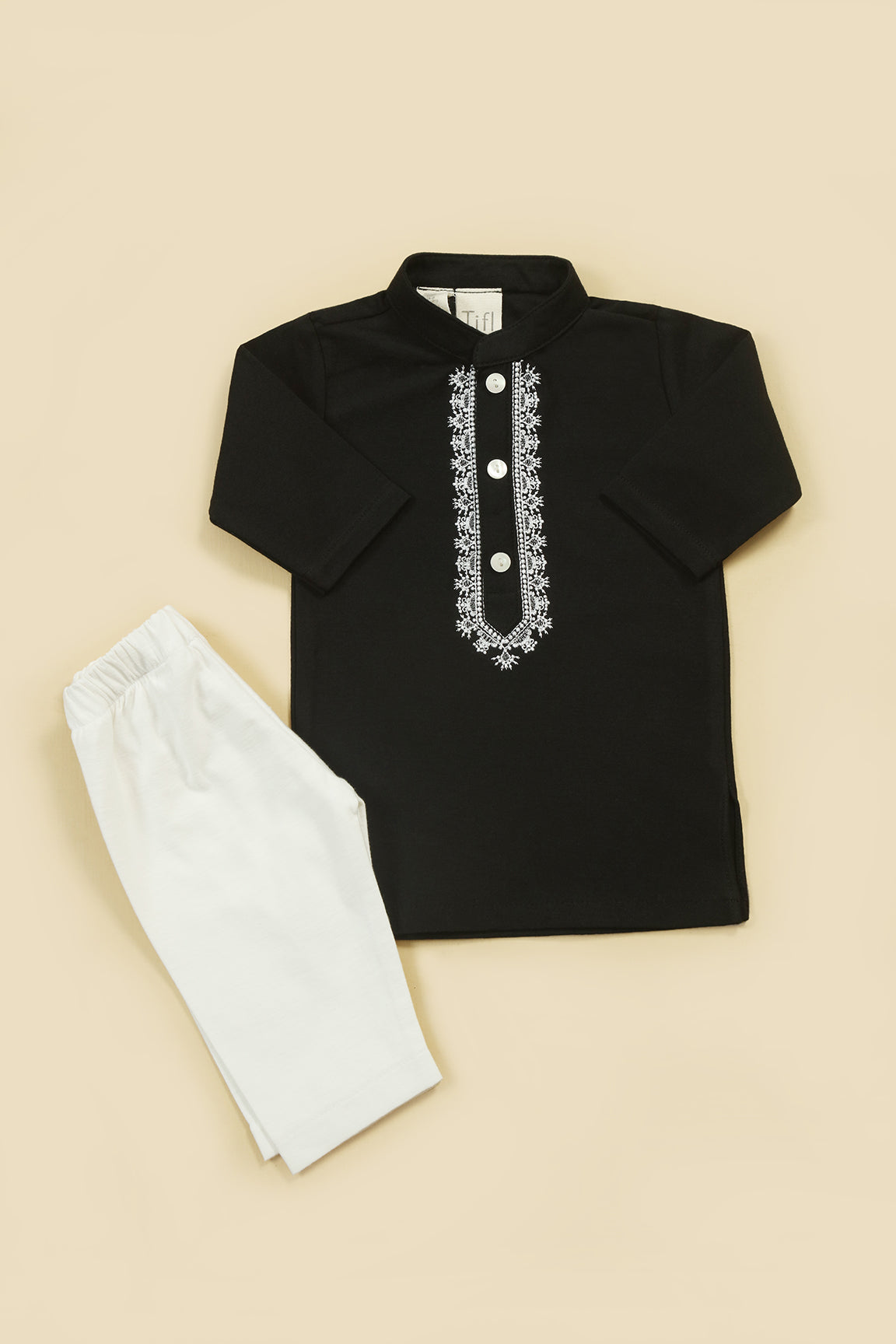 Dress your little one in our knitted timeless style with our Embroidered Jersey Kurta & Trousers Set. Thoughtfully designed for comfort and elegance, this two-piece outfit features a black embroidered kurta and white trousers .Hurry now and give your baby boys a classic look with this kurta and trousers set.